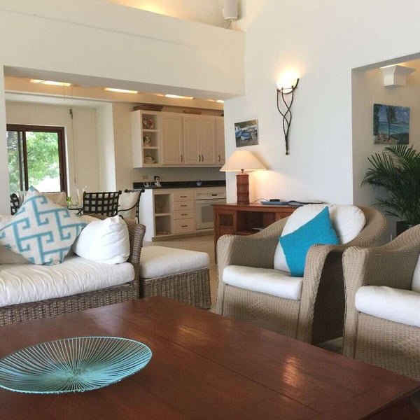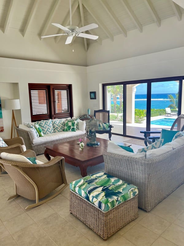 Seawinds is a beautifully designed Caribbean-style waterfront villa sitting in almost an acre of tropical gardens. Located on the seafront, it nestles behind a protective reef which forms the ecologically important Little Harbour. The sea views across the pool and beyond are astounding and extend from St Martin to St Barths and Tintamarre. Seawinds is well devised, with an open plan living room, dining area and kitchen all with screened glass sliding doors leading to the generous shaded verandas which wrap around the entire south of the property. The glass frontage provides lots of light and openness and all living areas have ceiling fans. The veranda houses a large Brown Jordan dining table and chairs for al fresco dining as well as comfortable Lloyd Loom rattan rocking chairs for relaxing and admiring the view. The room furnishings throughout are light and airy with bright colours provided by Designers Guild and Missoni pillows. The artwork is colourful and contemporary. The centrepiece of the living room is a stunning large bronze sculpture ‘Turtle Dance’ by Robert Wyland. The kitchen has granite counters and is well-equipped with new GE appliances and a dishwasher. There is everything you need to prepare simple meals or for your personal chef to cook a special dinner. There is also a gas grill under the veranda. There are two large, identical Primary Suites located on opposite sides of the main living area and are connected to the main room by the verandas – this affords considerable privacy for each bedroom. Both suites have large en-suite bathrooms with walk-in showers and marble double vanities as well as walk-in closets. In addition, a third bedroom (double or twin beds) is located off the living room with an adjoining bathroom. All bedrooms are air-conditioned with ceiling fans and are also designed with additional louvred windows for a more pleasant natural ventilation if preferred. The pool is a generous size (length 40 feet) and has large areas of surrounding deck for lounging in the Caribbean sunshine. There are 8 chaises for comfortable lounging. The large tropical gardens with paths around the property and down to the sea invite exploration. There are many areas to enjoy the fabulous views – from the hammock under the veranda, to the separate deck with the soothing Adirondack Rockers and down to the large sea deck with its huge comfortable Tropitone Sofa. The sea deck is large enough for yoga or Pilates sessions and is a favourite site for Dek Nor (Jepun Bali) to provide an afternoon massage in the breeze to the sound of breaking waves off the breakwater. Steps lead down from this deck all the way to the quiet lagoon where the slipway allows easy access for snorkelling or swimming in the calm waters protected by the reef. Turtles abound in the turquoise waters and the astounding bird life in this area includes Ospreys, Pelicans, Kingfishers, Green Herons and Whimbrel. The villa is located very centrally, on the southern coastline, just off the Jeremiah Gumbs Highway. It is a 5-minute drive from both the ferry at Blowing Point and the Airport. Seawinds Villa is walled and has remote-controlled gates. This area of Little Harbour is quiet and private, and the shore is lined with some of the most prestigious properties on the island.