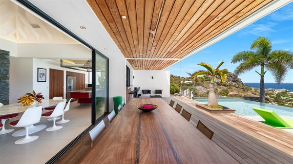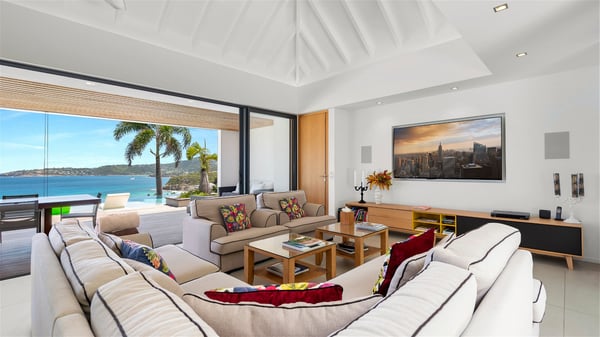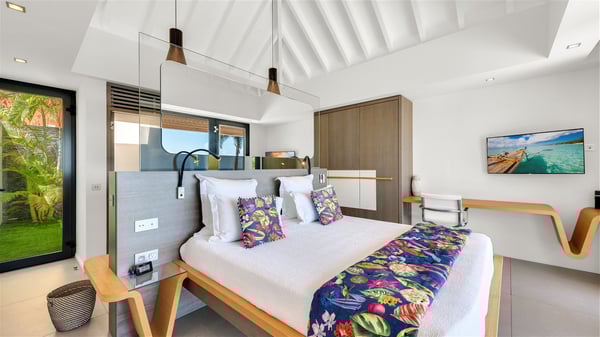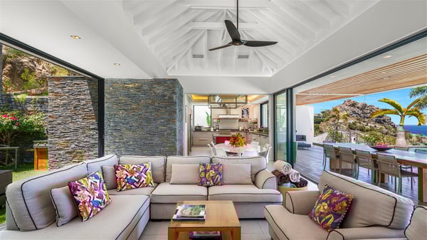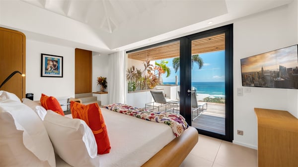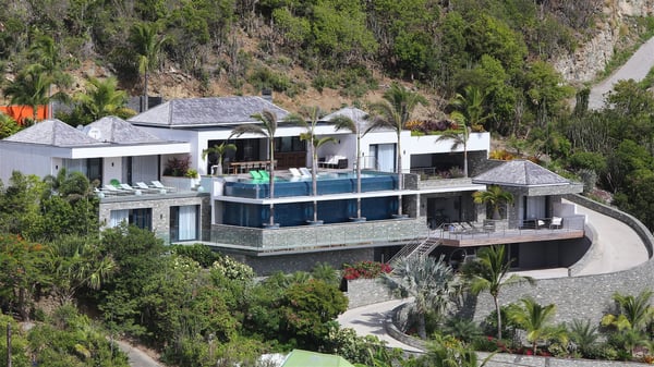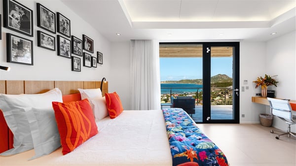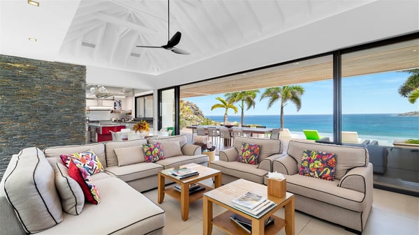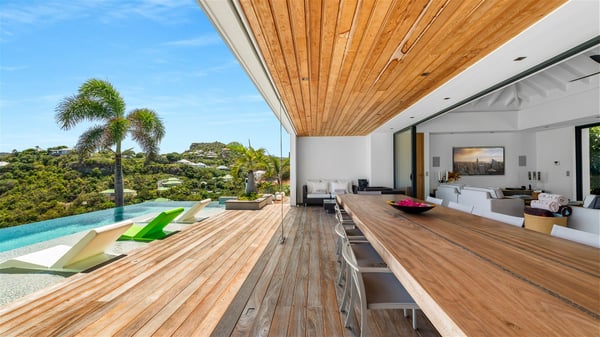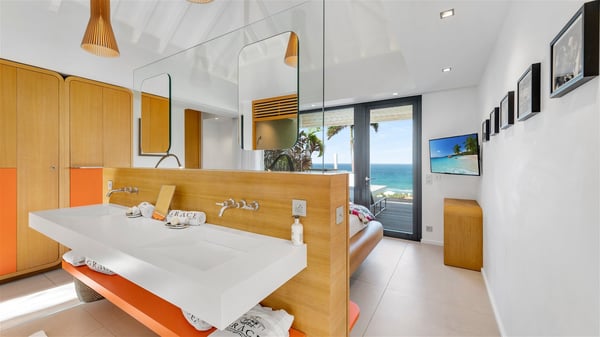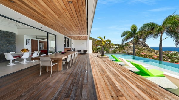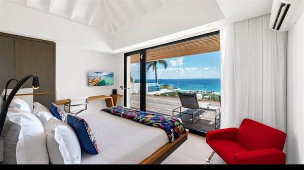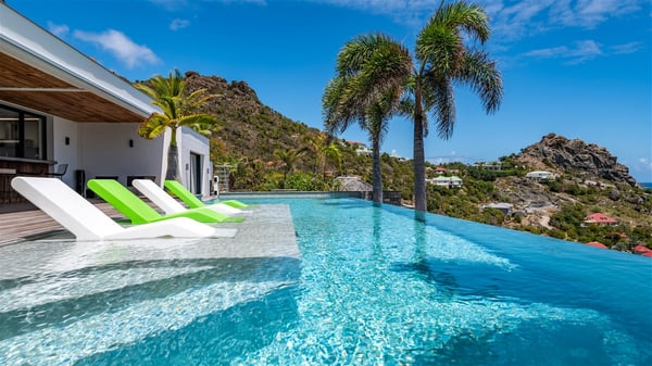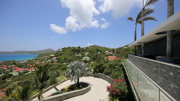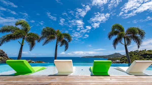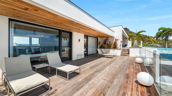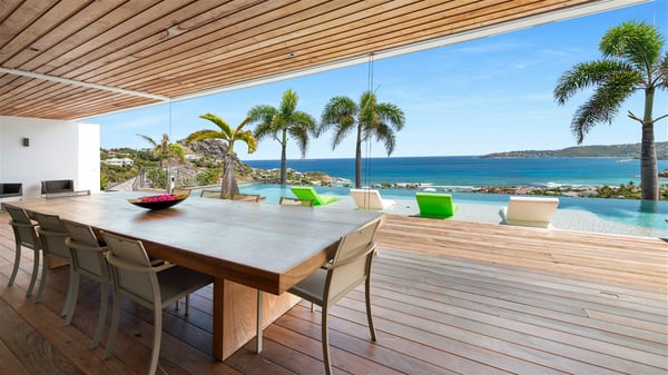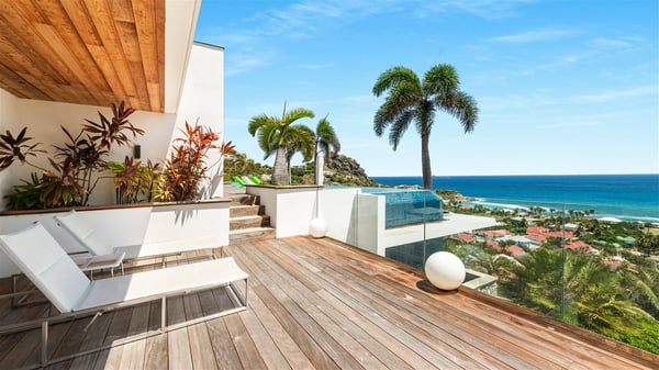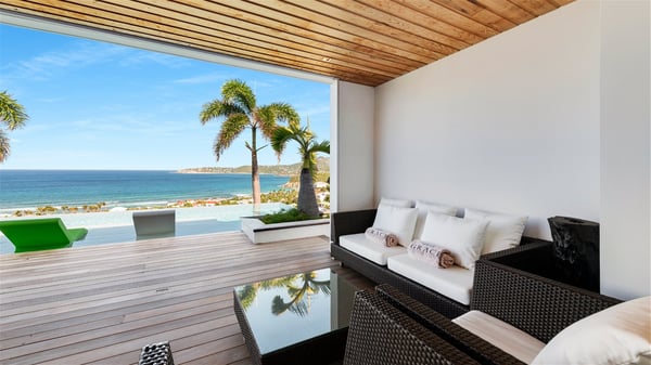 Located on the heights of Anse des Cayes, the prestigious villa Grace is an architectural jewel set on a hillside in the heart of Caribbean nature. With breathtaking ocean views and upscale amenities, this six-bedroom house with a heated pool is a very private place for an exclusive stay with family or friends in St-Barth. Built over two levels in front of the ocean, the vacation rental villa Grace in St-Barth welcomes guests in large spaces with woody beige hints, as well as fine orange and subtle touches of royal blue. The living room opens onto the front terrace, as well as onto a second shaded terrace at the back, decorated with a fountain and a comfy lounge. The indoor living room is furnished with elegant sofas, close to the dining room and, in its extension, the large kitchen with bar and stools on the terrace. A second dining room and another lounge are also available under the covered part of the terrace, seeming to be both inside and outside, a perfect place where the trade winds gently blow in an idyllic scenery. At the front, the terrace shows the breathtakingly beautiful ocean view. The heated infinity swimming pool sparkles as the turquoise waters of St. Barth. You’ll love the loungers set up in a shallow part of the pool, a perfect place to enjoy the refined beauty of Villa Grace. Tall palm trees are planted around the pool, making the horizon even more beautiful with their chiselled shapes, while the sky reveals the glow of the island's sun. The vacation rental villa Grace consists of six air-conditioned bedrooms with ocean views and access to terraces. Three of them are on the main level, while the other three ones are on the lower one. All bedrooms feature en-suite bathrooms, one with an outdoor shower, and are furnished with queen or twin beds. The decor is most refined, with black-and-white pictures and soft fabrics with shimmering colours as in the living room. On this lower level, there is also a fully equipped fitness room with ocean views. Ideally located in Anse des Cayes, Villa Grace is a true haven of beauty, in a vegetal setting between sky and sea, the perfect place for an unforgettable stay in the Caribbean.