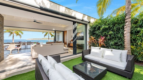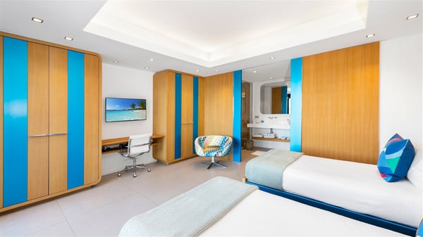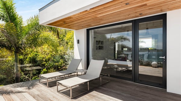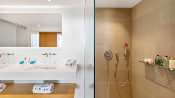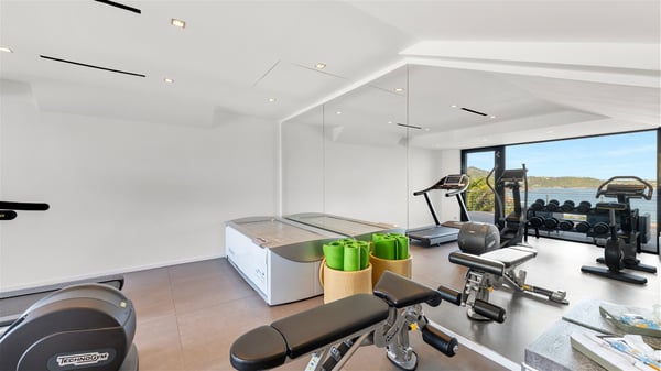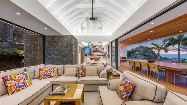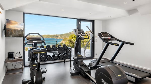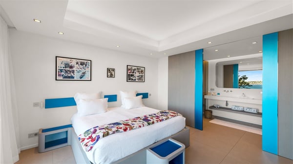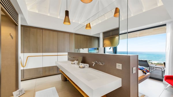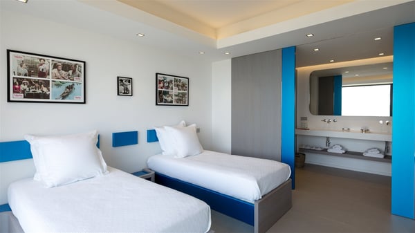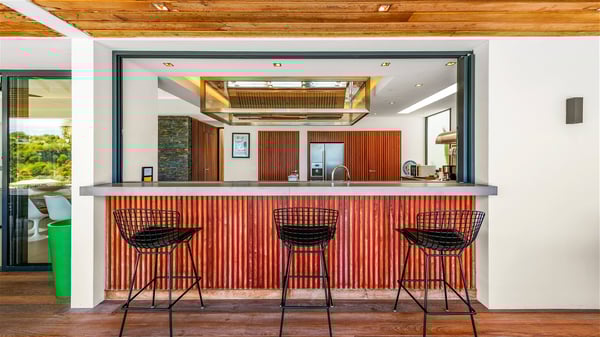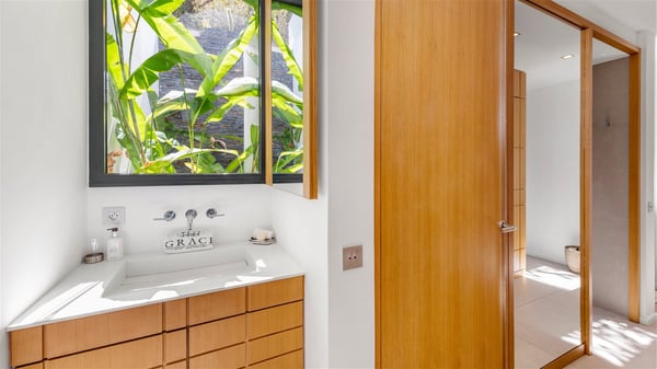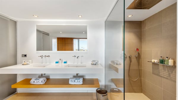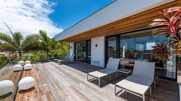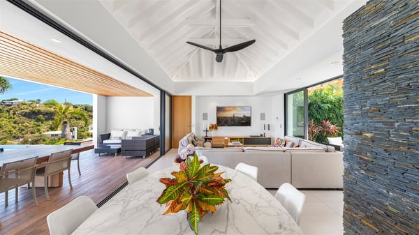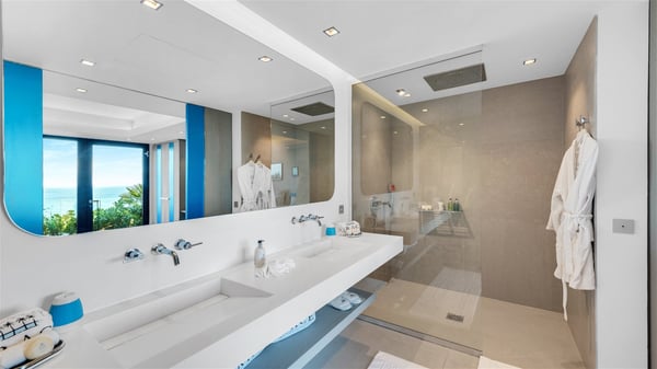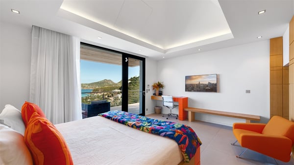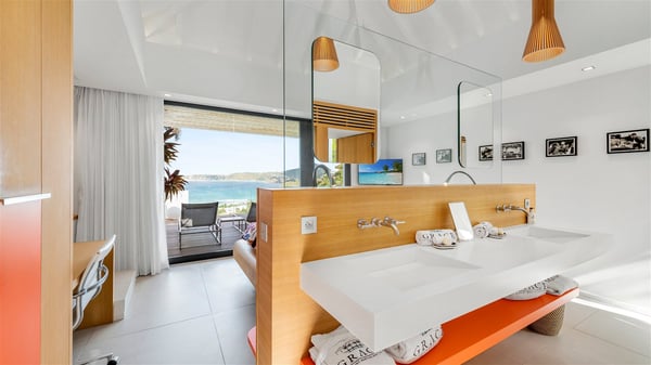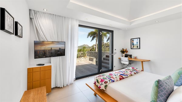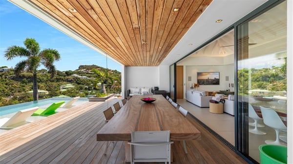 Located on the heights of Anse des Cayes, the prestigious villa Grace is an architectural jewel set on a hillside in the heart of Caribbean nature. With breathtaking ocean views and upscale amenities, this six-bedroom house with a heated pool is a very private place for an exclusive stay with family or friends in St-Barth. Built over two levels in front of the ocean, the vacation rental villa Grace in St-Barth welcomes guests in large spaces with woody beige hints, as well as fine orange and subtle touches of royal blue. The living room opens onto the front terrace, as well as onto a second shaded terrace at the back, decorated with a fountain and a comfy lounge. The indoor living room is furnished with elegant sofas, close to the dining room and, in its extension, the large kitchen with bar and stools on the terrace. A second dining room and another lounge are also available under the covered part of the terrace, seeming to be both inside and outside, a perfect place where the trade winds gently blow in an idyllic scenery. At the front, the terrace shows the breathtakingly beautiful ocean view. The heated infinity swimming pool sparkles as the turquoise waters of St. Barth. You’ll love the loungers set up in a shallow part of the pool, a perfect place to enjoy the refined beauty of Villa Grace. Tall palm trees are planted around the pool, making the horizon even more beautiful with their chiselled shapes, while the sky reveals the glow of the island's sun. The vacation rental villa Grace consists of six air-conditioned bedrooms with ocean views and access to terraces. Three of them are on the main level, while the other three ones are on the lower one. All bedrooms feature en-suite bathrooms, one with an outdoor shower, and are furnished with queen or twin beds. The decor is most refined, with black-and-white pictures and soft fabrics with shimmering colours as in the living room. On this lower level, there is also a fully equipped fitness room with ocean views. Ideally located in Anse des Cayes, Villa Grace is a true haven of beauty, in a vegetal setting between sky and sea, the perfect place for an unforgettable stay in the Caribbean.
