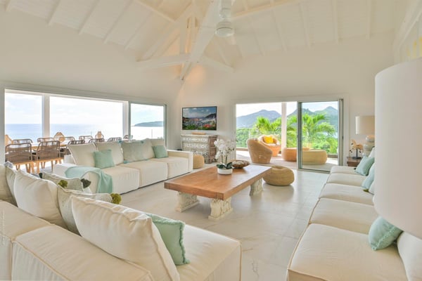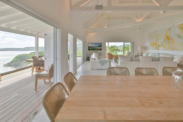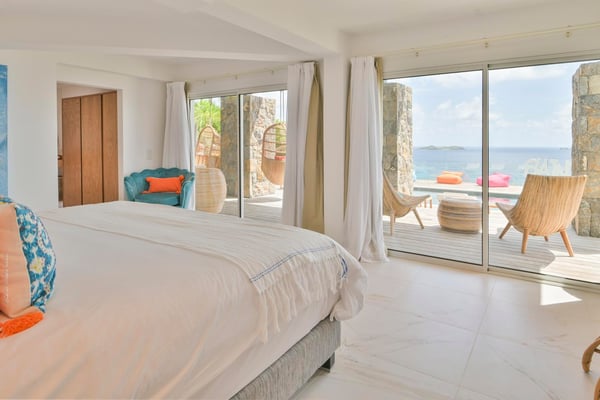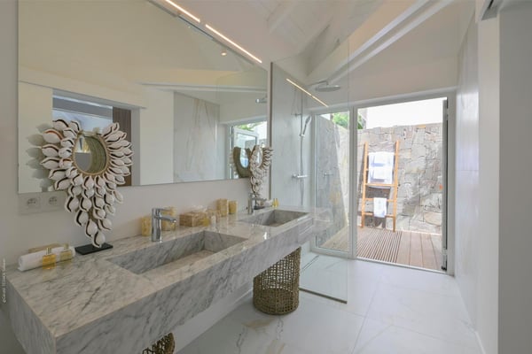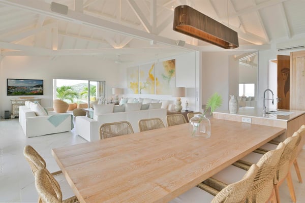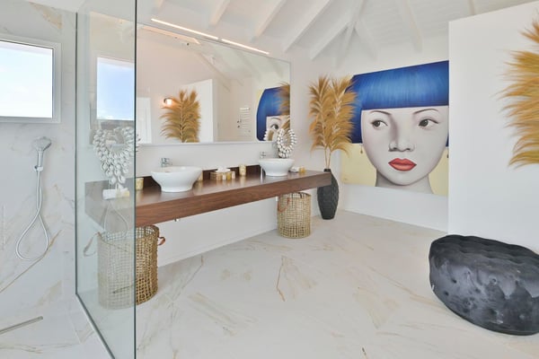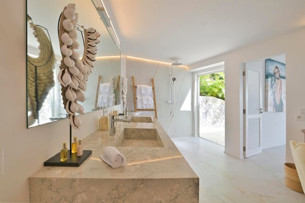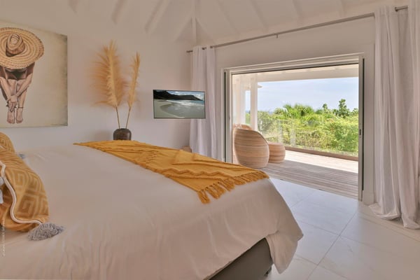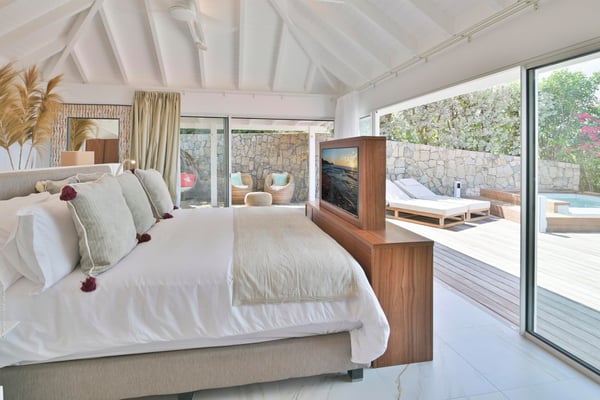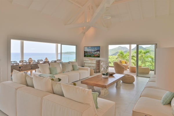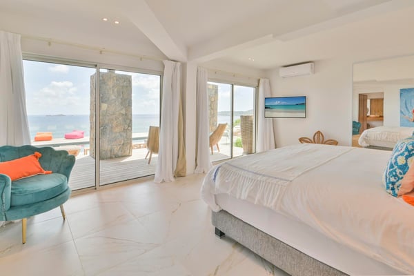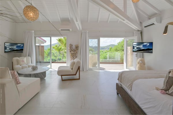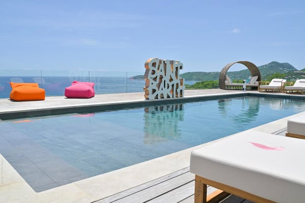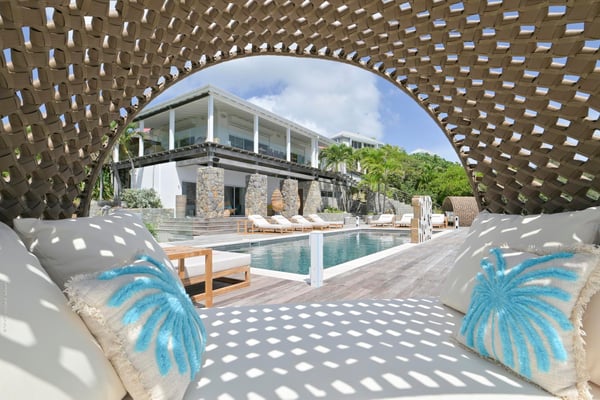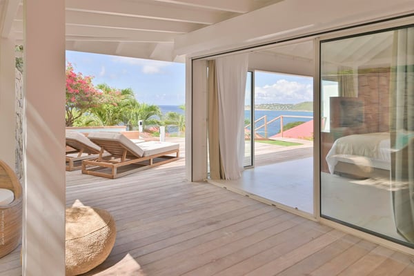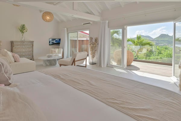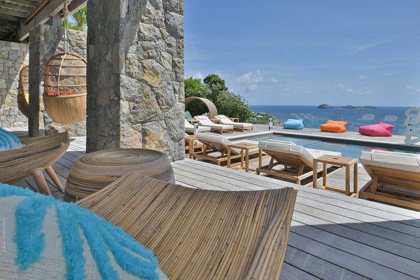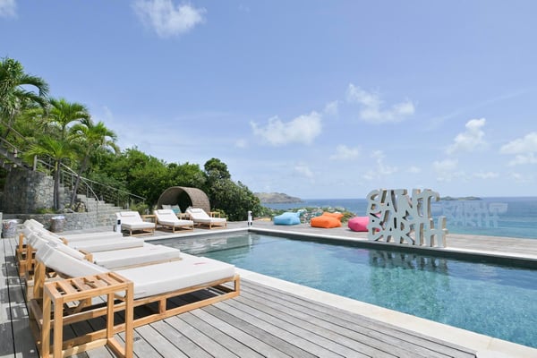 Villa Coeur de Pirate is a luxurious six-bedroom property located in Anse des Cayes, facing breathtaking ocean views. Spacious and luxurious, Villa Coeur de Pirate is designed with ultra-chic decor and features upscale amenities. Accommodating up to twelve guests in a paradisiacal environment, the villa features a swimming pool, a jacuzzi, a fitness room, and a massage area, making it the perfect place for a unique stay in St-Barts. Built over several levels and buildings connected by stairways, Villa Coeur de Pirate offers a luxurious property with over 180° panoramic views over the bays of Anse des Cayes and Saint-Jean. Overlooking crystal-clear blue waters, this villa rental in St-Barts welcomes you in its marvellous living room. The lounge is furnished with white sofas with lagoon-blue coloured cushions, facing the bay window with ocean views. The semi-professional kitchen can accommodate a private chef if you wish to organize a dinner. Extending from the central island, you’ll find a dining table for ten under the vaulted ceiling, by the al fresco dining area under the terrace in a decor of blond woven and palm trees, facing the stunning view. At the front, the covered terrace offers bright spaces with an amazing view over the bays. On the side, a sumptuous staircase leads to the lower level terrace with a heated pool bordered by sun loungers and colourful benches, for relaxing sessions in a private atmosphere. From there, you can reach the belvedere from where you’ll marvel at the stunning spectacle of the sparkling ocean, comfortably seated on sun loungers. A staircase will also lead you down to the beach located just below, in the beautiful Caribbean. Villa Coeur de Pirate consists of six air-conditioned bedrooms with superb sea views, king-size beds, en-suite bathrooms with marble double sinks, and spacious terraces spread over the property. Two bedrooms are on the main level near the living room; bedrooms 3 and 4 are in independent bungalows accessible via exterior stairs near the main building; bedroom 5 is on the lower level near the pool, also accessible via an exterior stairway, and bedroom 6 is in a bungalow with a private terrace and a jacuzzi. You’ll find private lounges, walk-in closets, furnished terraces, and additional outdoor showers in four bedrooms: a true haven of peace for relaxing sessions in utmost luxury. A fitness room is located at the back of the main building, and a massage area with heated tables is available close to bedroom 5 on the lower level. Two parking spaces are also available during your stay. In a beautiful environment with exceptional views over the bays of St-Jean and Anse des Cayes, Villa Coeur de Pirate is the perfect place for a unique stay for twelve in St-Barts.