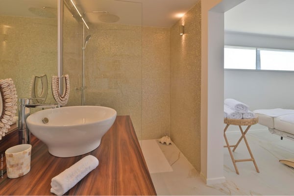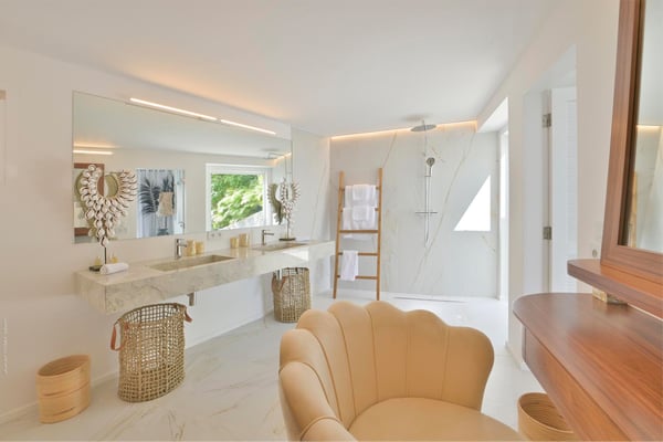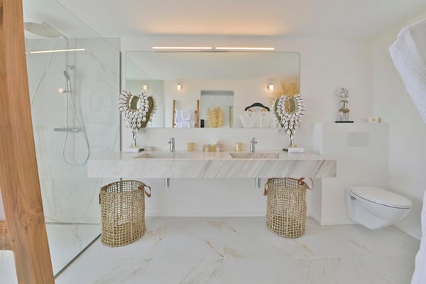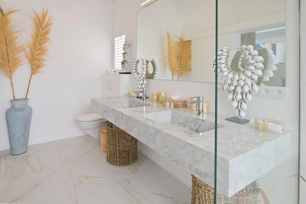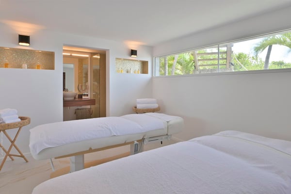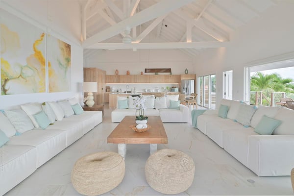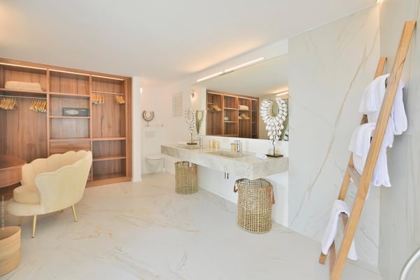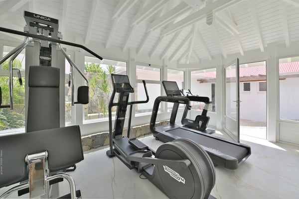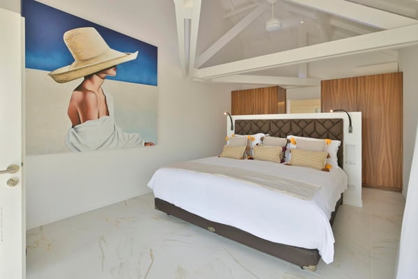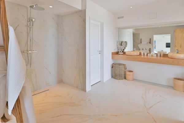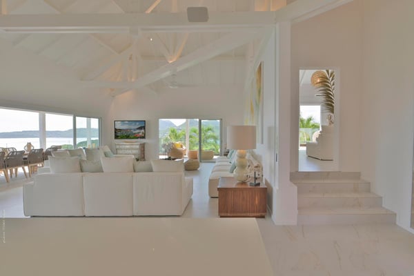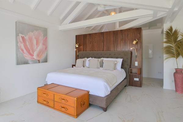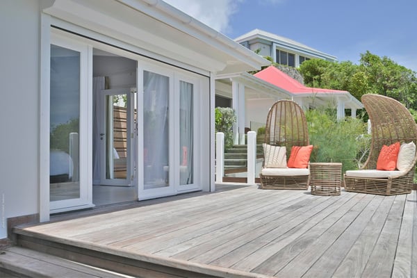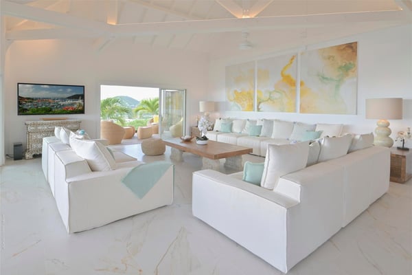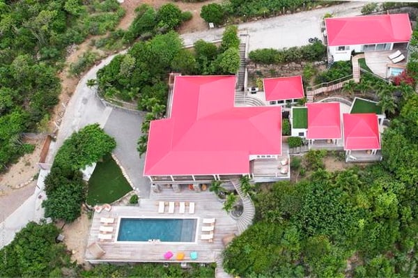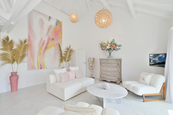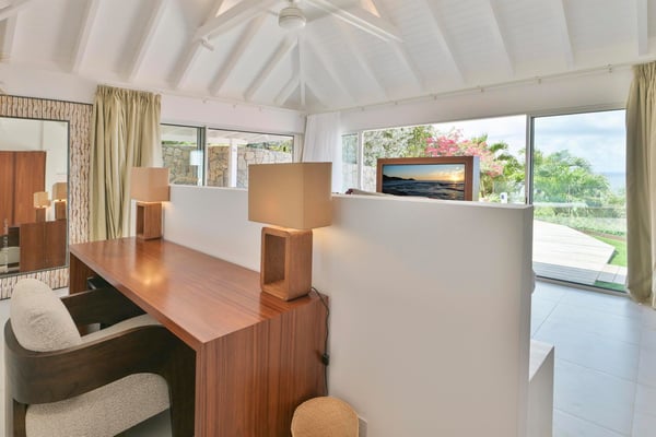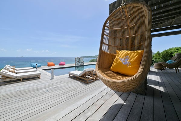 Villa Coeur de Pirate is a luxurious six-bedroom property located in Anse des Cayes, facing breathtaking ocean views. Spacious and luxurious, Villa Coeur de Pirate is designed with ultra-chic decor and features upscale amenities. Accommodating up to twelve guests in a paradisiacal environment, the villa features a swimming pool, a jacuzzi, a fitness room, and a massage area, making it the perfect place for a unique stay in St-Barts. Built over several levels and buildings connected by stairways, Villa Coeur de Pirate offers a luxurious property with over 180° panoramic views over the bays of Anse des Cayes and Saint-Jean. Overlooking crystal-clear blue waters, this villa rental in St-Barts welcomes you in its marvellous living room. The lounge is furnished with white sofas with lagoon-blue coloured cushions, facing the bay window with ocean views. The semi-professional kitchen can accommodate a private chef if you wish to organize a dinner. Extending from the central island, you’ll find a dining table for ten under the vaulted ceiling, by the al fresco dining area under the terrace in a decor of blond woven and palm trees, facing the stunning view. At the front, the covered terrace offers bright spaces with an amazing view over the bays. On the side, a sumptuous staircase leads to the lower level terrace with a heated pool bordered by sun loungers and colourful benches, for relaxing sessions in a private atmosphere. From there, you can reach the belvedere from where you’ll marvel at the stunning spectacle of the sparkling ocean, comfortably seated on sun loungers. A staircase will also lead you down to the beach located just below, in the beautiful Caribbean. Villa Coeur de Pirate consists of six air-conditioned bedrooms with superb sea views, king-size beds, en-suite bathrooms with marble double sinks, and spacious terraces spread over the property. Two bedrooms are on the main level near the living room; bedrooms 3 and 4 are in independent bungalows accessible via exterior stairs near the main building; bedroom 5 is on the lower level near the pool, also accessible via an exterior stairway, and bedroom 6 is in a bungalow with a private terrace and a jacuzzi. You’ll find private lounges, walk-in closets, furnished terraces, and additional outdoor showers in four bedrooms: a true haven of peace for relaxing sessions in utmost luxury. A fitness room is located at the back of the main building, and a massage area with heated tables is available close to bedroom 5 on the lower level. Two parking spaces are also available during your stay. In a beautiful environment with exceptional views over the bays of St-Jean and Anse des Cayes, Villa Coeur de Pirate is the perfect place for a unique stay for twelve in St-Barts.