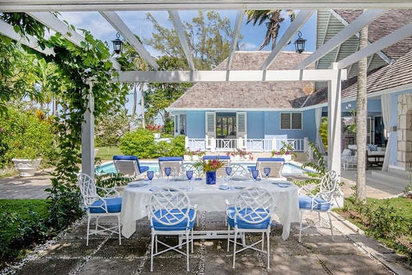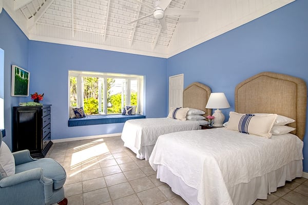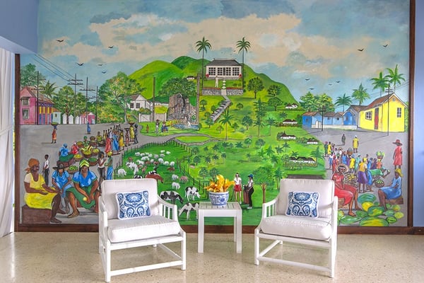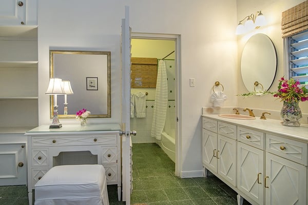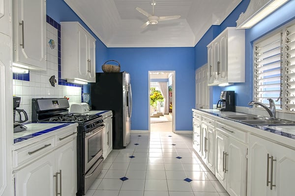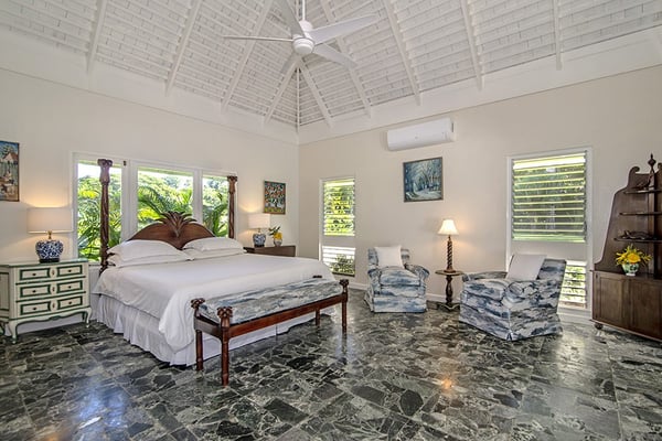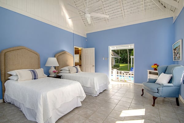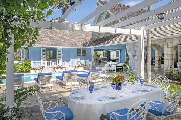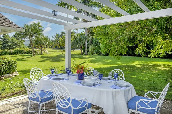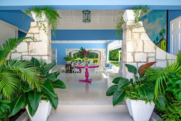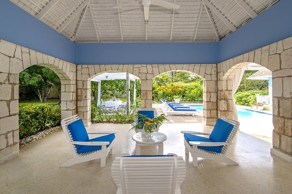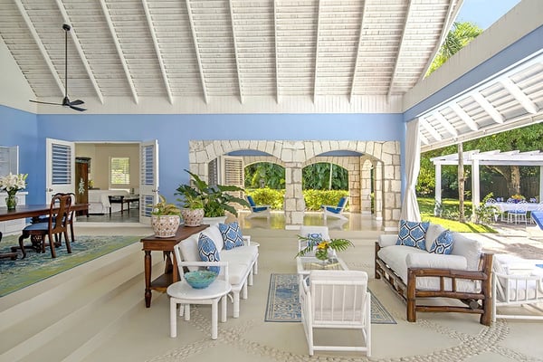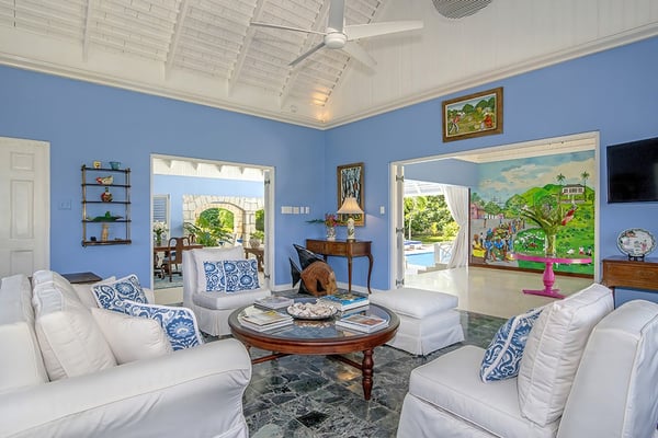The Tryall Club requires all villa and condo guests to become members during their stay via a Temporary Membership Fee ($) (plus a 15% service charge). Children between the ages of 13 and 15 pay at a discounted rate (plus a 15% service charge). Guests can also pay per day, for guests ages 16 and older, who stay for one to four days. This can be either prepaid or upon arrival at the Club. For children 12 years of age and younger, our Temporary Memberships are complimentary. Please contact a Villa Specialist for exact pricing! Little Palm is Tryall’s only two-bedroom estate villa, offering an intimate yet spacious retreat on the 17th fairway. Set on one acre of lush gardens, it’s just a short walk or quick golf cart ride to the beach. Every stay is effortless and luxurious, with a private pool, and elegant indoor and outdoor lounges. A favorite among honeymooners, couples, small families, and close friends, Little Palm provides privacy and serenity without the hassle of coordinating a large group. Originally built in 1959 by master architect Giuseppe Maffesanti as a summer retreat for an English count, this villa is a true Tryall gem. While its historic charm remains intact, Little Palm has been modernized with solar energy, flat-screen TVs, cable, air conditioning, ceiling fans, and free Wi-Fi. The décor is classic Caribbean, featuring a timeless blue and white palette with custom mahogany furnishings handcrafted by local artisans. A stunning hand-painted floor-to-ceiling mural greets you in the grand entry hall, while hand-hewn limestone walls and arches, a vine-covered gazebo, and lush fruit trees enhance the villa’s enchanting atmosphere. For those seeking relaxation, luxury, and privacy, Little Palm is an unforgettable escape in the heart of Tryall.