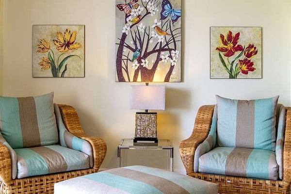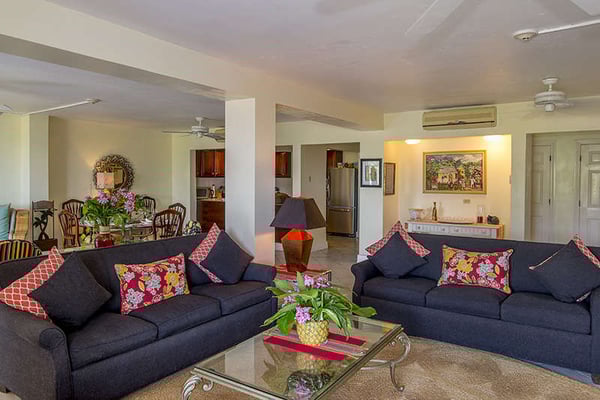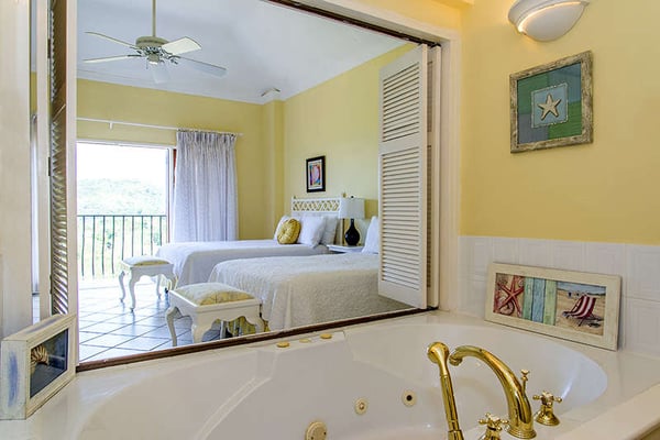 The Tryall Club requires all villa and condo guests to become members during their stay via a Temporary Membership Fee ($) (plus a 15% service charge). Children between the ages of 13 and 15 pay at a discounted rate (plus a 15% service charge). Guests can also pay per day, for guests ages 16 and older, who stay for one to four days. This can be either prepaid or upon arrival at the Club. For children 12 years of age and younger, our Temporary Memberships are complimentary. Please contact a Villa Specialist for exact pricing! With over 2,500 square feet of living space, Moments is a beautifully designed two-bedroom villa suite offering breathtaking views and expansive private verandas. Located within the Great House Villas at The Tryall Club, guests are within walking distance of tennis and pickleball courts, boutique shops, the gym, and the Kids’ Club. A complimentary golf cart makes reaching the world-class golf course and private beach easy. As you enter, a vibrant Caribbean-inspired painting sets the tone for this stylish retreat. The two spacious bedrooms each feature an en-suite bathroom with a Jacuzzi and large walk-in showers, designed in soothing pastel tones for a tranquil feel. Beach-inspired décor perfectly encapsulates the vibes of the island. While the second bedroom has two double beds and a smaller TV, the primary bedroom has a sleigh bed, a flat-screen TV, and a safe. Both suites have walk-in closets and balconies overlooking the Caribbean Sea and the Tryall Club’s championship golf course. The completely furnished kitchen with stainless steel appliances is located on the bottom floor. With its surround sound system, DVD player, flat-screen TV, and board games, the large dining and living space is ideal for entertaining, while a spacious patio is a great place to relax.