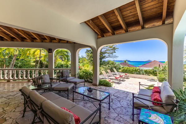 Bellamare distinguishes itself with unique details, including beautiful hand-made furnishings, imported Italian and handcrafted tile, hardwood and tile flooring, and several lovely balconies and decks. The lower level of the two-story main house opens to a spacious living and dining area with a fully appointed chef’s kitchen. Two upstairs bedrooms have en-suite baths, and are configurable with king or twin-to-king beds. The adjacent guest house is split into two bedrooms, each with a king or queen-sized bed, a full bath with an al fresco glass-block shower, and a balcony. Designed for outdoor enjoyment, the property features a swimming pool, coral-stone decking, a sun deck, a lush tropical garden and landscaping, and 1,400 square feet of outdoor seating. The expansive covered veranda provides beautiful views of sunsets over Mahoe Bay and Seal Dogs. A charming pathway takes you on a short walk to the stunning beach with access to some of the most pristine coral reefs in BVI.