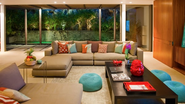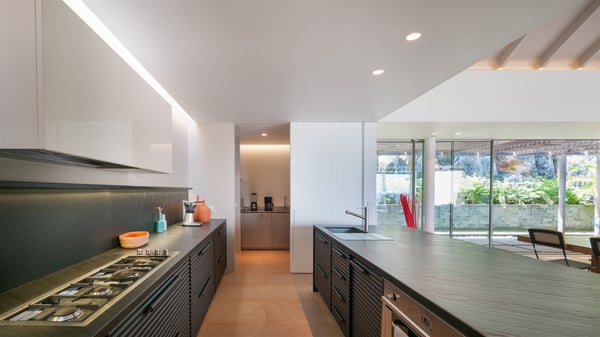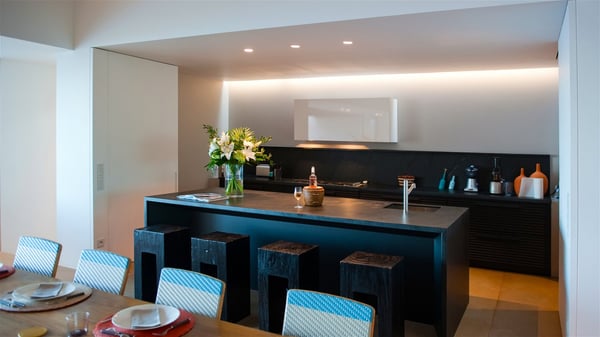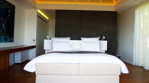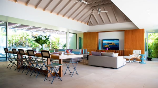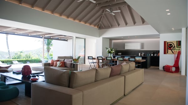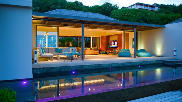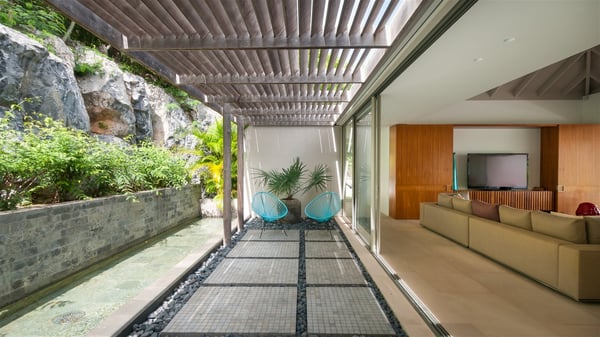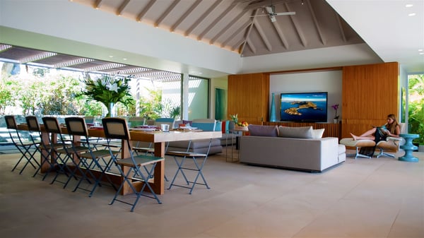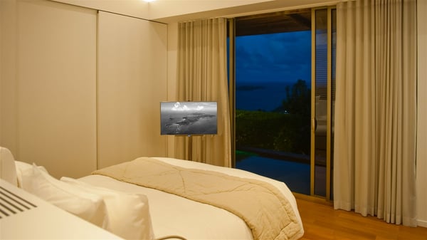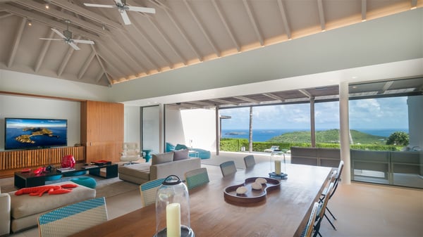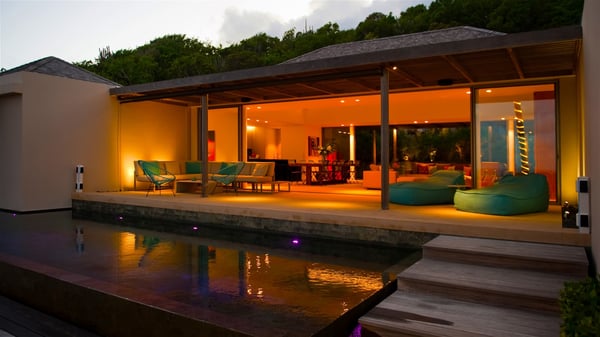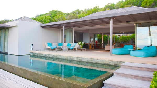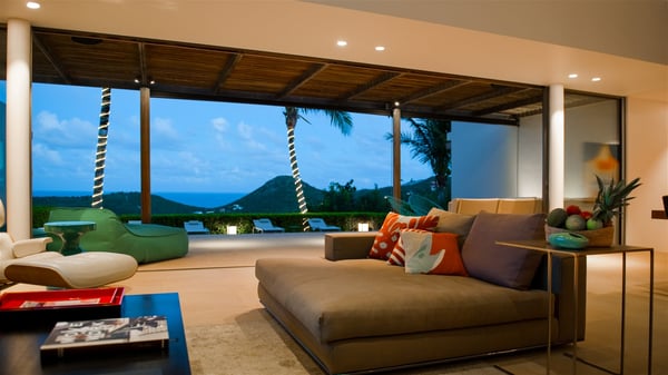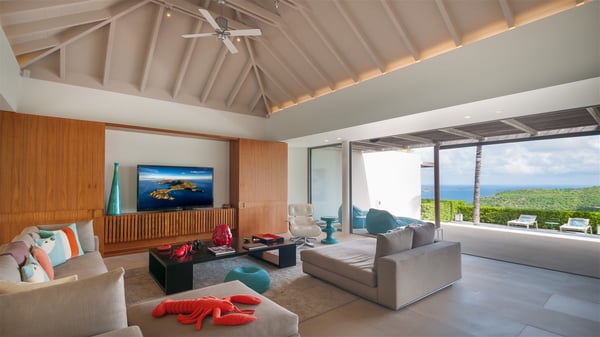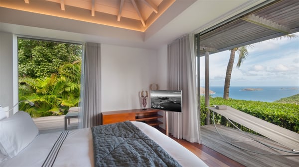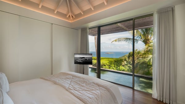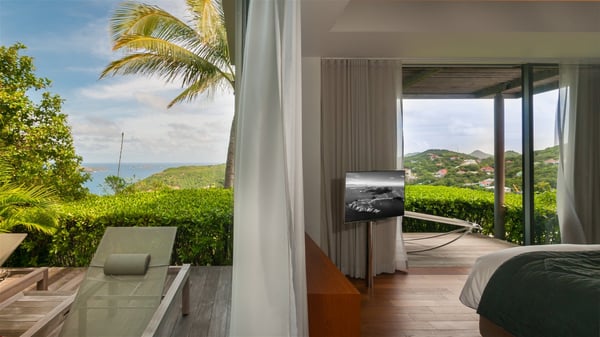 Located on the heights of Colombier, the rental villa Lina is a luxurious and very private vacation home in St-Barths. Surrounded by the lush tropical vegetation, this two-bedroom property with a splendid view over the ocean and the hills is the perfect place for an unforgettable stay in the Caribbean. As soon as you get on the property, you’ll be charmed by the soothing atmosphere created by the lovely green arbour next to a small pond surrounded by exotic plants. Built on one level and designed by the famous architect Johannes Zingerle, the luxury rental villa Lina provides outstanding views over St-Barts' turquoise waters. In a both contemporary and Caribbean style, vacation home Lina is decorated with light colors providing a daydream ambience. The light and modern decoration creates a very welcoming atmosphere, time seems to pass very slowly. In the expansive living area gently swept by the cooling ocean breezes, comfortable sofas and benches are set up in front of the view for delightful moments of relaxing and gathering. This is also the best spot to enjoy one of your favourite classic movies. The dining space can accommodate up to ten guests around a large and massive rectangular table. The modern, well-equipped kitchen also opens onto a swimming pool and ocean views. The St-Barths trade winds gently flow through this open space that seems to merge with the outside. The terrace of this luxurious vacation rental is set around a beautiful and long infinity swimming pool, facing the horizon and the tree-lined hills of St-Barths. Sun loungers and floor cushions are set up in front of the panorama for pleasant sunbathing sessions. An outdoor shower is available whenever you wish to cool off. Under the high palm trees that seem to touch the sky, time is suspended in this idyllic and charming scenery. The vacation rental villa Lina is a two air-conditioned bedroom with high amenities, an ideal spot for a stay with family or friends. Both bedrooms have king-size beds, dressing rooms and en-suite bathrooms, and are located on either side of the living room. They offer beautiful views over the pool and the tropical surroundings. These very charming bedrooms come with elegant linens and exceptionally comfortable amenities.