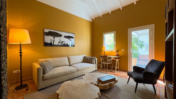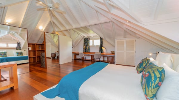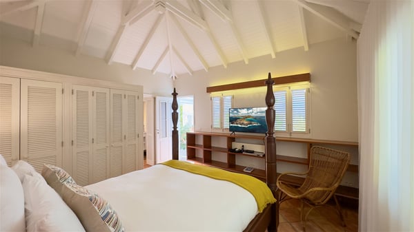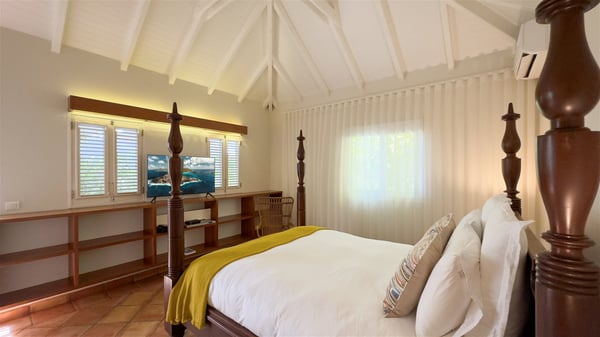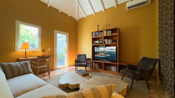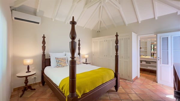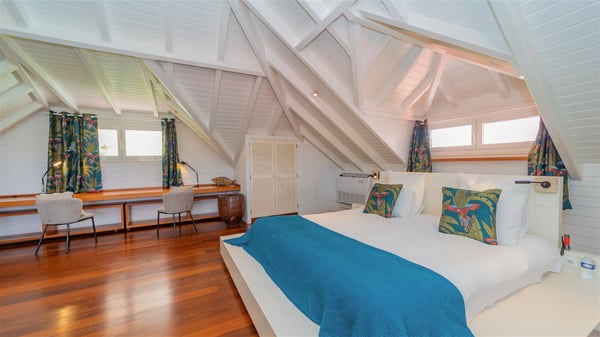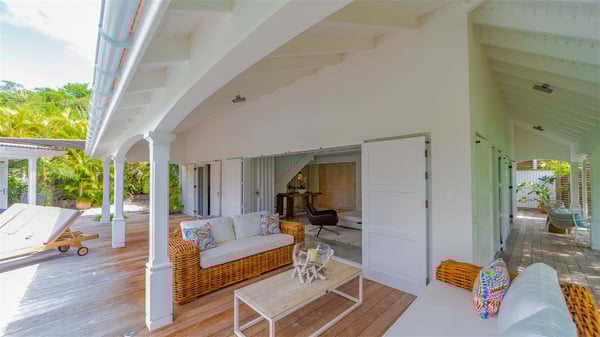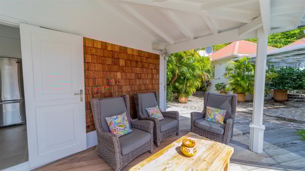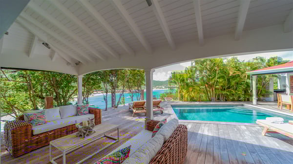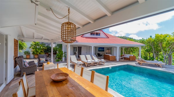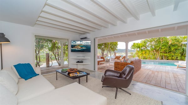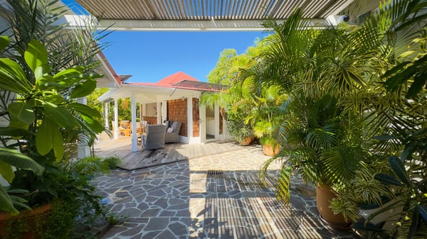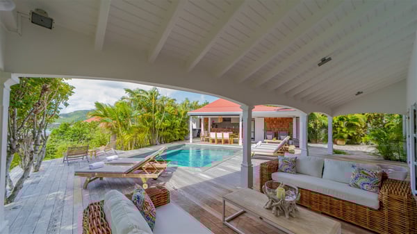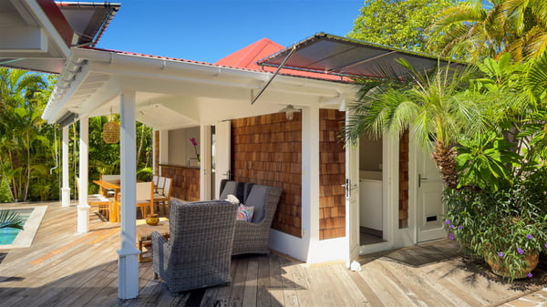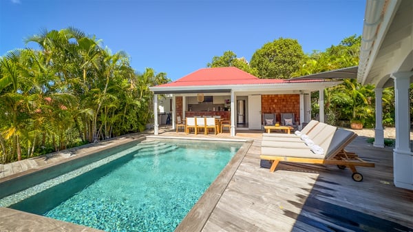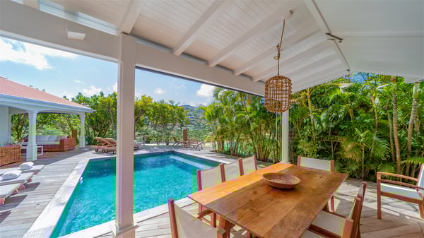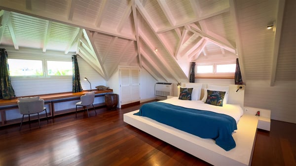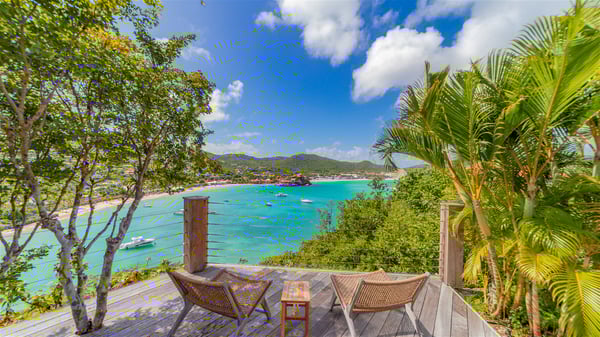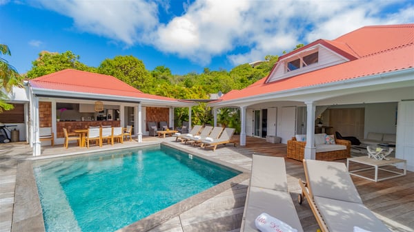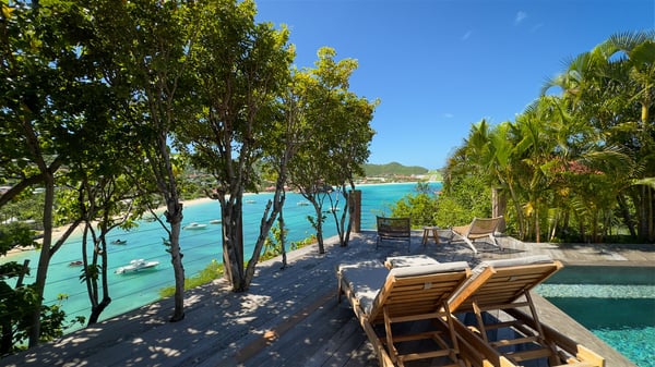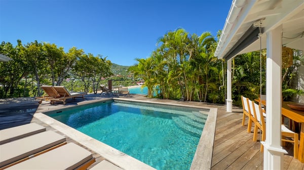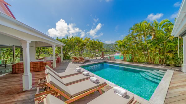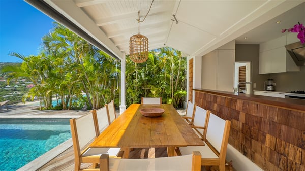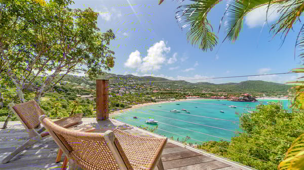 The villa rental Xanadu is a charming four-bedroom property with swimming pool and splendid views over Saint-Jean bay. Ideally located in the Caribbean heights, Xanadu offers bright spaces in a delightful setting of light woodwork and warm colors. In St-Barths’ amazing beauty, treat yourself to a dream getaway with family or friends in villa Xanadu. Villa Xanadu is designed over three independent, single-story buildings, except one mezzanine bedroom. The main building houses the bright and comfortable living room, with a lounge featuring a sofa and a large HD screen. The wide opening onto the terrace with swimming pool creates a soothing atmosphere in this air-conditioned living room, which can also be opened to let the trade winds gently blow through the room. The kitchen is located in a separate bungalow also overlooking the pool. Fully equipped, it features an al fresco dining area for eight people on the poolside. Villa Xanadu's terrace is a true tropical paradise. In the center you’ll find the property's lovely private swimming pool, overlooking the bay of St-Jean. From here, the translucent waters sparkle through the lush vegetation of the rolling hills. Some comfy deckchairs surround the pool for delightful reading or relaxing sessions under the sun. In addition, two small outdoor lounges are available under the covered terraces, the ideal place to quietly sip a cocktail. In this idyllic scenery, the lush palm trees provide an exquisite, exotic touch, making this very private terrace the perfect place to relax and enjoy St-Barths’ amazing light. The villa rental Xanadu consists of four air-conditioned bedrooms with en suite bathrooms and king-size beds, two of which overlook the bay. Two of the bedrooms are located in the main building near the living room, while the third one is upstairs on the mezzanine under the vaulted ceiling and features a magnificent parquet flooring; the fourth one is in an independent bungalow with a small private lounge, for complete autonomy. The decor is bright and cozy, with comfortable fabrics and wide openings onto the outside. Set on the hillside above the bay and facing St-Barths’ airport, villa Xanadu is the perfect place for up to eight people vacationing in the Caribbean beauty.