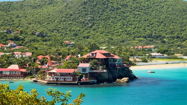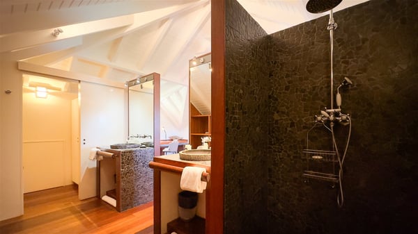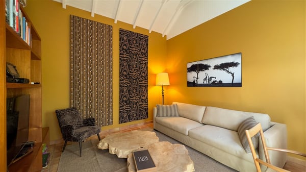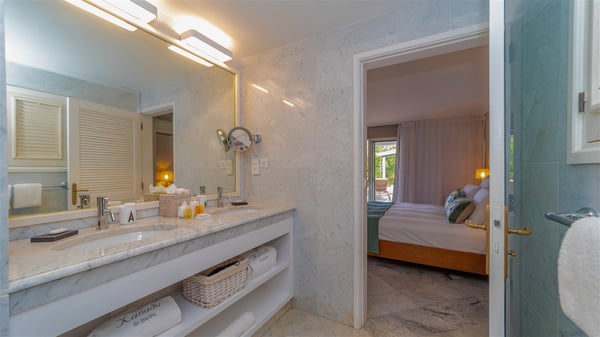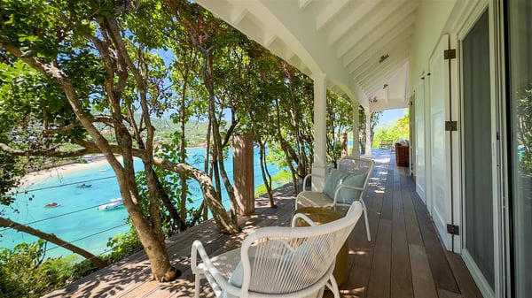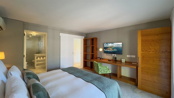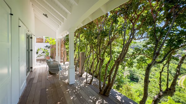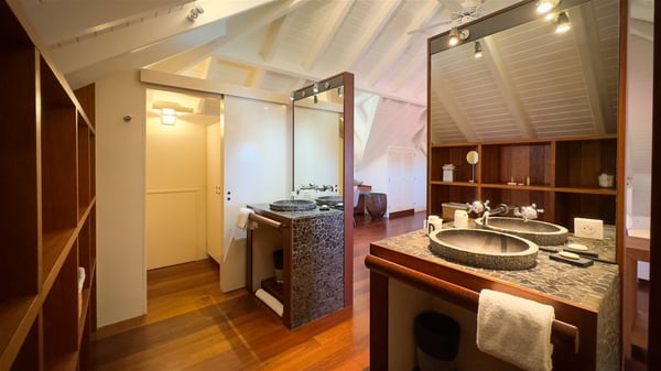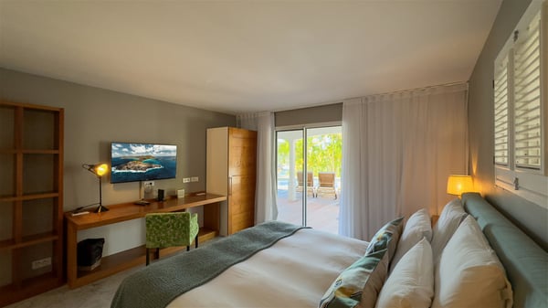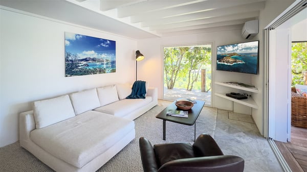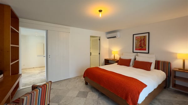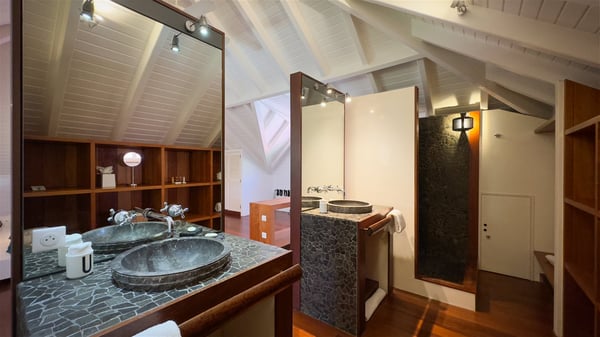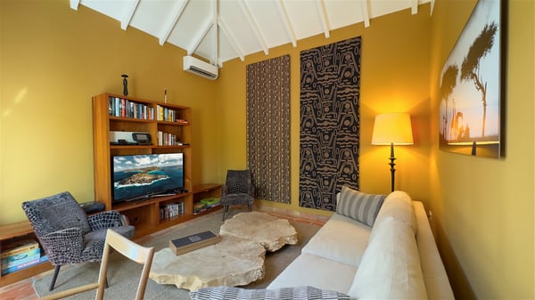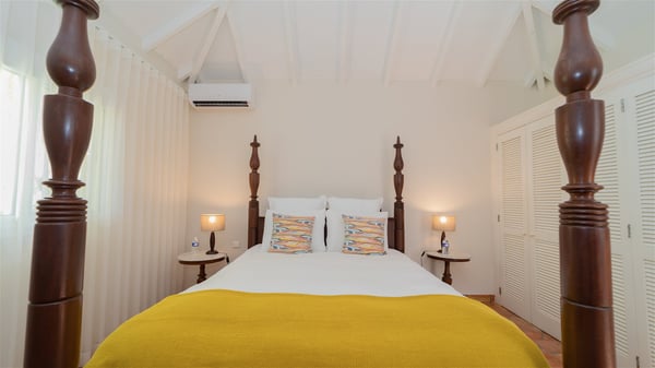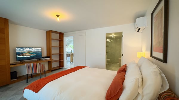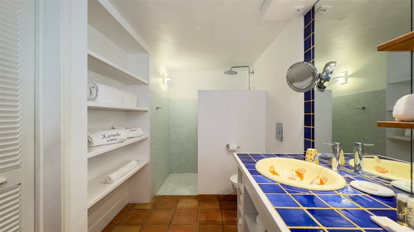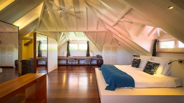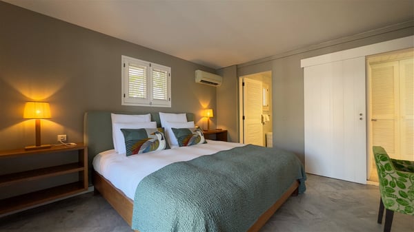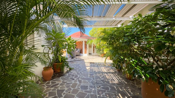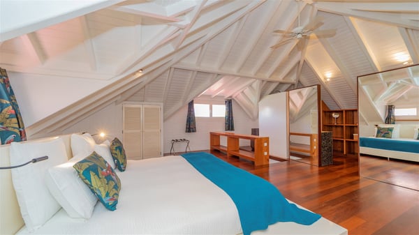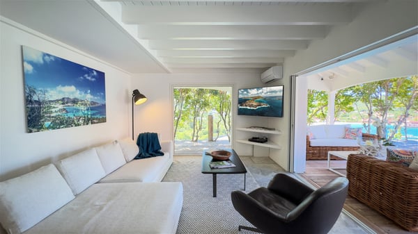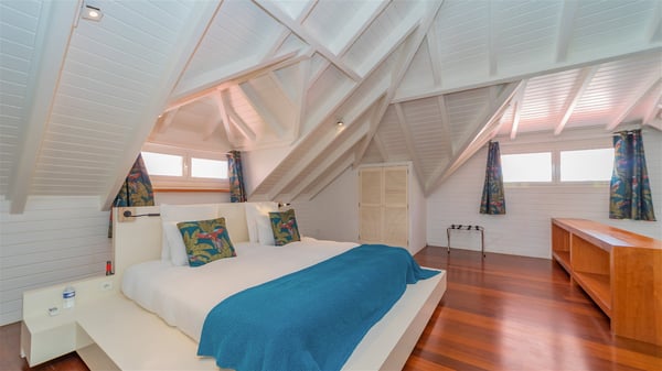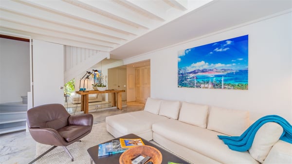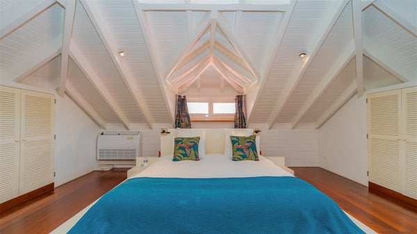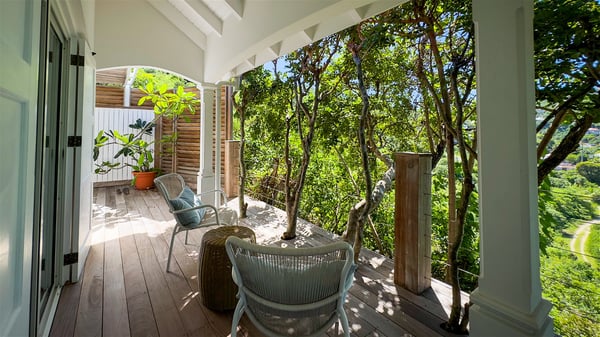 The villa rental Xanadu is a charming four-bedroom property with swimming pool and splendid views over Saint-Jean bay. Ideally located in the Caribbean heights, Xanadu offers bright spaces in a delightful setting of light woodwork and warm colors. In St-Barths’ amazing beauty, treat yourself to a dream getaway with family or friends in villa Xanadu. Villa Xanadu is designed over three independent, single-story buildings, except one mezzanine bedroom. The main building houses the bright and comfortable living room, with a lounge featuring a sofa and a large HD screen. The wide opening onto the terrace with swimming pool creates a soothing atmosphere in this air-conditioned living room, which can also be opened to let the trade winds gently blow through the room. The kitchen is located in a separate bungalow also overlooking the pool. Fully equipped, it features an al fresco dining area for eight people on the poolside. Villa Xanadu's terrace is a true tropical paradise. In the center you’ll find the property's lovely private swimming pool, overlooking the bay of St-Jean. From here, the translucent waters sparkle through the lush vegetation of the rolling hills. Some comfy deckchairs surround the pool for delightful reading or relaxing sessions under the sun. In addition, two small outdoor lounges are available under the covered terraces, the ideal place to quietly sip a cocktail. In this idyllic scenery, the lush palm trees provide an exquisite, exotic touch, making this very private terrace the perfect place to relax and enjoy St-Barths’ amazing light. The villa rental Xanadu consists of four air-conditioned bedrooms with en suite bathrooms and king-size beds, two of which overlook the bay. Two of the bedrooms are located in the main building near the living room, while the third one is upstairs on the mezzanine under the vaulted ceiling and features a magnificent parquet flooring; the fourth one is in an independent bungalow with a small private lounge, for complete autonomy. The decor is bright and cozy, with comfortable fabrics and wide openings onto the outside. Set on the hillside above the bay and facing St-Barths’ airport, villa Xanadu is the perfect place for up to eight people vacationing in the Caribbean beauty.