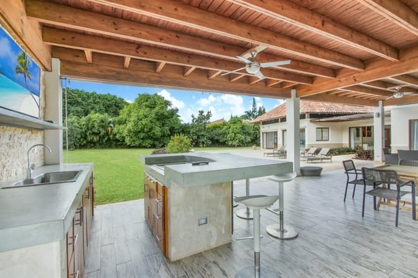 All guests must register with the Casa de Campo Concierge office, and for a small daily fee ($30 per adult per night & $15 per child per night), are granted access to resort areas and amenities. Casa de Campo Resort facilities and amenities include golf courses ($), the fitness centre ($), racquet center ($), restaurants ($) and bars ($). Contact Rental Escapes for more information about pricing. Tropical Paradise is a luxurious 5-bedroom, 5 1/2 bath, single-level villa, which makes it very convenient for multi-generational families of all ages. Step into the villa and find yourself in the beautiful entrance hall that connects the entire house. The grand living room has high, vaulted ceilings with ceiling fans and a beautiful chandelier, double sofa sitting area, custom built-in furniture and TV. Open the big sliding windows, which give you direct access to the outdoor pool area. The villa has a great outdoor, covered living- and dining area with a bar (beverages are not included), TV, games, and a unique Japanese teppanyaki (hibachi) grill (food is not included). This is a great “entertainment zone” where you can have so much fun spending the best time together with your family & friends. The formal indoor dining room is an elegant space with a unique chandelier and a spectacular dining table that seats 12 people comfortably on plush dining chairs. This is the perfect place to host your formal dinners. The covered, outdoor terrace also has a dining table if you prefer to dine more casually. A spacious kitchen with island and marble countertops comes fully equipped with everything you need to cook delicious meals during your vacation – AND your villa rental includes a chef, so you don’t have to worry about cooking (food & beverages are not included)! Enjoy a private swimming pool & Jacuzzi with a large pool deck and furnished terrace, huge private backyard with a big lawn area. If you are traveling with children, they’ll love playing in this backyard. The villa is furnished with contemporary furniture, unique décor pieces and artwork. Enjoy this private oasis, spend your days in and around the pool and soak up the sun by the pool. This is your dream vacation…