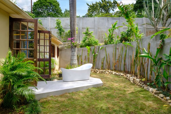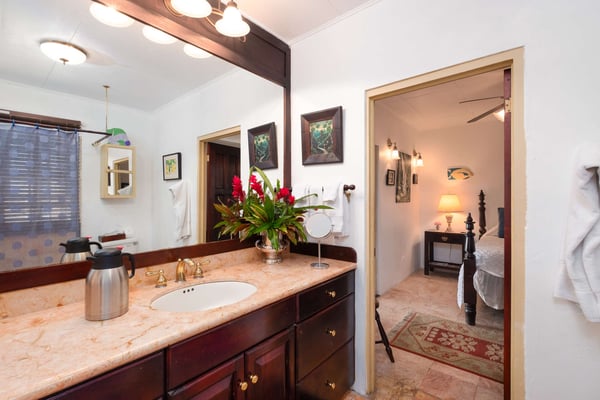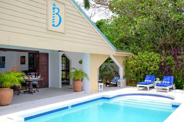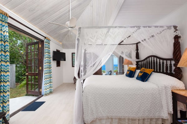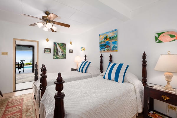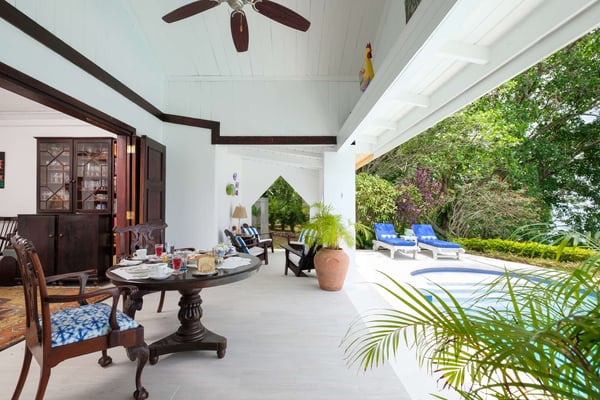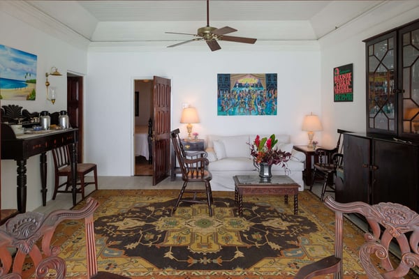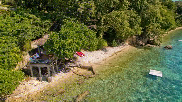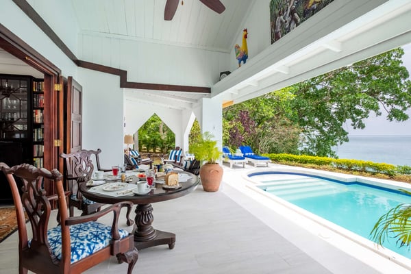 Milestone Cottage has always been the honeymoon favorite, although also popular for small families with its two bedrooms. Built many years earlier, it was purchased in 1986 and extensively remodeled and personalized. This is when its luxurious cliff-side plunge pool with underwater seats was added, the perfect place for soaking up the sun. Guests also enjoy heading down a dramatic staircase beside a massive fig tree to its seaside pavilion. This recent addition offers a way for guests to be close to nature in a totally private place, and there are sea kayaks nearby for adventuring along the remote south coast shoreline. This pavilion is an ideal spot for seaside lunches, and is the perfect location to enjoy tropical drinks and admire the flaming colors of the sunsets. Milestone Cottage has an intimate feel, making it cozy and comfortable for small families who want quality time together, but who also want some privacy. Its living room opens completely to the grassy lawns and sea views and pool, so children with a nanny can play for hours and parents can remain out of sight at the seaside pavilion or on excursions. Reconvening for fantastic meals served by the headman is always a terrific treat. For larger parties, it is recommended to combine this villa with Providence House.