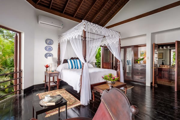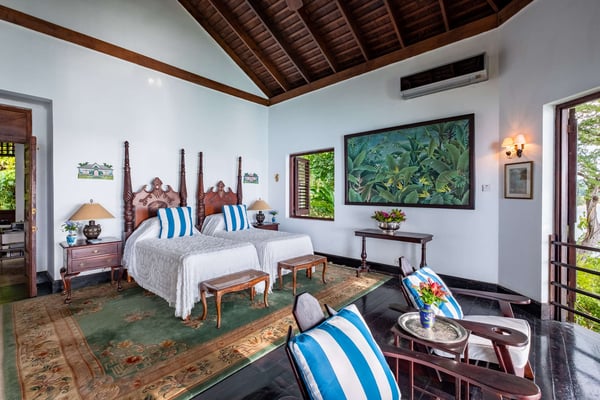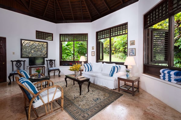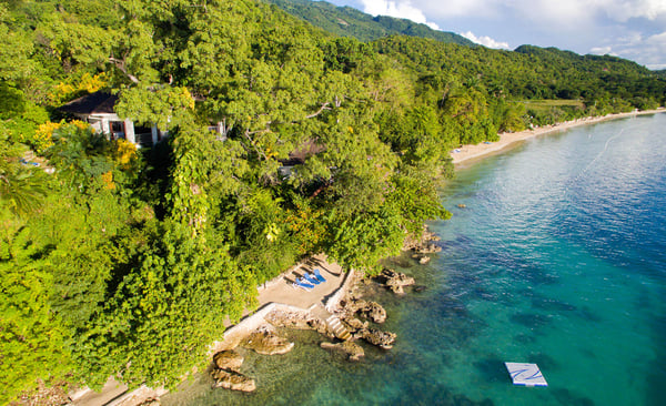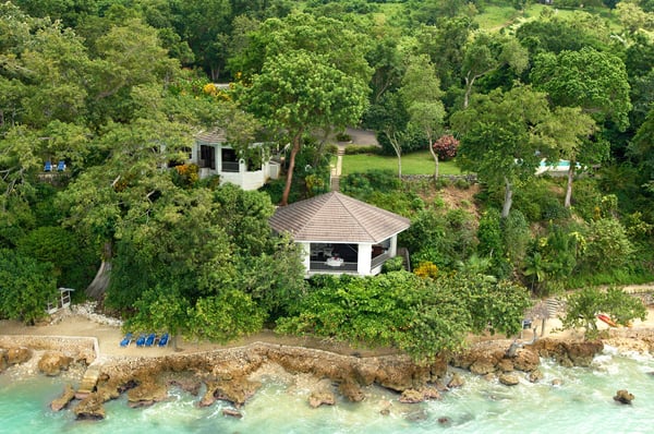 The most nature-integrated villa, Cottonwood Cottage has two-bedroom suites on four beachfront acres surrounded by dense tropical foliage. The Treehouse, located below Cottonwood, is a bar, living, and dining space overlooking the beach and sea with incredible views. Cottonwood Cottage’s primary bedroom offers expansive sea views with a private patio overlooking the sea and an exotic marble shower opening to a tropical garden. The villa boasts a private pool with a waterfall. Its two in-water loungers look out at the Caribbean. Please note that while the cottage's infinity edge pool area is entirely private, its waterfront areas are shared with other guests. For larger parties, it is recommended to combine this villa with the Hermitage.