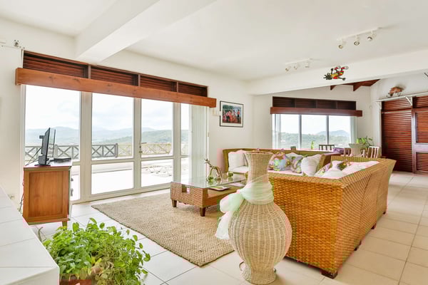 Located on a breezy hilltop, you will find dramatic views of both the Atlantic Ocean over to Cas En Bas Bay and the Caribbean Sea toward Pigeon Point National Park. As you arrive, you enter under an arched and gated entry into this very special hilltop villa, which hints at the wonderful gardens and glorious views beyond. Step through the arched and gated entryway into the lush gardens of the entrance courtyard. The main floor welcomes you with a spacious open-plan sitting room, complete with a Smart TV and a music center. Adjacent to this is a dining area, an east-facing patio, and a generously sized kitchen, fully equipped with modern amenities. Outdoor dining is a delight on the terrace adjoining the pool, offering stunning sunset views. The large pool, surrounded by sea stones, is complemented by a wooden sun deck, providing a serene spot for soaking up the Caribbean sun. Additionally, there's an unheated plunge pool and an outdoor shower on the expansive pool deck. Ascend the stairs off the dining area to reach the grand Primary bedroom, featuring a king-sized bed strategically positioned to capture the magnificent views through its large picture window. This air-conditioned retreat boasts a walk-in closet, an ensuite bathroom, and its own balcony for further enjoyment of the breathtaking scenery. On the lower level, you'll find two more air-conditioned bedrooms, each furnished with twin beds convertible into a king-size bed, private terraces overlooking the sea, and ensuite bathrooms. If you only require one bedroom, you can rent the primary suite separately. You'll still enjoy full access to the villa, with the two lower bedrooms locked off during your stay. To book the discounted one-bedroom rate, please use the provided link.