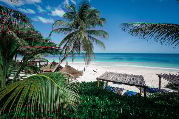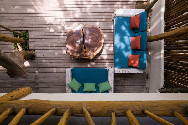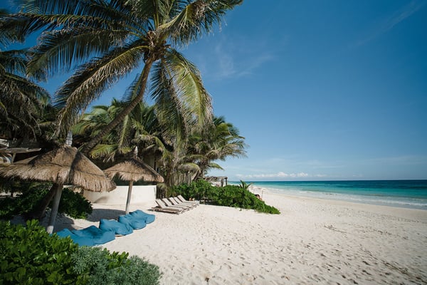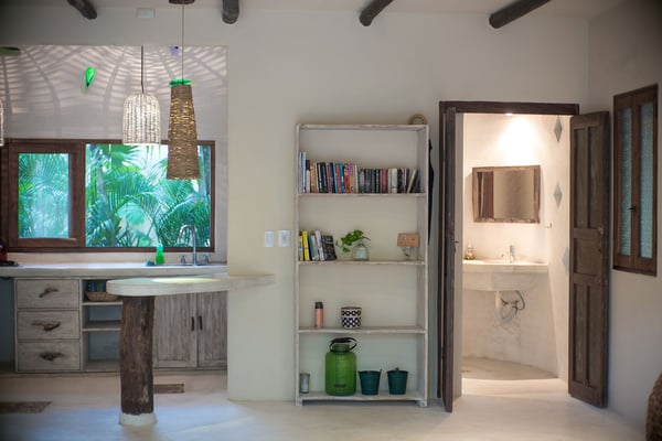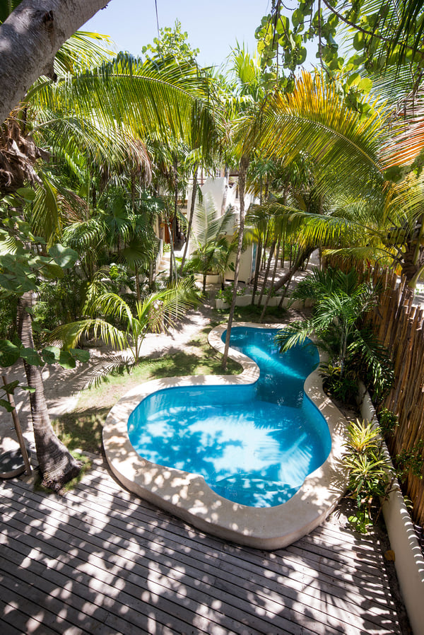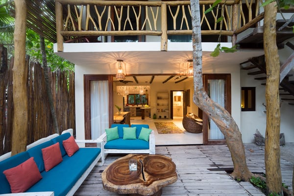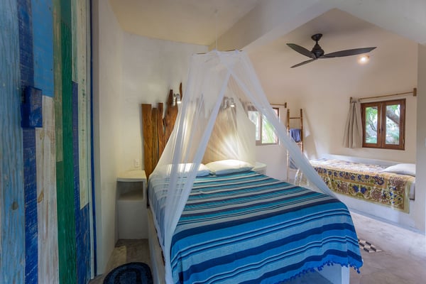 Casa Mandala is a beautiful full service rental home in the heart of the Tulum beach hotel zone. Set back slightly from the sea with its own shade palapa and lounge chairs on the beach, Mandala is steps away from all Tulum has to offer. This modern beach home has three bedrooms and sleeps seven. The top floor is a large master suite perched in the canopy of the trees. It is surrounded by windows and foliage. The king sized bed is comfortable with nice linens and the en suite bathroom has a shower. Windows open on all four sides so you are immersed in the green foliage of the tree canopy. The second floor has two bedrooms with private entrances from the outside. One room has a queen size bed and the other room has a queen bed and a single. The bedrooms share a bathroom via a shared hallway. Between the bedrooms is a retractable wall that you can keep closed for complete privacy or open if you want more connection. This is a great option for families travelling with children. The second floor bedrooms have a/c for night time use. The main floor is open concept with a living room area, dining area and kitchen so you can prepare meals and keep your beverages cold. A wall of glass doors open up to the wooden lanai with comfortable outdoor furniture and the pool. The living area has a/c for night time use. Electricity is precious along the beach so conservation is important. Casa Mandala has beautiful artistic touches and ambient lighting. It is a laid back and stylish vacation rental close to amenities. There are great restaurants and yoga classes within a few minutes. Although you do not have sea views from the house you are only steps away. You have your own garden and pool oasis and spot on Tulum's stunning white sand beach. No shoes required. Please note this villa experiences some urban sounds due to the central location.