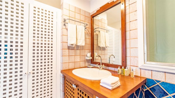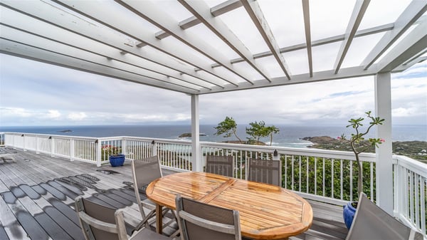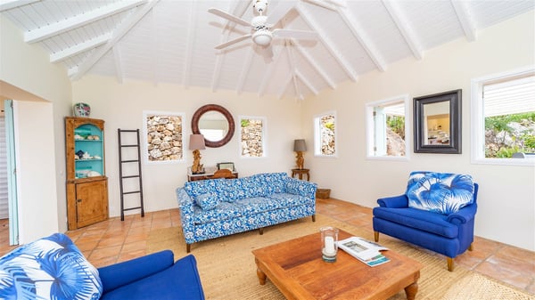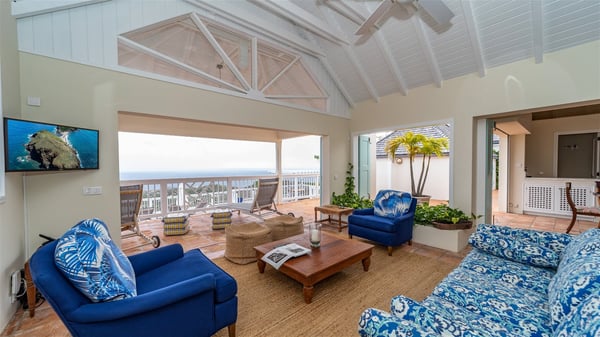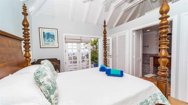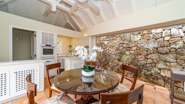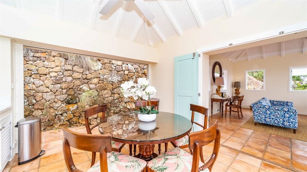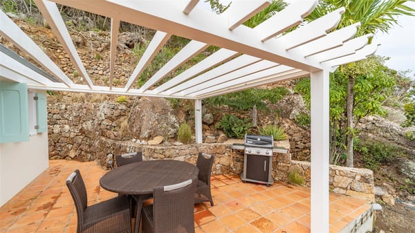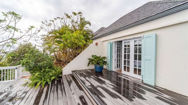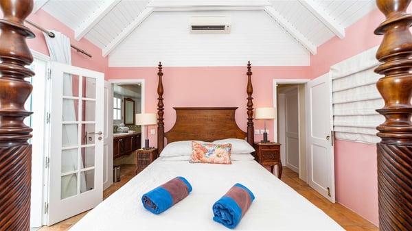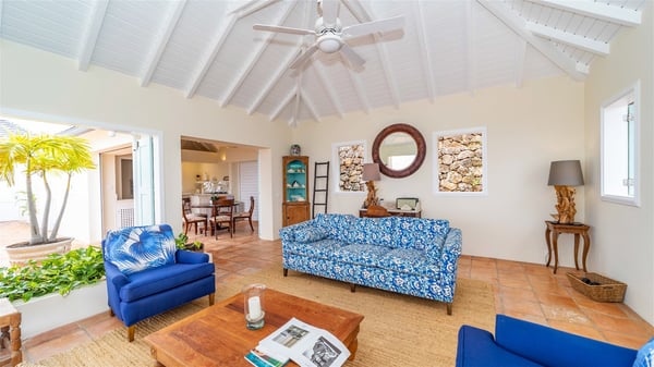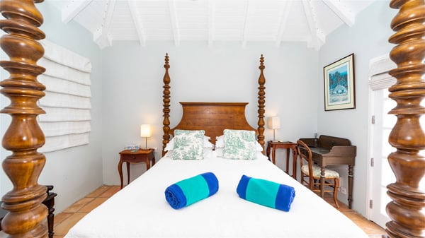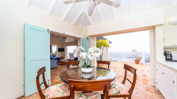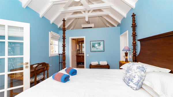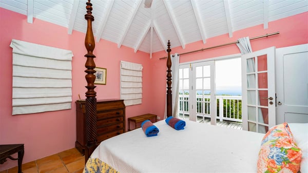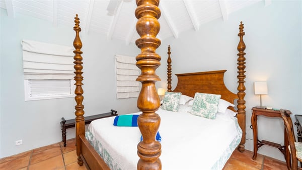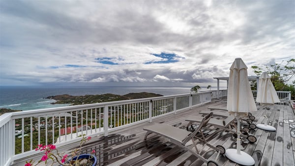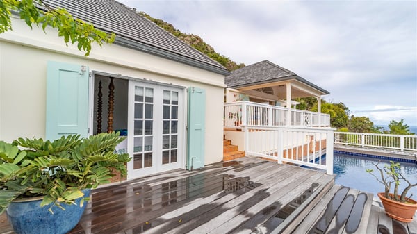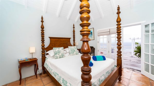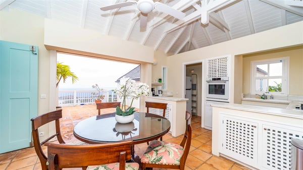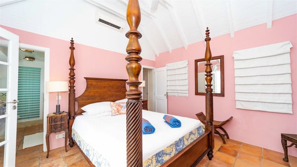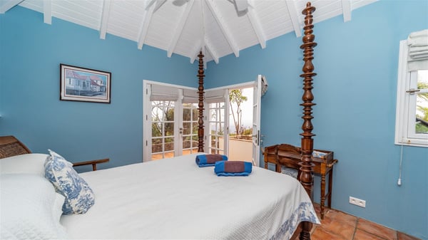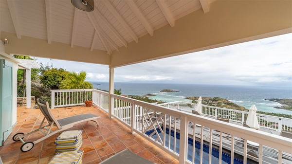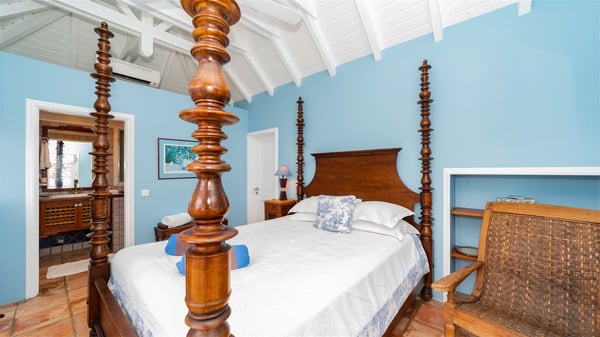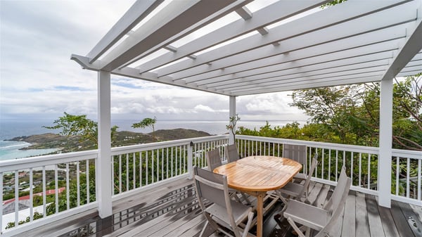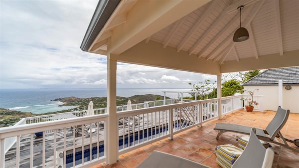 The vacation rental Cheyenne is a charming property located in Vitet overlooking the ocean and the lagoon of Grand-Cul-de-Sac. Very well equipped and located close to all amenities, this three-bedroom villa with a swimming pool is the perfect place for a stay with family or friends in the Caribbean. Built on one level over two connected buildings, villa Cheyenne widely opens onto the infinite ocean and the crystal-clear waters of the lagoon. The spacious living room is comfortably furnished with a large sofa, nice armchairs and an HD TV in front of a large bay onto the large terrace. The modern, well-equipped kitchen is located next to the living room and features a lovely indoor dining area with a round table for six guests. Bright and well-appointed, Cheyenne's indoor space is gently swept by the trade winds that blow through the wide openings, letting in the natural glow shining through the palm trees. The atmosphere is soothing, quiet and restful, with a decor of driftwood and warm fabrics. At the front, the terrace of villa Cheyenne is spacious and well equipped with a beautiful swimming pool overlooking the deep blue ocean, as well as an outdoor dining area located at one end of the terrace under a charming pergola filtering the island sun. There are loungers in front of the stunningly beautiful ocean view, the perfect place to enjoy the tropical sunshine while reading a book or sipping a cocktail. A second outdoor dining room is also available on the side of the villa, for pleasant al fresco dinners in the cool vegetation provided by the palm trees and the garden’s flowering shrubs. The holiday rental Cheyenne consists of three air-conditioned bedrooms with en-suite bathrooms. They are all furnished with king-size four-poster beds and offer splendid ocean views. These very private bedrooms feature soothing blue and pink hints, as well as many soft cushions which bring a delightful feeling of quiet. Between sky and sea, villa Cheyenne welcomes you and your guests in a romantic and peaceful atmosphere for an idyllic vacation in St-Barths.