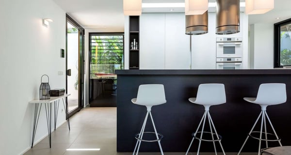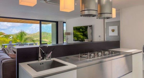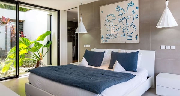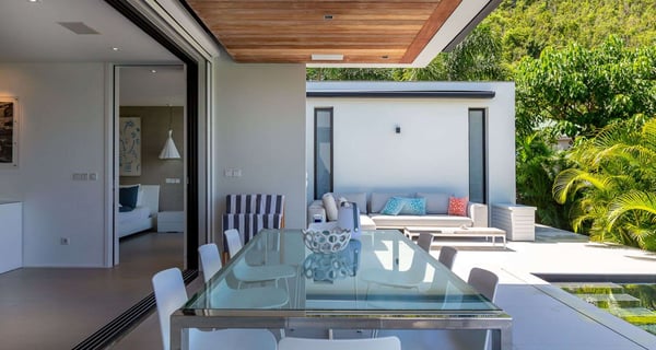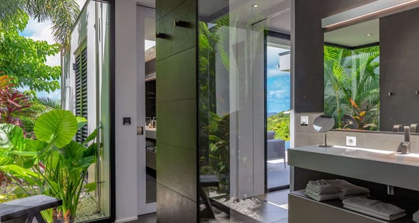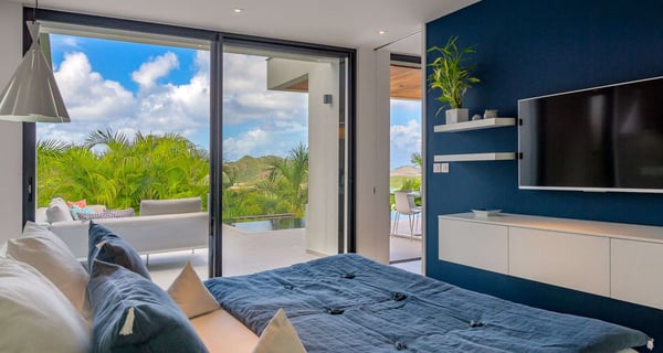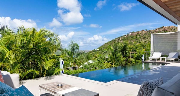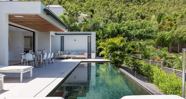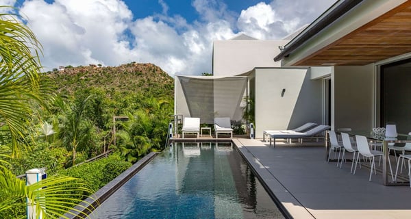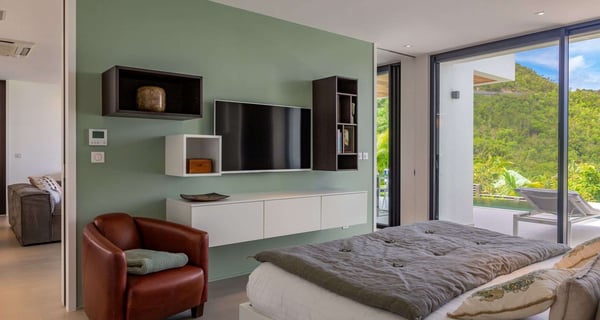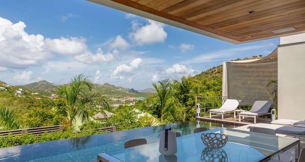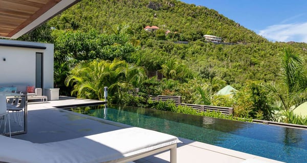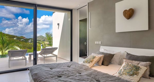 Villa Indyana is a beautiful three-bedroom property with a pool nestled in the lush vegetation of St-Barths. Located in St-Jean, Indyana offers upscale amenities in a modern and sleek decor. With high-end facilities and bright spaces, the villa rental Indyana is the perfect place for an unforgettable stay for six people in St-Barths. Designed in a contemporary style, the vacation rental Indyana welcomes you in a soothing atmosphere with mineral tones ranging from white to charcoal, illuminated by the surrounding palm tree vegetation. Modern and refined, Indyana features a magnificent, air-conditioned lounge with a large sofa facing an HD screen. The open layout leading to the terrace with a pool allows the trade winds to gently breeze through. Behind the living room, you’ll find the fully-equipped kitchen around a bar with stools to talk over a coffee, with white and stainless steel hints in a sleek atmosphere. The light fixtures and the view over the Caribbean hills create a tropical ambiance, gently blown by the sea breeze, perfect to quietly relax. At the front, villa Indyana's terrace opens onto an amazing view over the environment and, in the distance, the bay of St-Jean with the Caribbean translucent waters. The heated swimming pool (9m x 3m) glistens under the sun, near the loungers and the outdoor comfy lounge set up at the end of the terrace. Under the covered area, the al fresco dining room can accommodate up to eight guests for delightful dinners in the mild Caribbean air, in the very private ambiance of this luxury, modern and refined villa. There are palm trees and local shrubs planted over the villa's surroundings, bringing a refreshing charm and a fine poetry, making your stay in St-Barths a timeless moment. The vacation rental Indyana consists of three air-conditioned bedrooms with en-suite bathrooms. Furnished with king-size beds, two of them are located on either side of the living room, and the third one, with a king-size bed convertible into twins, is in an independent studio with a kitchenette. Spacious and comfortable, the bedrooms are true havens of peace, to quietly rest and relax after beautiful days exploring the treasures of St-Barths. Ideally located in St-Jean in an enchanting environment, the vacation rental Indyana is the perfect place for a great getaway with family or friends in St-Barths.