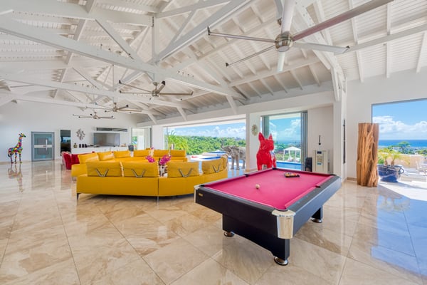 Located in the exclusive community of Les Terres Basses, Grande Azure is a stunning five-bedroom villa offering breathtaking views of the Caribbean Sea and neighbouring island Anguilla. Grande Azure is a refuge of peace and serenity where visitors experience luxury in the heart of a beautiful, lush tropical garden. There is a vast pool terrace that features a large pool accompanied by an oversized Jacuzzi. Surrounded by warm, sand-hued stone, the entire pool area offers unforgettable sea views, stargazing opportunities, and round-the-clock fun and comfort. There is an enormous outdoor kitchen and barbecue area adjacent to the al fresco lounge and dining area. There are several sun decks, an outdoor games area, and a massive, covered sun bed. Just steps up from the pool terrace, you enter the main house with its massive, floor-to-ceiling doors that totally erase the lines between interior and exterior spaces. The great room easily lives up to its name and is a vast, expansive space flawlessly decorated in an appealing and modern style. Using fun sculptural figures, a calm palette accented with bursts of mustard and rose, and an open floor plan, it will quickly become a favorite gathering space. It includes a large lounge, a games area with a pool table and circular banquette sofa, a media space with a premium entertainment system, and a gorgeous, modern kitchen. There is also a kitchen and living room in the guest house, as well as a large outdoor living area just off the kitchen. The bedrooms are a good match to the rest of the premises and include a master suite on an upper level, featuring a king bed, kitchenette, sitting room, and garden views. There are two main-level king suites, and the fifth suite is in the guest house and features double king beds, a kitchenette, and a terrace. All bedrooms have ensuites and all feature premium entertainment systems. Grande Azure is a rare find and offers resort-like or estate-like options, premium services, and a flawless setting.