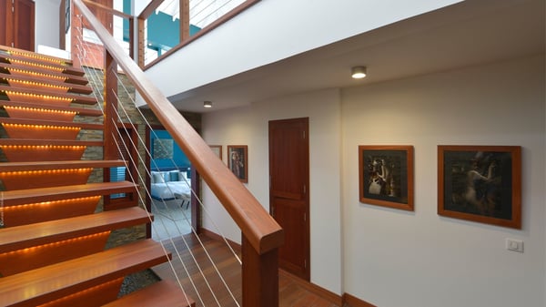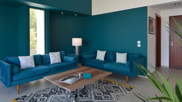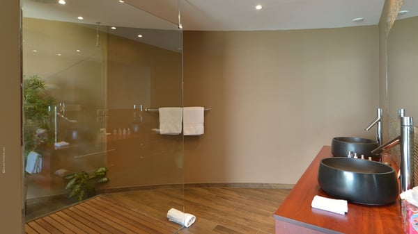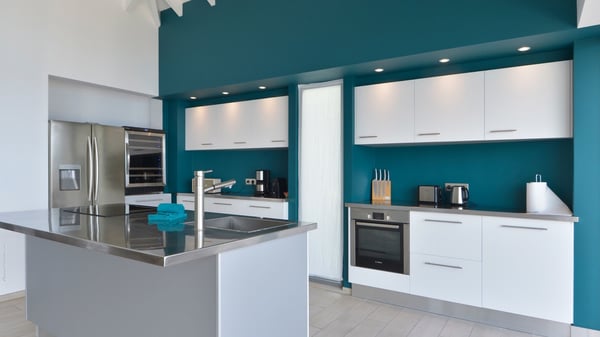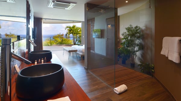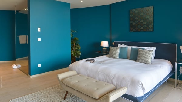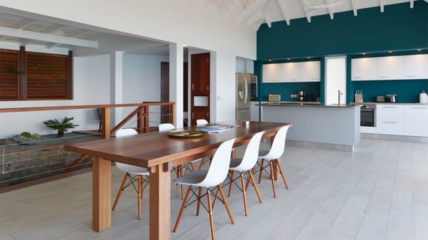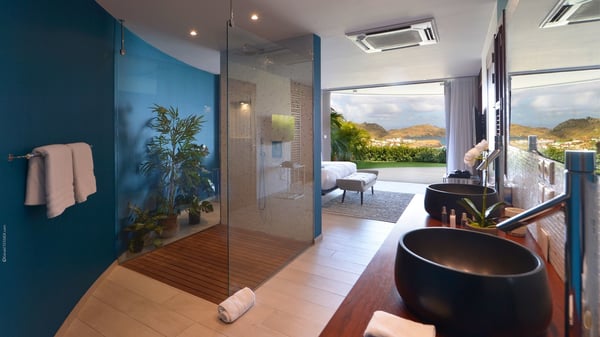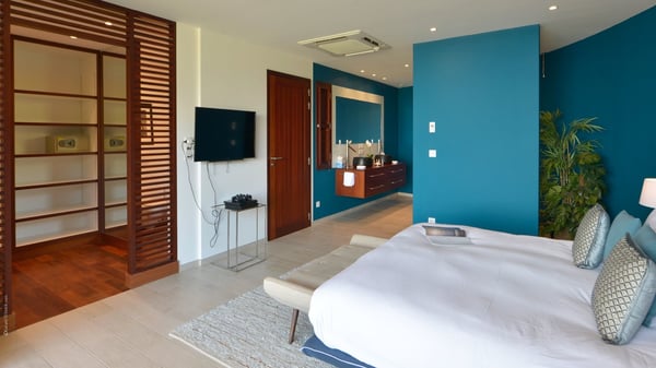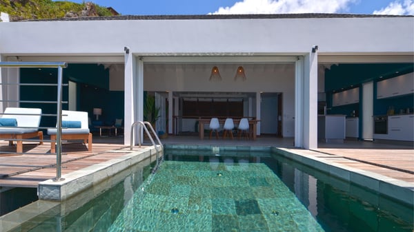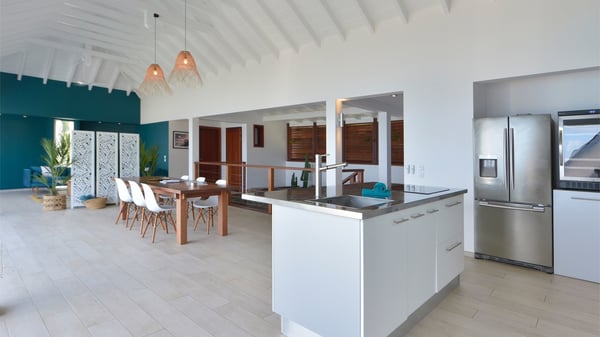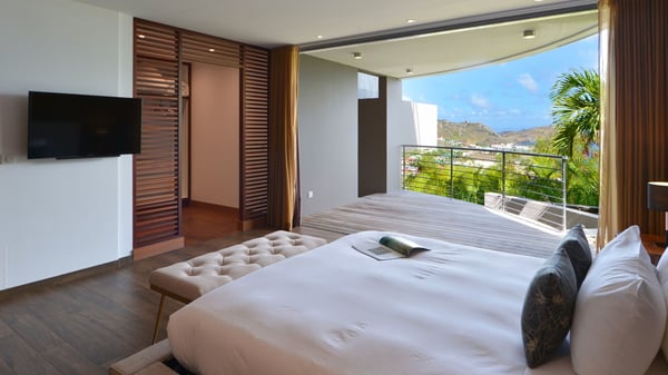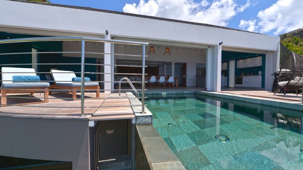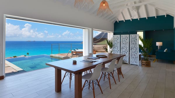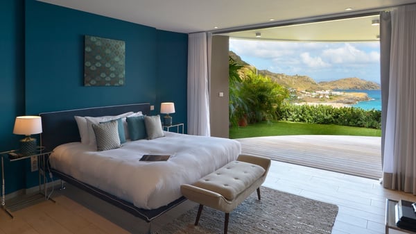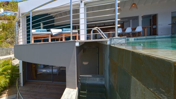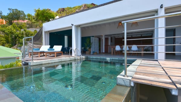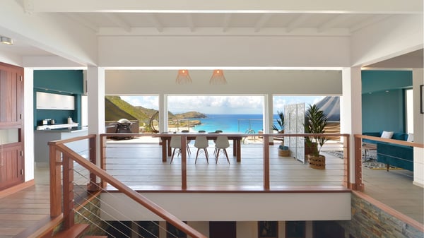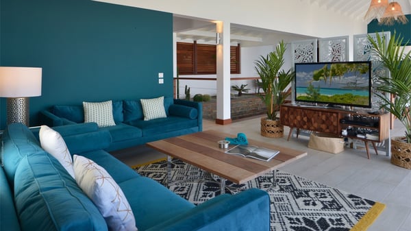 Located only a few steps away from the fantastic Flamands Beach, the charming rental villa Flamands Bay in St. Barths offers a splendid view over the sparkling ocean, the beach and the surrounding islands. Built on two levels and decorated in a contemporary style, this luxurious vacation house is one of the best choices for couples looking for a romantic stay or for a honeymoon in St-Barths. This original vacation home Flamands Bay has an oval-shaped architecture, a design choice that provides it with an atypical yet familiar character. The large great room opens onto the outside, as it faces the view and the terrace. There is a pleasant and refined atmosphere in this tastefully decorated living room, with turquoise tones and comfortable sofas facing the terrace with a breathtaking view over the bay of Flamands. A coffee table, a carpet and a large TV set create a cozy and welcoming atmosphere under a high vaulted ceiling. A lovely dining space is between the well-equipped kitchen and the living room, with a table that can accommodate up to eight guests. At the back, a staircase leads to the lower level where the two comfortable bedrooms are located. On the terrace, you'll be amazed by the beauty of the merging blue tones of the infinity swimming pool in the foreground and the azure ocean in the background. There are sunbeds on the deck for delightful sunbathing sessions, facing the view over the Flamands sandy beach. A barbecue is also at your disposal for delicious evenings under the starry sky of St-Barths. Around the villa, the tropical garden brings a fresh and exotic touch to this idyllic setting. On the lower level, the vacation rental villa Flamands Bay has two beautiful air-conditioned bedrooms with wooden floors. They are both elegantly furnished, one in the same shade of blue as the living room tones, while the second room features sweet and voluptuous caramel colours. Each has a king-size bed covered with pillows and a spacious en suite bathroom. These very private bedrooms open onto two terraces with access to the garden planted with palm trees.