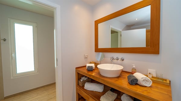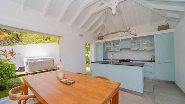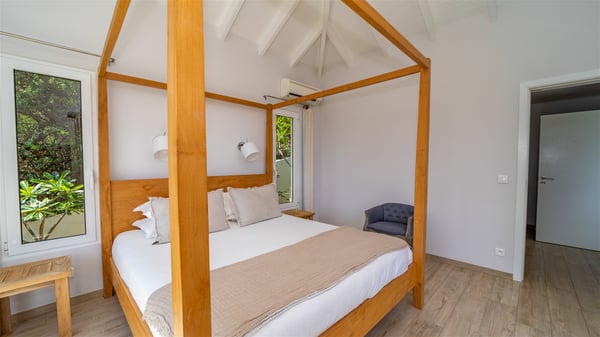 The vacation rental Paille En Queue is a charming property located on the heights of Saint-Jean in front of an amazing view over the hills and the ocean. Very comfortable and spacious, this vacation home with a swimming pool is the perfect place for an unforgettable getaway for four in the Caribbean. Villa Paille En Queue is a single-story property opening onto the breathtaking panorama over Saint-Barths’ rolling hills and the deep blue ocean. The large, fully air-conditioned living room offers a delightful feeling of volume, with high ceilings and glazed doors letting in the Caribbean light. The lounge is comfortably furnished with sofas and an HD screen, perfect to relax and sip a cocktail. The indoor dining room for four guests is close to the fully-equipped kitchen with a central island. As it opens both onto the front and the back where you’ll find a lovely planted terrace with barbecue, the living area welcomes guests in a peaceful, cozy atmosphere. At the front, the terrace of villa Paille En Queue is a most exquisite place for guests who will enjoy a heavenly, very private atmosphere. Under the sun-filtering roof, the al fresco dining room welcomes six guests for al fresco diners, blown by the gentle trade winds. Facing the ocean and St-Jean, the lovely swimming pool sparkles under the sunshine, near the deckchairs perfect for sunbathing and reading sessions. On the side, there is a second covered outdoor lounge, the perfect place to relax and chat by the pool. In the mild island air, you’ll love taking time to enjoy the quiet atmosphere, and watching the stunning panorama. The holiday rental Paille En Queue consists of two air-conditioned bedrooms with en suite bathrooms and queen-size beds. One of them is located near the living room, and the second one can be accessed via the terrace. They are both bright and comfortable, with vaulted ceilings that provide a romantic touch to the whole. In the mild and gentle Caribbean, villa Paille En Queue is the perfect place to stay with friends or family in St-Barths.