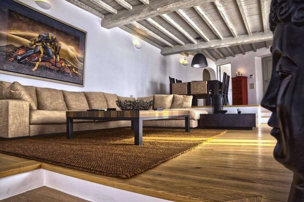 Casa di Mare is a stunning 275 square metre villa located on the island of Mykonos, in a 2,000 square metre plot overlooking the Aegean Sea. Just a short distance from the family-friendly Agios Stefanos Beach, the villa offers a spectacular view of the sea. Sitting here, guests can enjoy their time by the pool, feast on delicious food and watch the sunset that will leave a lasting memory. The tastefully decorated house was designed for luxury and comfort, and guests who come here never want to leave. Casa di Mare consists of the Main House accompanied by four guesthouses. The villa and guest houses accommodate a total of seven couples or 14 guests. Located close to Mykonos Town, Casa di Mare offers all the conveniences of the town as well as the peace and quiet that comes from solitude. Surrounding the villa is a terrace which has everything you need. The T-shaped swimming pool is absolutely gorgeous, and the bar, barbecue, and lounge and dining area have been perfectly designed. The garden is well-maintained and comes complete with its own football (soccer) court. Whether you are just lazing by the pool, strolling in the garden or enjoying a game of footie, you will love your time at Casa di Mare.