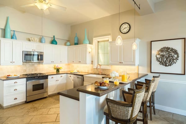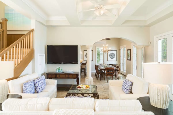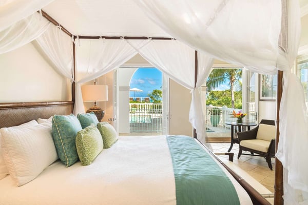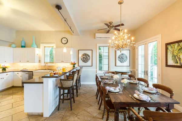 Tamarind Villa is a gorgeous and versatile property that was well-suited for a large group (10 people). Not all of our 10 were couples, and Tamarind has a unique bedroom count that allowed for those singles who wanted their own room to do so. All beds are King sized and each bedroom had an en suite bath. The salt water pool can be heated upon request and the ocean is just steps away. There were three sun decks with ample seating and tables, along with a gazebo and outdoor dining as well as ample and comfortable seating indoors. The rooms had individually-controlled AC units, but honestly, after the first couple nights we turned off the AC and just opened our balconies to the ocean breezes. Electricity is metered and you're charged if you go over the $200 allowance for the week, so it's good to be energy conscious. I didn't find bugs to be a problem, but a few in our party got a bit "eaten up" by no-see-ums. The large kitchen seemed suitable for our catering chef to work. There was ample counter space to set up a bar; also two full-sized refrigerators, a wine fridge and refrigerated drawers. The only downside was the very loud construction at the villa next door that was being renovated.