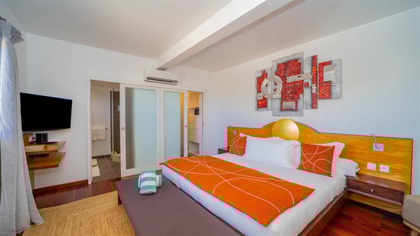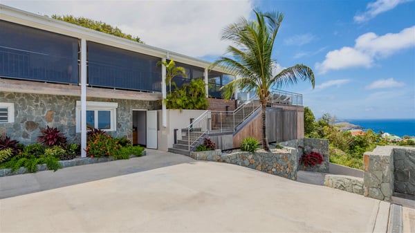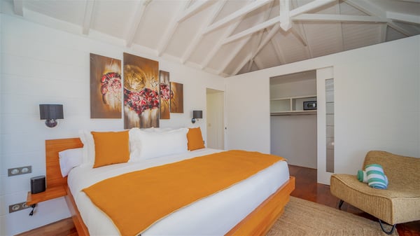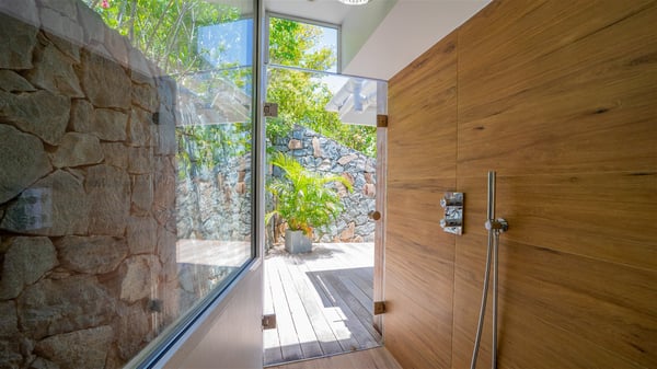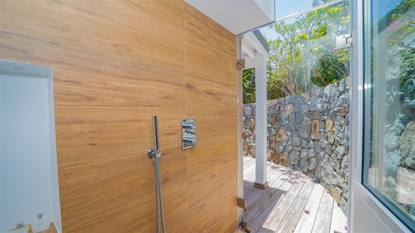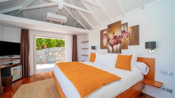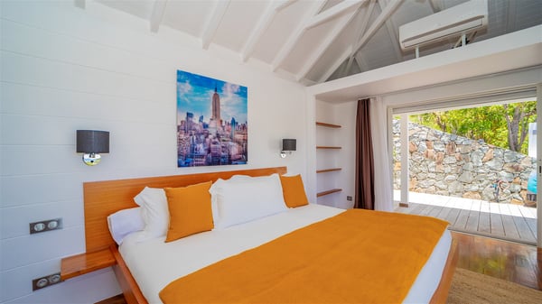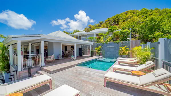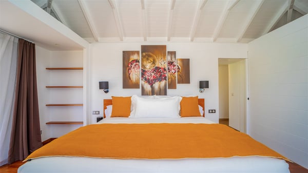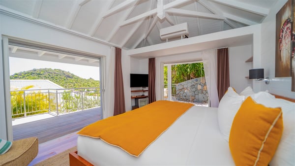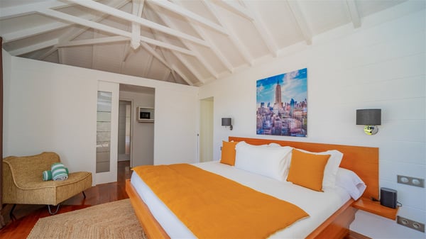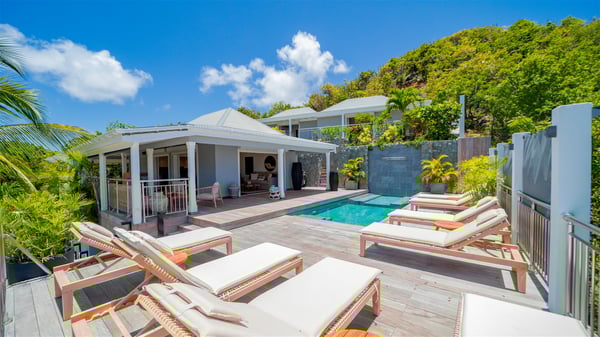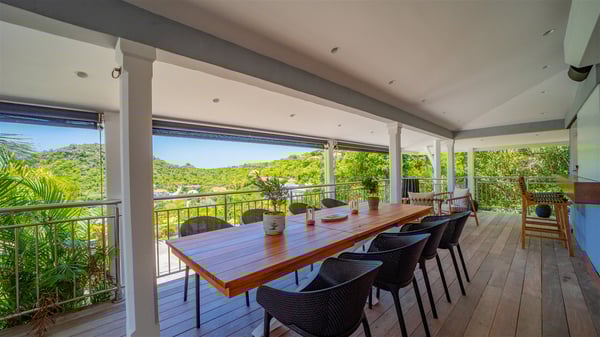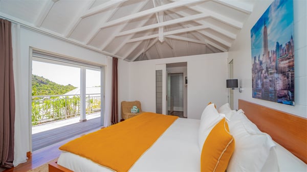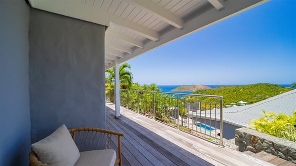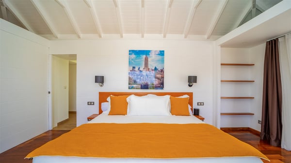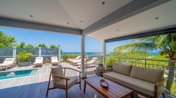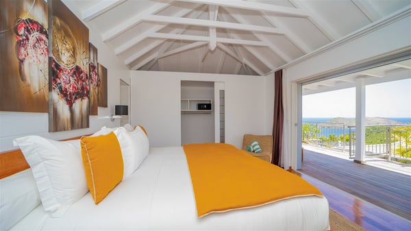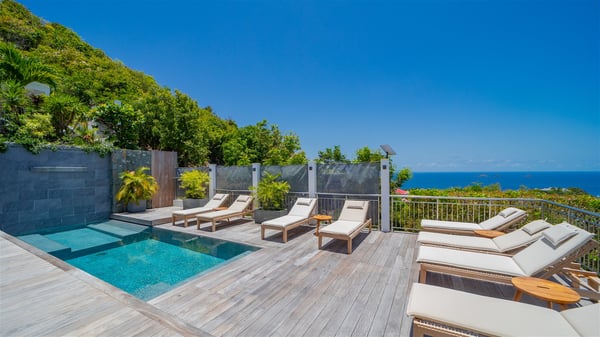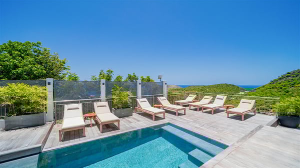 Located on the heights of Flamands, villa Lenalee is a sumptuous four-bedroom property with a splendid panoramic view over the ocean and the hills. This luxurious house is the perfect place for a family or a group of friends looking for an unforgettable stay in St-Barths. Built over two levels, the vacation rental Villa Lenalee in St-Barth welcomes guests in a most refined and contemporary elegance. Widely open onto the outside, Lenalee offers superb views over the ocean and the lush Caribbean vegetation. The fully air-conditioned living room is finely decorated with bright hints around a white sofa and flat-screen TV in front of a wide bay window overlooking the terrace. The indoor dining room for eight guests is close to the well-equipped kitchen with a breakfast bar. On the walls, lovely paintings bring a colourful and shimmering touch to this very cozy home where you will enjoy relaxing in utmost luxury. The terrace of Villa Lenalee features a covered area with a second dining room for eight, perfect for al fresco dinners in the gentle trade winds. There is a comfortable outdoor living room with armchairs and a coffee table under this shaded area where the ocean view is stunningly beautiful. On the side, you will find a beautiful crystal-clear swimming pool with a dream waterfall. All around the pool, there are sunbeds covered with cushions, perfect to relax or sip a cocktail at any time. In front of the horizon, St. Barths’ beauty merges with the sparkling ocean, under the deep blue sky. Villa Lenalee consists of four air-conditioned bedrooms with king-size beds, TVs and en-suite bathrooms with walk-in showers over three levels. In a soft decor with soothing yellow hints, there are two bedrooms on the main level, with amazing views over the ocean and the lush vegetation. The very comfy third one is on the lower level, accessible via a staircase, while the fourth is on the lowest one, accessible from the parking. All are spacious and well-furnished. You’ll also find a well-equipped fitness room on the lowest level. In a paradise setting in the middle of the palm trees, villa Lenalee welcomes groups and families looking for an exclusive vacation in St-Barths, right in front of the ocean.