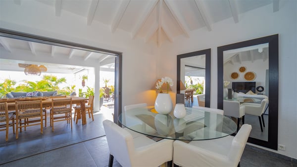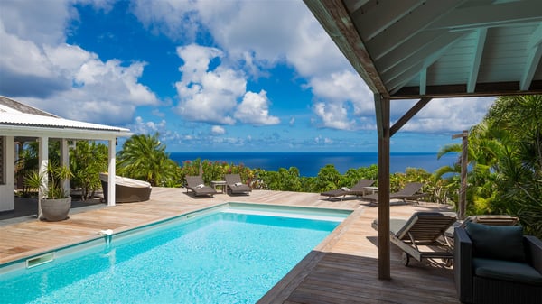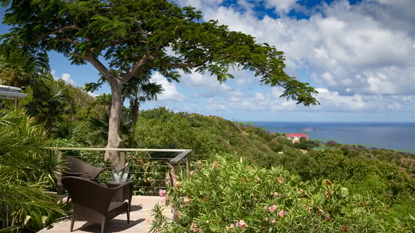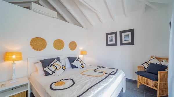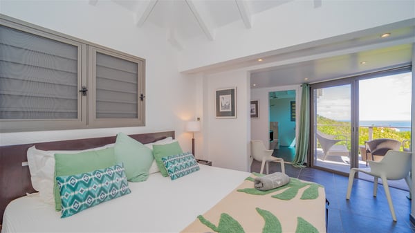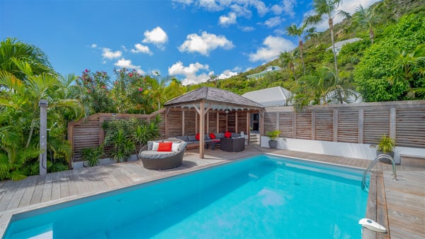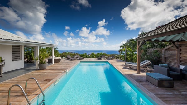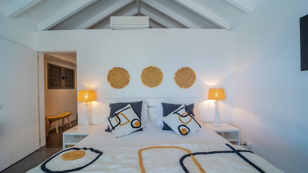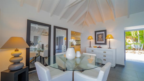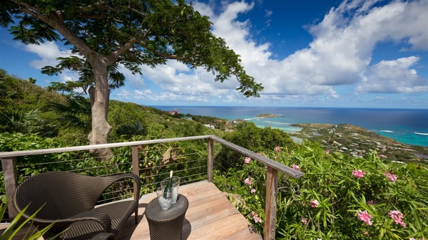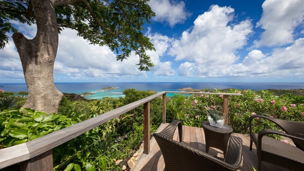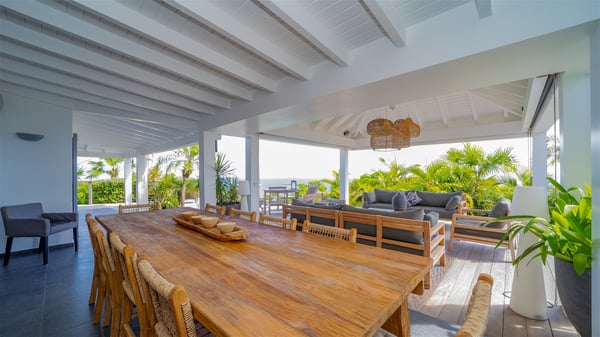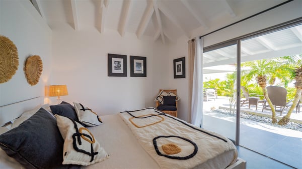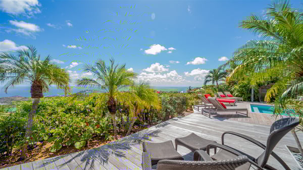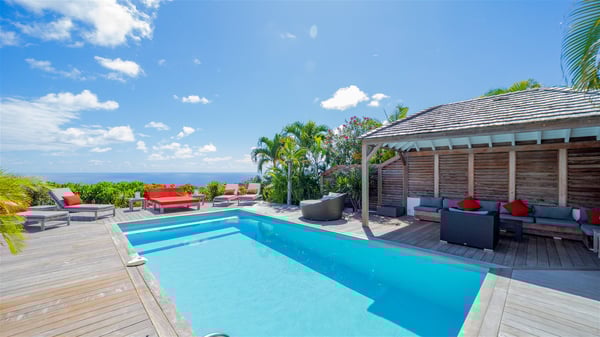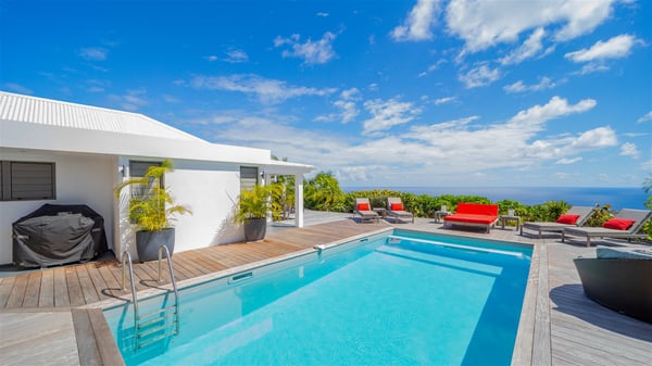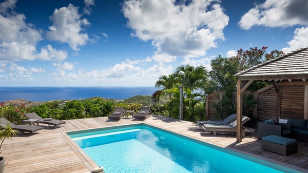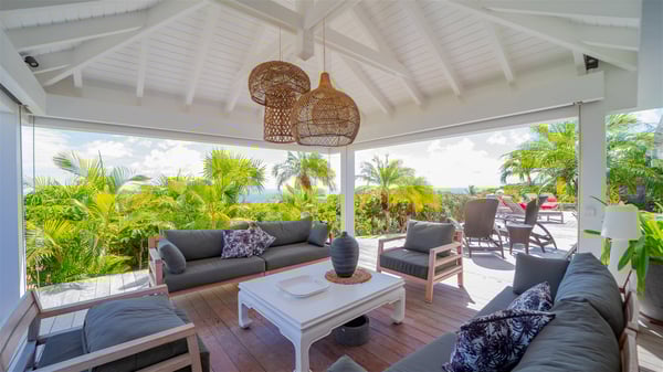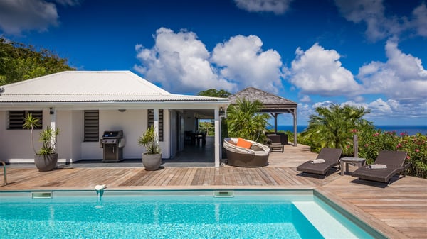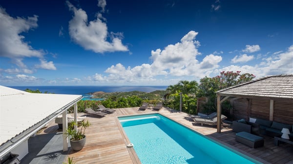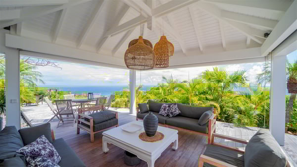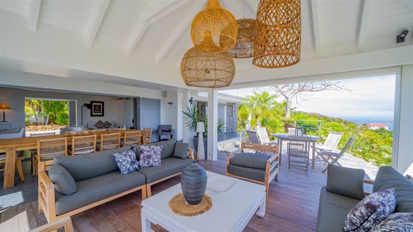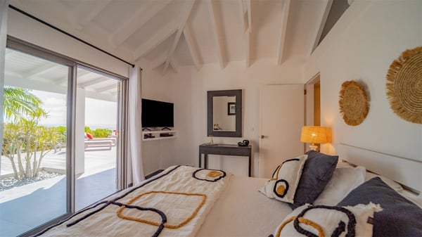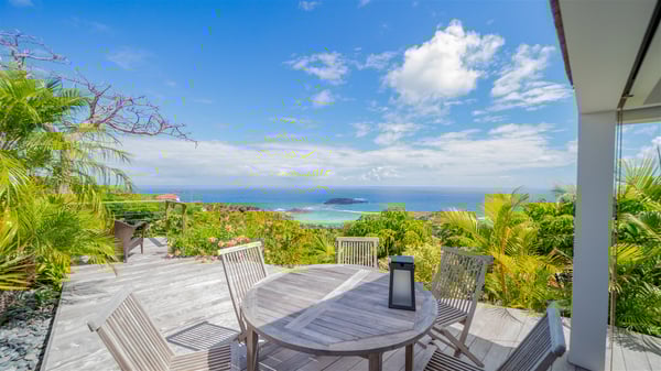 Located on a hilltop above Devé, the rental villa in St. Barths Manonjul is a beautiful property with fantastic views over the ocean and glorious sunsets. This very private and comfortable three air-conditioned-bedroom vacation home welcomes guests in a peaceful and gentle atmosphere, a perfect place for a group of friends travelling together in St. Barths. Recently built, villa Manonjul is a single-story vacation villa with breathtaking panoramic views over Marigot and Grand-Cul-de-Sac. This well-equipped splendid property enjoys the gentle tropical breezes in a most relaxing atmosphere. The lounge is furnished with large white sofas under a high vaulted ceiling in a modern and refined decor. A lovely dining room with a glass table and white armchairs is located in this large open-plan living room, next to the very functional kitchen. In a mineral setting, the atmosphere is relaxing, ideal for resting in front of the breathtaking view over the ocean and the foliage of tropical plants. Manonjul's expansive terrace offers upscale amenities perfect for relaxing in the mild Caribbean air. There is a beautiful raw wooden dining room which can accommodate up to eight guests under the covered area for dining alfresco, as well as a comfortable outdoor living room for pleasant moments of reading or talking. The water of the large swimming pool sparkles under the St. Barths sun, making it a truly paradisiac scenery. A second outdoor dining room is also available at one end of the terrace, as well as comfortable benches under the gazebo located near the swimming pool, for times of nap and rest. Palm trees and tropical plants bring the softness of the trade winds blowing through their green foliage. Vacation rental in St. Barths Manonjul has three beautiful air-conditioned rooms with private bathrooms. All are furnished with king-size beds and open onto a private terrace, ideal for enjoying the ocean view at any time of day or night. Upscale amenities and a quiet location make vacation home Manonjul the perfect place for a getaway with friends in St. Barts.