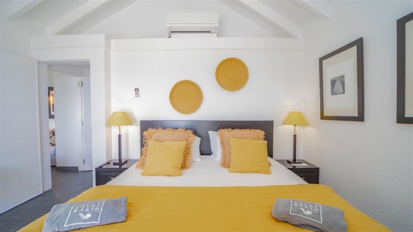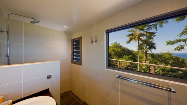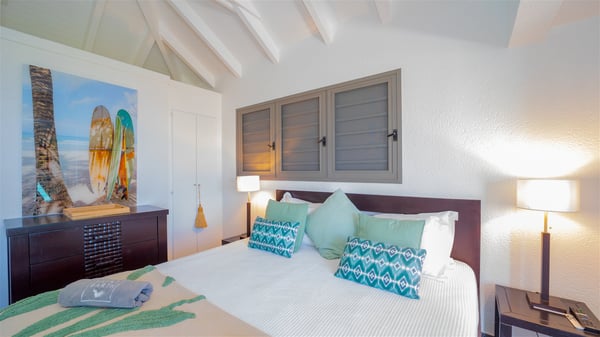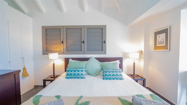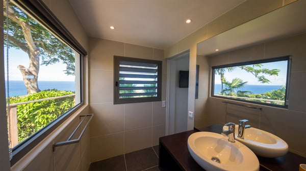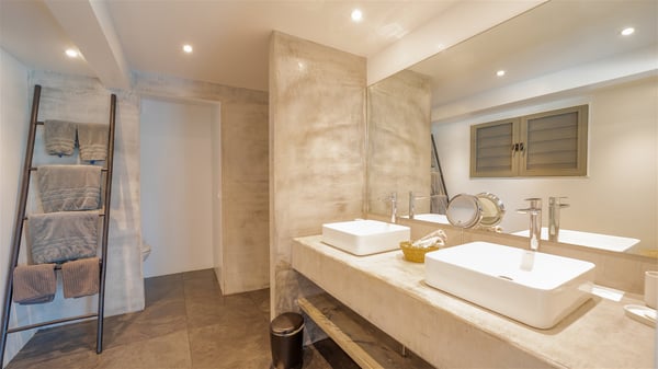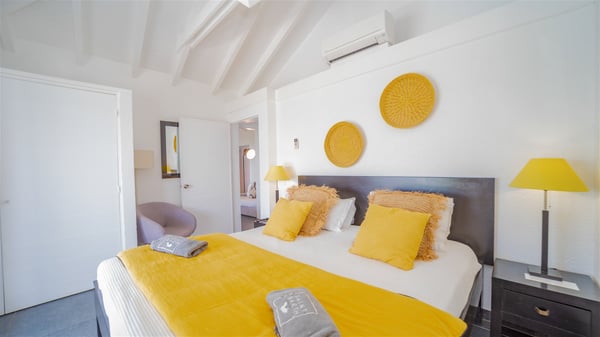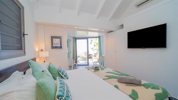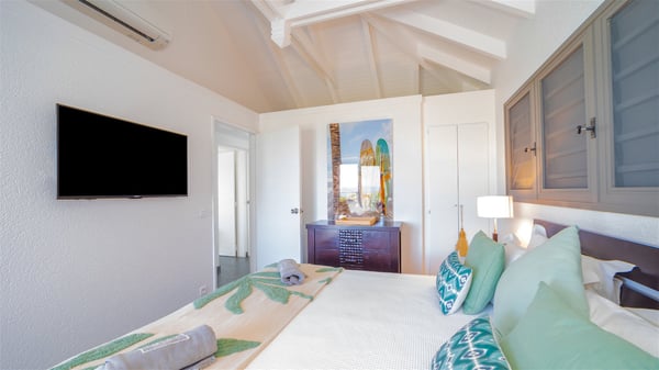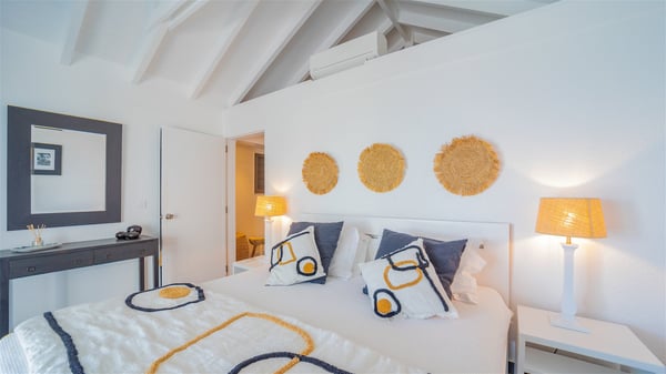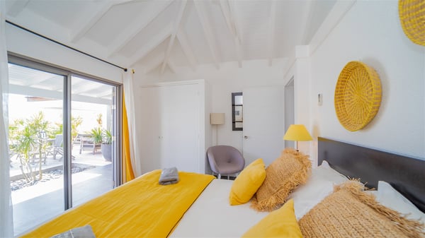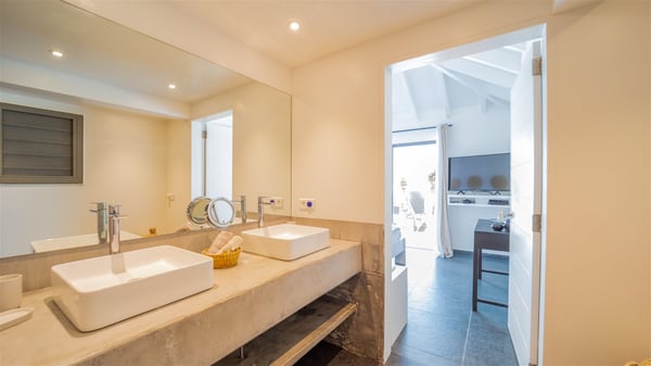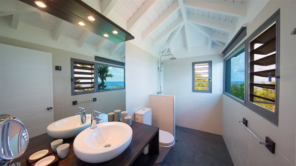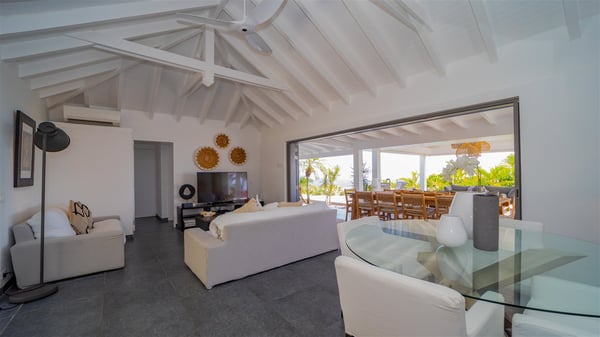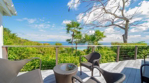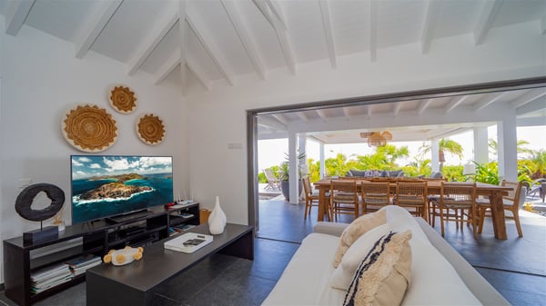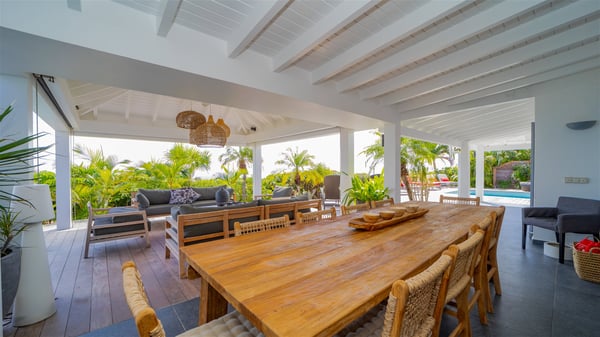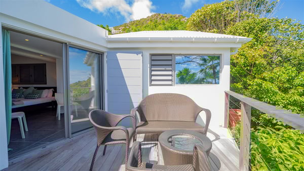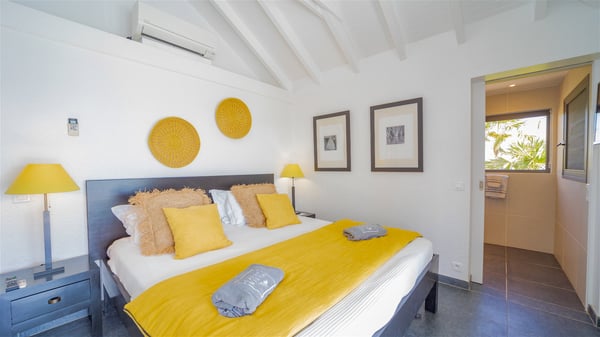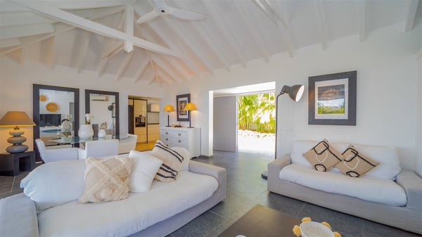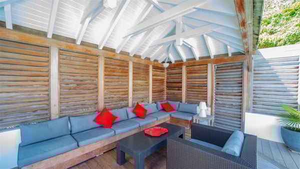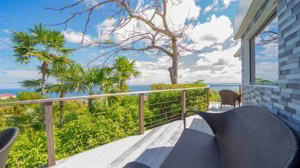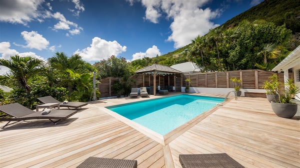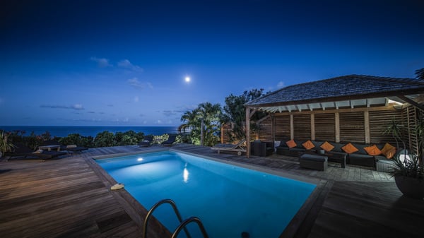 Located on a hilltop above Devé, the rental villa in St. Barths Manonjul is a beautiful property with fantastic views over the ocean and glorious sunsets. This very private and comfortable three air-conditioned-bedroom vacation home welcomes guests in a peaceful and gentle atmosphere, a perfect place for a group of friends travelling together in St. Barths. Recently built, villa Manonjul is a single-story vacation villa with breathtaking panoramic views over Marigot and Grand-Cul-de-Sac. This well-equipped splendid property enjoys the gentle tropical breezes in a most relaxing atmosphere. The lounge is furnished with large white sofas under a high vaulted ceiling in a modern and refined decor. A lovely dining room with a glass table and white armchairs is located in this large open-plan living room, next to the very functional kitchen. In a mineral setting, the atmosphere is relaxing, ideal for resting in front of the breathtaking view over the ocean and the foliage of tropical plants. Manonjul's expansive terrace offers upscale amenities perfect for relaxing in the mild Caribbean air. There is a beautiful raw wooden dining room which can accommodate up to eight guests under the covered area for dining alfresco, as well as a comfortable outdoor living room for pleasant moments of reading or talking. The water of the large swimming pool sparkles under the St. Barths sun, making it a truly paradisiac scenery. A second outdoor dining room is also available at one end of the terrace, as well as comfortable benches under the gazebo located near the swimming pool, for times of nap and rest. Palm trees and tropical plants bring the softness of the trade winds blowing through their green foliage. Vacation rental in St. Barths Manonjul has three beautiful air-conditioned rooms with private bathrooms. All are furnished with king-size beds and open onto a private terrace, ideal for enjoying the ocean view at any time of day or night. Upscale amenities and a quiet location make vacation home Manonjul the perfect place for a getaway with friends in St. Barts.