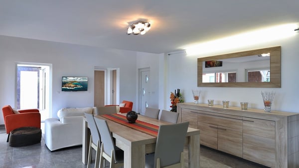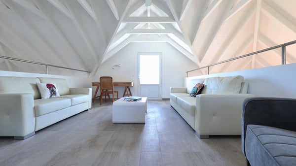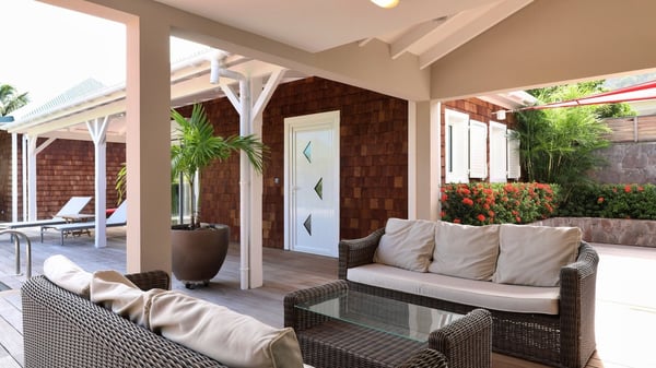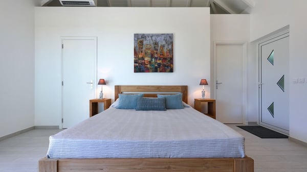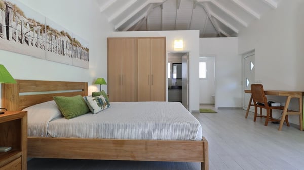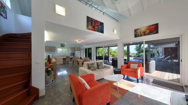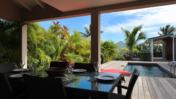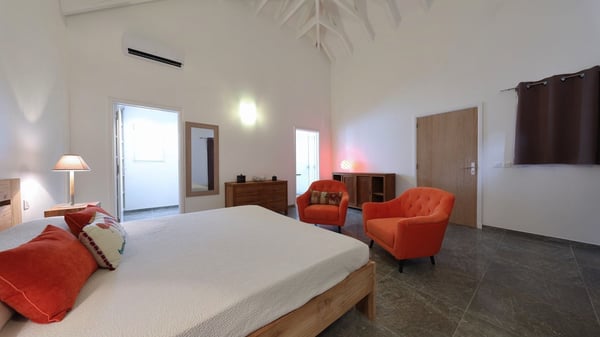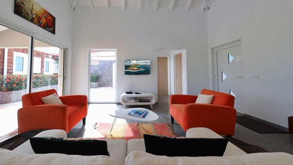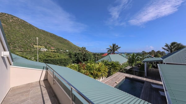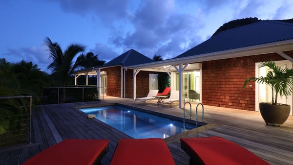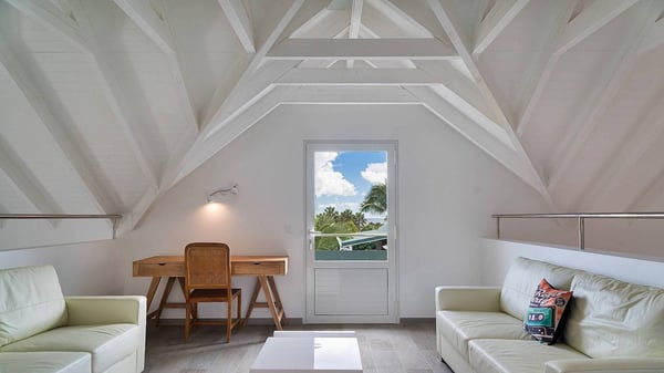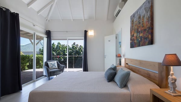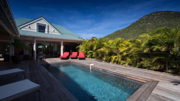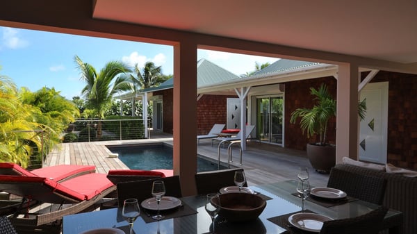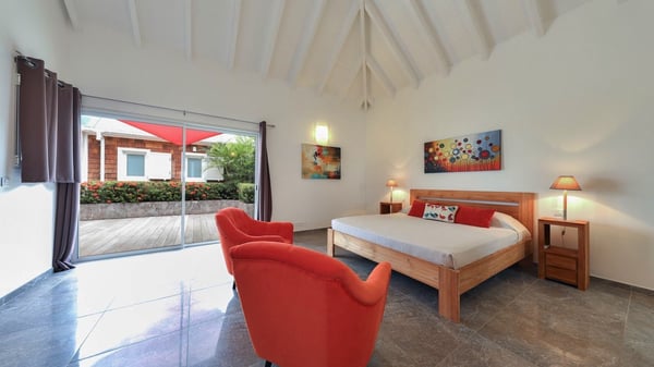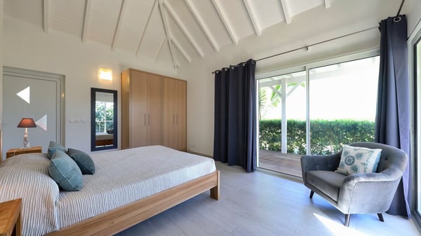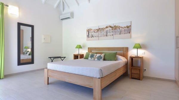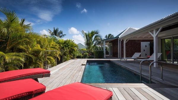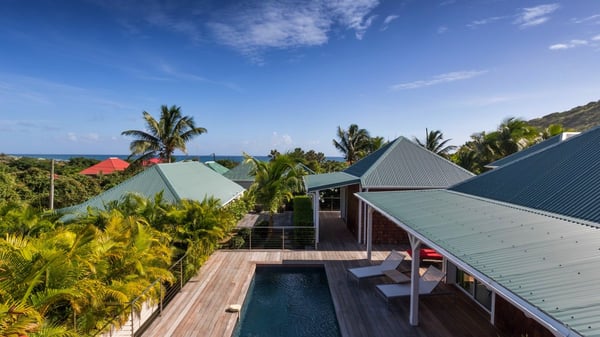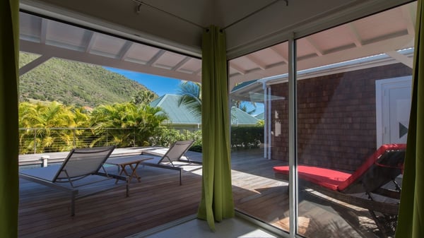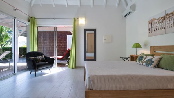 The charming contemporary vacation rental villa Cote Sauvage is located in the quiet and residential area of Grand Fond. It is one of the most preserved areas of the island, and a wonderful playground for runners and walkers along the waterfront. This beautiful Caribbean holiday rental home was recently built in a traditional style, with all the comfort and modernity the place deserves. The layout also provides excellent privacy and quiet. In the main central building, there is a large air-conditioned living room with wood tones and acidic hues, in a both contemporary and stylish way. A second living room with an ocean view is on the mezzanine, under a high vaulted and whitewashed ceiling. The well-equipped bright kitchen opens directly onto the dining room. It features a beautiful rectangular table that can accommodate up to six guests. A dining area is adjacent to the kitchen for breakfast or snack at any time. In the center of the terrace a few steps outside, you’ll be charmed by the beautiful swimming pool surrounded by palm trees and lounge chairs, a perfect setup for sunbathing sessions under the island’s rays of sun. Under the covered terrace, you’ll enjoy the outdoor living room in the St. Barthelemy’s breeze. The elegant and charming villa Cote Sauvage has three beautiful air-conditioned rooms. One is in the main building and the other two occupy independent bungalows around the swimming pool. Each bedroom has a king or queen size bed, a view over the pool or the garden and an en-suite bathroom. With its magnificent tropical garden, this private and spacious villa is the key for paradisiac holidays in a dreamy scenery, where you can swim, sunbath, read and walk around wild landscapes. For large families or groups of friends, the beautiful vacation rental villa Cote Sauvage can be rented with its adjoining and next-door sister villa Wild Blue, to form a group that can accommodate nearly fourteen people, for an unforgettable stay in the Caribbean.