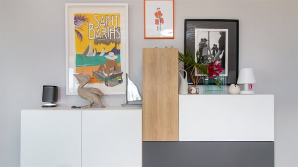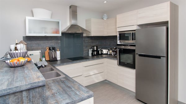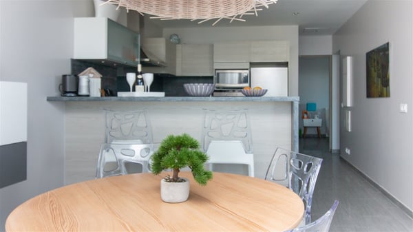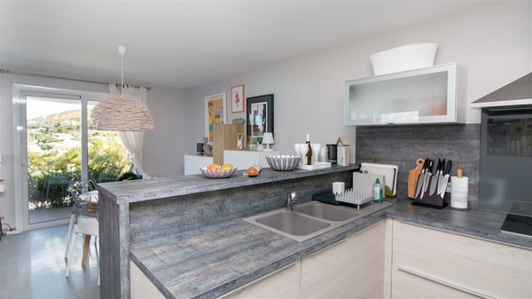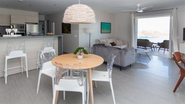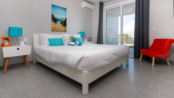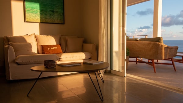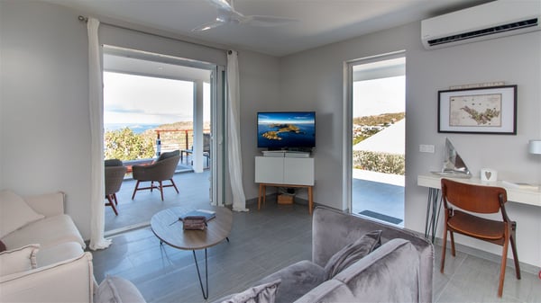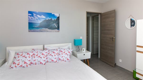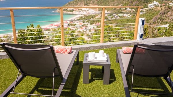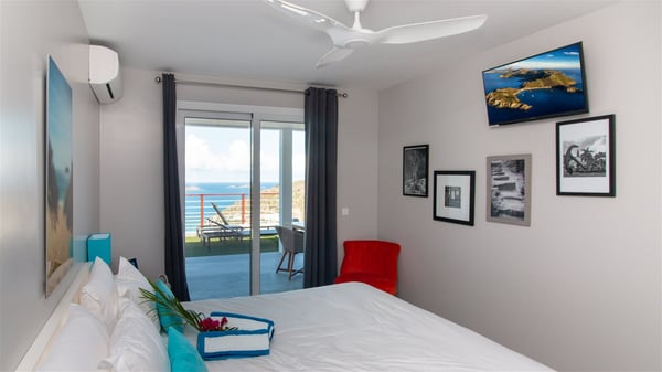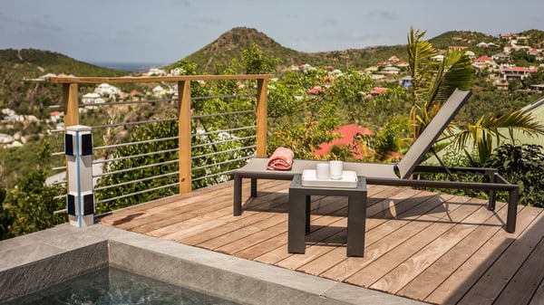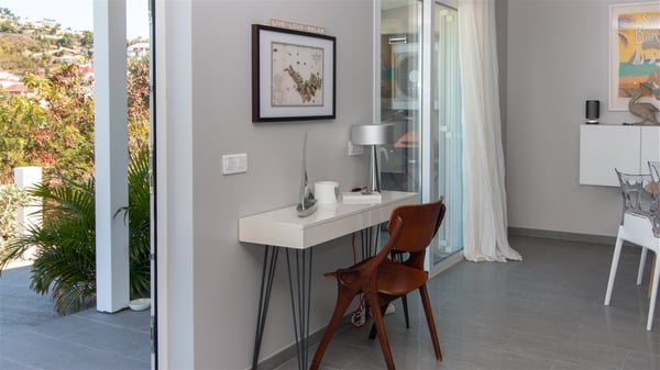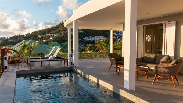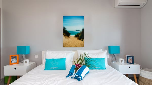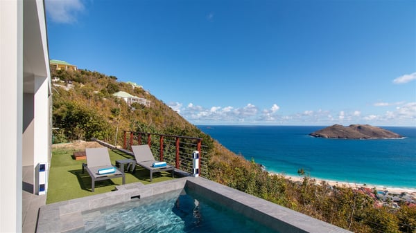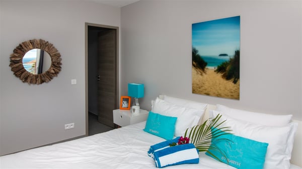 Nearby construction may result in noise disturbances. For further details on how this might affect your stay, please reach out to a Rental Escapes villa specialist. Vacation rental Ouanalao is nestled on the heights of Colombier with a breathtaking view over the Bay of Flamands and Chevreau, Frégate and Toc islands. This two-bedroom comfortable home is the ideal place for a family stay in Saint Barths. Located in a new residence, vacation villa Ouanalao is a very private property with a contemporary comfort mixed with traditional Caribbean touches. The air-conditioned living room is decorated with traditional materials in a maritime theme, and is furnished with soft sofas facing the view over the terrace and the ocean. The dining room can accommodate up to four guests around a nice round table and transparent chairs, near the breakfast bar in the well-equipped kitchen. Functional, comfortable and modern, this living space brings guests a delightful sense of well-being where they can relax, read and cook in utmost comfort. The terrace located at the front of the house offers a stunning panoramic view over the ocean and the neighbouring islands. An outdoor dining area with rattan-made chairs is set up under the covered area for delicious barbecued alfresco meals near the outdoor lounge covered with taupe-coloured cushions. In a décor of palm leaves and bougainvillea flowers, there is a lovely swimming pool heated in season for delightful relaxing moments and swimming sessions. Facing the breathtaking view, sunbeds and parasols are all around the pool, in the gentle trade winds. The vacation villa in St. Barths Ouanalao welcomes you in two air-conditioned bedrooms with ocean view and independent access to the terrace and the swimming pool. One bedroom has a king-size bed while the second one is composed of twin beds which can be converted into a king-size bed. The bathroom is shared by both bedrooms, making it an ideal setup for a family. Spacious walk-in closets are also available for a very comfortable stay in St. Barthelemy.