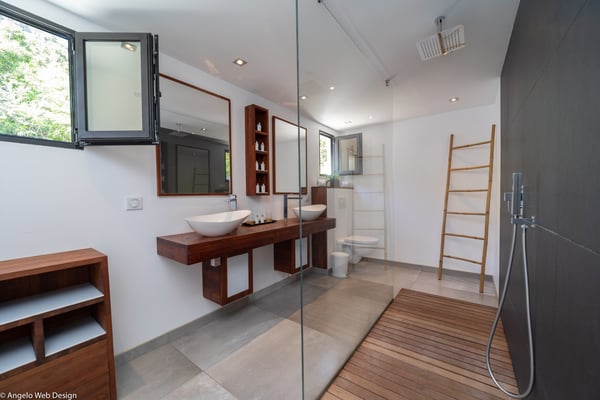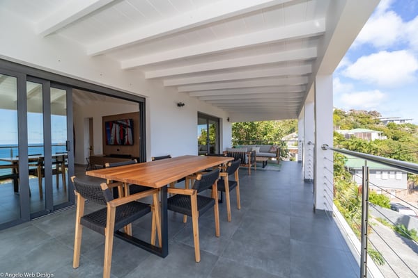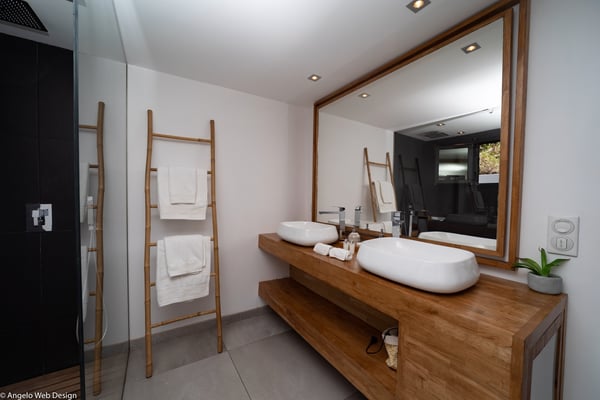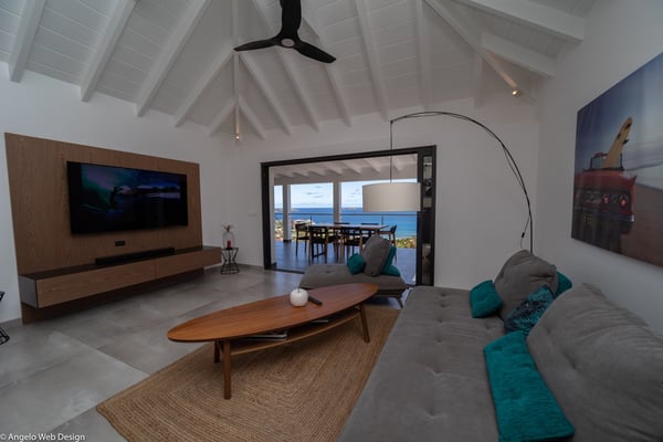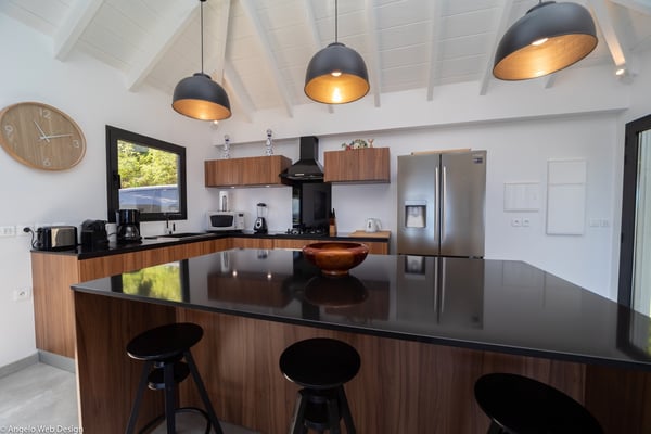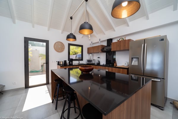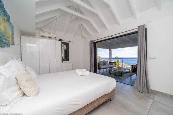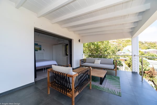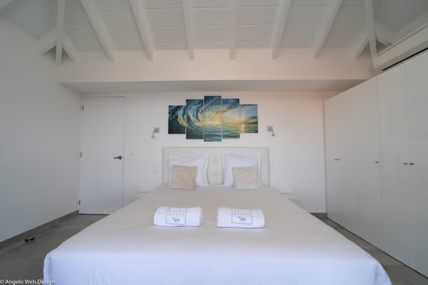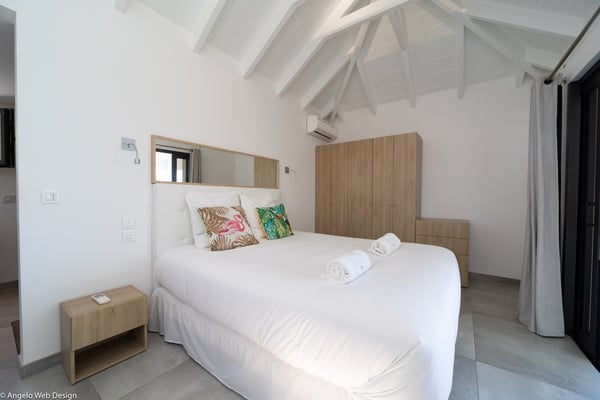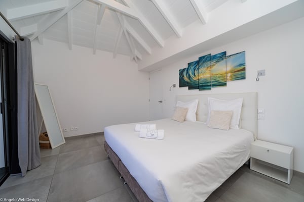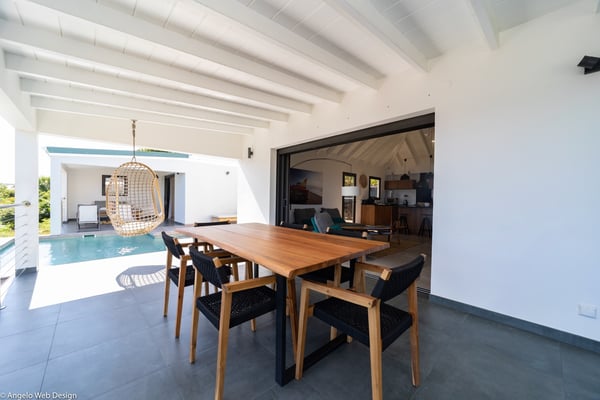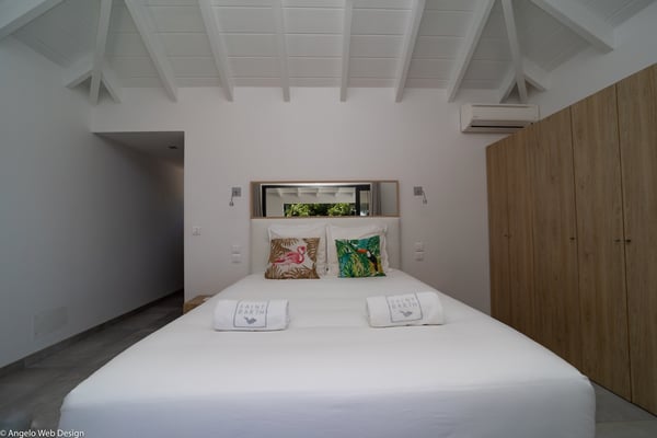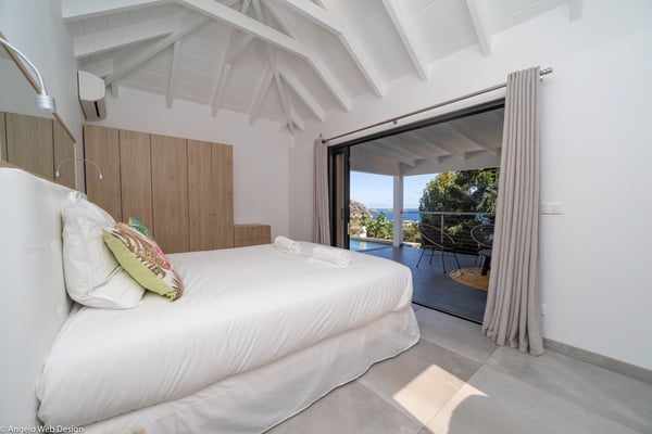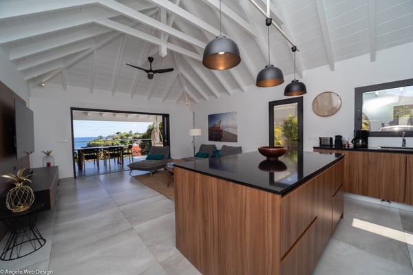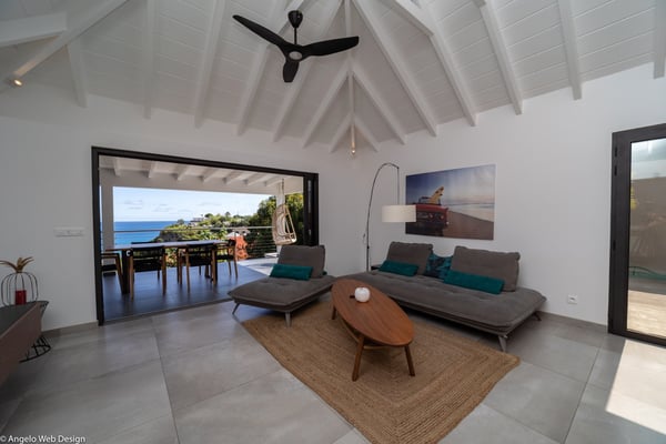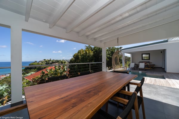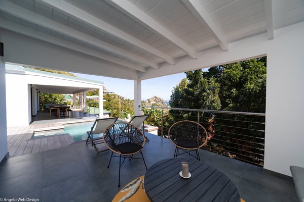 Nestled on a hillside above Anse des Cayes, the charming villa Ride is the perfect vacation spot for a family stay or for two couples travelling together in St. Barths. Very comfortable and private, this home is called Ride because of its owners' passion for surfing, with waves evocations through ocean-inspired pictorial pieces. The rental villa Ride is a contemporary home combining a sleek aesthetic with a pleasant everyday life. The living room is elegantly furnished with a taupe-coloured sofa and a banquette facing the spectacular view over the Caribbean Sea. The lovely, well-equipped kitchen has a breakfast bar around a central island, with wood and glossy black tones matching with the living area surf and beach’s atmosphere. The high vaulted ceiling creates a nice sense of space and volume perfect for relaxing and resting, while the gentle breeze of the trade winds blows through the windows. At the front, there is the dining room with a large wooden table that can accommodate up to eight guests under the covered terrace area. You can relax in the lovely swimming pool located between the main building and the bungalow for cool moments under the island’s sun. A comfortable lounge area with deck chairs and a hanging chair are set up around the pool and under the covered part of the terrace, a perfect spot for reading or playing sessions, or simply lazing around in front of the breathtakingly beautiful view over the Saint-Barts’ deep blue waters. On the side of the house, there is a nice lawn with a barbecue and deck chairs, in a paradisiac tropical setting sheltered from the wind. The vacation home Ride welcomes you and your guests in two beautiful air-conditioned bedrooms with queen-sized beds, en-suite bathrooms and a sea view. One bedroom is located near the living room in the main building, while the second one is in a separate bungalow for maximum privacy. In a lovely surfing and tropical birds-inspired décor, rental villa Ride in St. Barthelemy is a truly enchanting interlude.