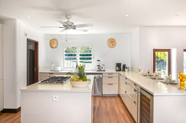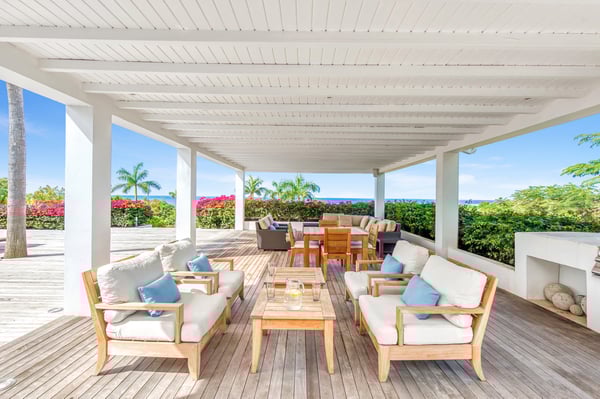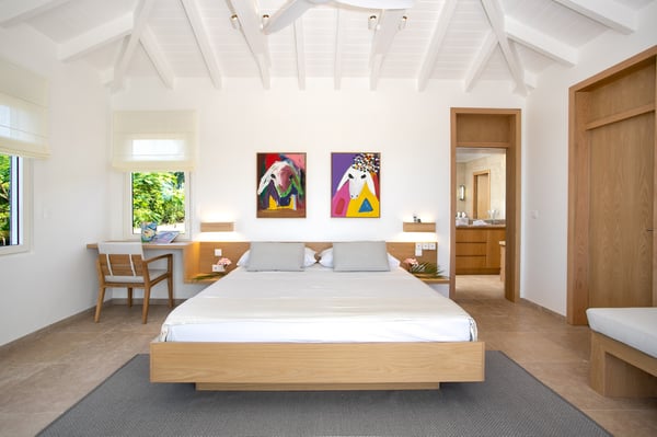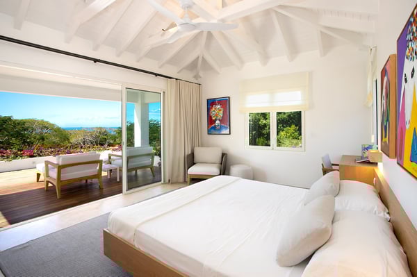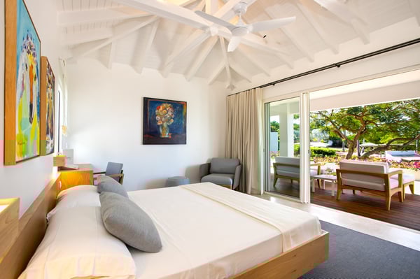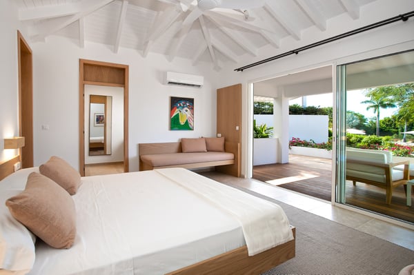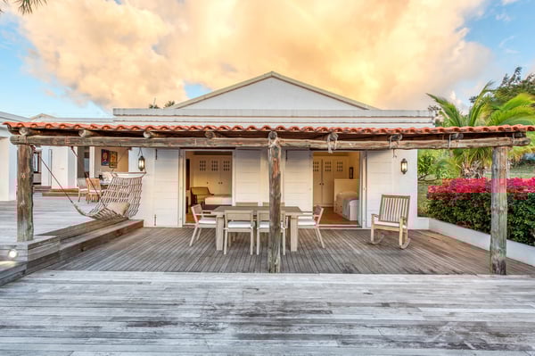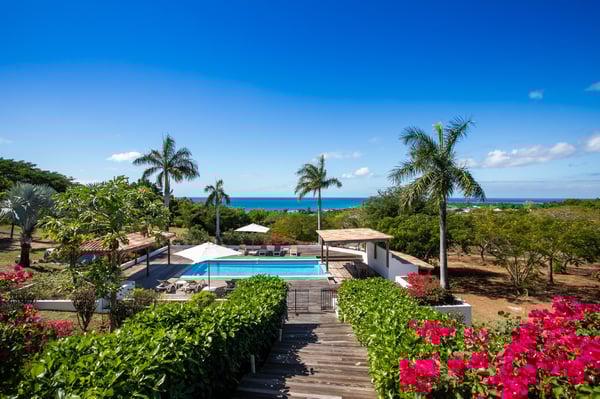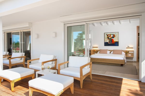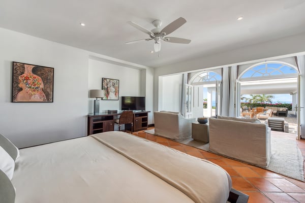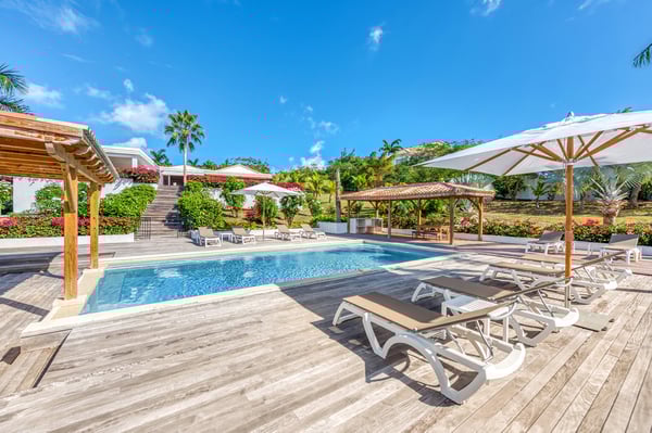 Located in Terres Basses, St. Martin, the elegant Spanish-Caribbean-style Villa La Hacienda is designed to capture the views and maximize outdoor living. The covered courtyard entrance with its Old World wooden doors, tiled floors, and exotic plantings creates the perfect introduction to a stunning tropical view. Framed by royal palms and pink bougainvillea, the view is a panoramic vista filled with shades of blue from the sapphire sea to the deep blue sky; gorgeous in the daytime, spectacular at sunset. Beautifully designed gardens surround the house and terraces. Epi wood decks on multi-levels offer endless options for dining, lounging, and sunning. You can be private or together with your friends or family. Villa La Hacienda's upper deck flows off the main indoor living area. Under wide-covered gazebos, you can lounge, dine, or fire up the barbecue. Step down to the gorgeous lower level for a swim in the inviting pool surrounded by covered terraces and sundecks. The interior great-room, with terracotta floors and dark Spanish-style vaulted ceilings, is cool, breezy, and light. Pocket doors open to the view. Comfortable oversized seating in white and taupe against dark woods set an elegant, low-key atmosphere for lounging and dining. Spanish-inspired doors and windows are featured throughout the house for an exotic touch. The well-equipped new kitchen is sleek and contemporary. Villa La Hacienda is now offering seven bedrooms. Connected to the main building, there is one private casita off the upper deck (Bedroom 1). Spacious and comfortable, each room's decor is a blend of serene whites and tans mixed with dark wood. Charming Spanish style shutters create privacy. This casita has sea and garden views as well as a patio. The gorgeous spa-style bathroom, with walk-in showers, are designed in travertine accented with dark woods. This bedroom offer exterior access only. Bedrooms two and three connect to the interior living space. It's a wonderful setup for children. One room has bunk beds. The adjacent room has a king bed. The two share a spa-style bathroom and a beautiful patio-style terrace. Four newly constructed, modern bedrooms on the right wing, each designed for additional comfort and privacy (Bedroom 4, 5, 6, and 7). These bedrooms feature stunning garden views, ensuite bathrooms with showers, walking closets, and a shared, covered terrace. With this expansion, La Hacienda can now welcome up to 14 guests, making it ideal for larger groups, whether friends or family. In July 2025, Villa La Hacienda expanded its amenities to include a private pickleball court and a basketball hoop: perfect for those who enjoy staying active while on vacation. Although private and secluded, Villa La Hacienda is close to amenities. Long Bay Beach and Cupecoy Beach are only 2 minutes away. It's also a short drive to Porto Cupecoy for grocery shopping and restaurants, including island favorite Mario's Bistro. 5 minutes in the opposite direction, you'll find Baie Nettle's wonderful gourmet restaurants. Another 5 minutes from here and you reach the charming French capital of Marigot with restaurants, shops, and galleries, historic buildings, and the Creole Market. Drive 25 minutes to Grand Case or Philipsburg's shopping haven, while only a 10-minute drive to the international airport.