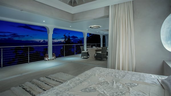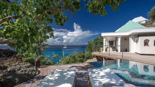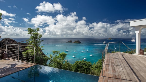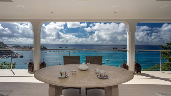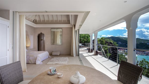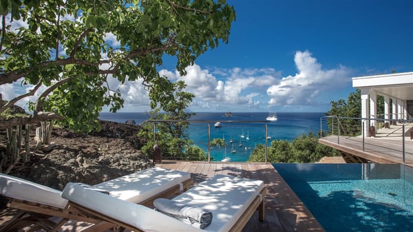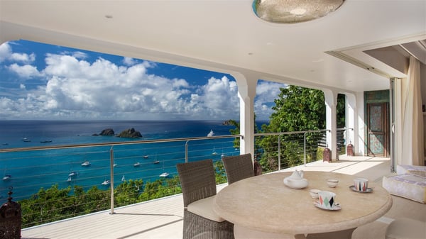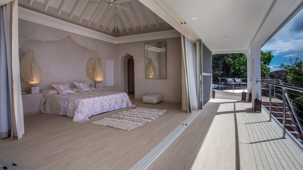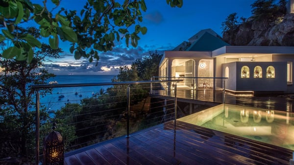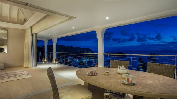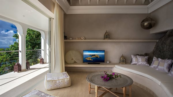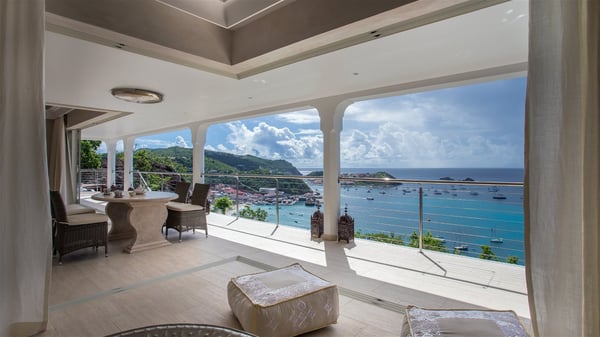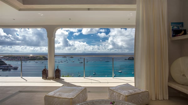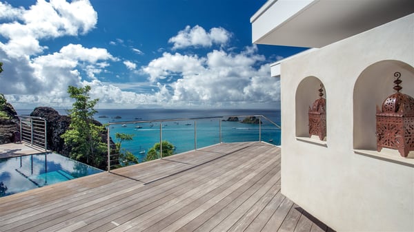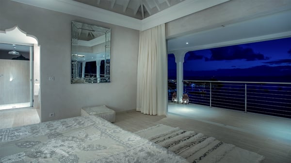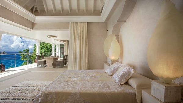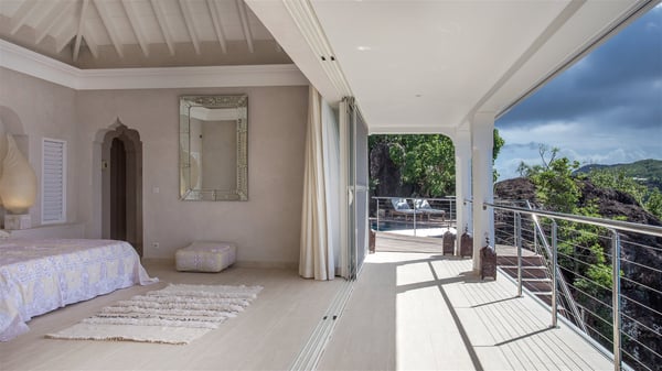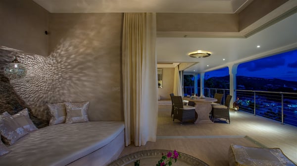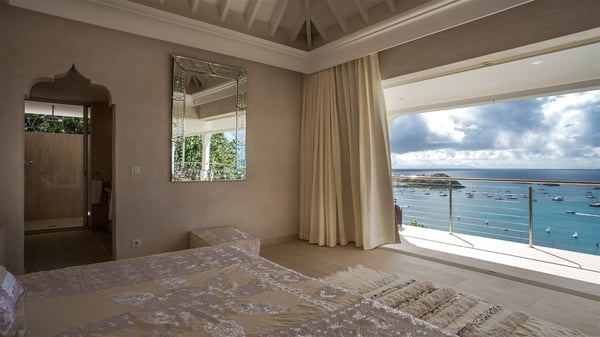 Nestled on the Corossol hillside, the vacation rental Sheherazade is a splendid property opening onto a spectacular view over Gustavia Harbour and Corossol Bay. This very private oriental-inspired house is the ideal destination for a honeymoon in St. Barts or a romantic stay for two. Accessible via a staircase, vacation home Sheherazade is a charming oriental property nestled in the heart of St. Barts’ tropical nature. The typical living room features a white sofa covered with satin cushions and benches built into the rock. The dining area adjoins the living room and welcomes you around a beautiful round table facing the outstanding panorama over the port and the ocean. The kitchen is well equipped in a refined oriental décor. The living room is completely open-plan and has lovely curtains to create more private areas in a very cozy atmosphere. The terrace opens onto a breathtakingly beautiful panorama. At the front, the covered terrace stretches across the width of the villa, like a promenade swept by the trade winds. On the side of the villa, there is an elegant layout around the infinity swimming pool that seems to merge with Saint Barths’ deep blue waters. In the shade of mature trees in a mineral setting, you’ll enjoy lounge chairs perfect for reading or relaxing sessions in this cozy space, soundtracked with speakers. The view over the glowing red sunsets and the passing yachts sailing on the ocean creates a peaceful, timeless atmosphere. Ideal for a couple or for a honeymoon, the luxurious villa Sheherazade has a beautiful air-conditioned room with a breathtaking ocean view. It opens onto the living area and can be privatized with beautiful sliding curtains that create a very private atmosphere. It features a king-size bed and an en-suite bathroom with an outdoor shower, a perfect setup to breathe the delicious island air. The cream-coloured hints and satin touch of the oriental-inspired fabrics bring a luxurious feeling in this very exclusive suite. There is a romantic ambiance reminiscent of the magic of Oriental nights, a fabulous scenery for your next stay for two in St. Barts.