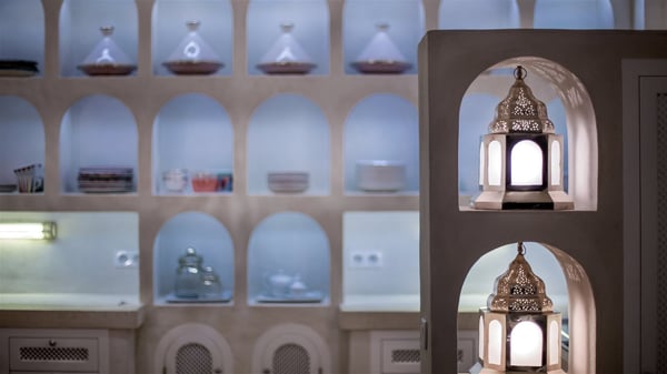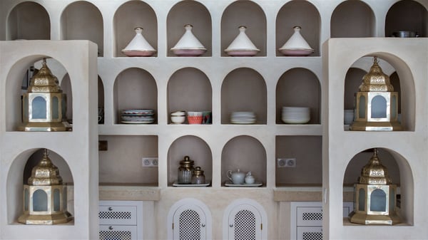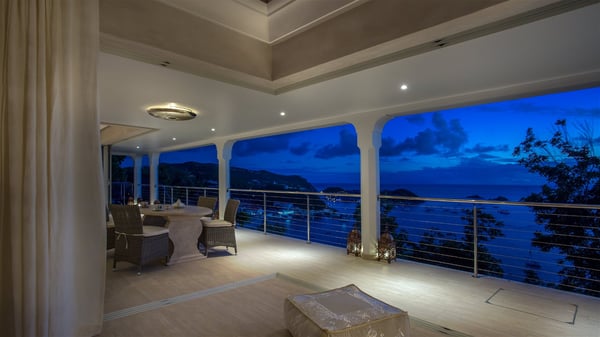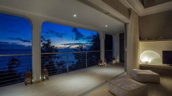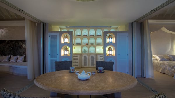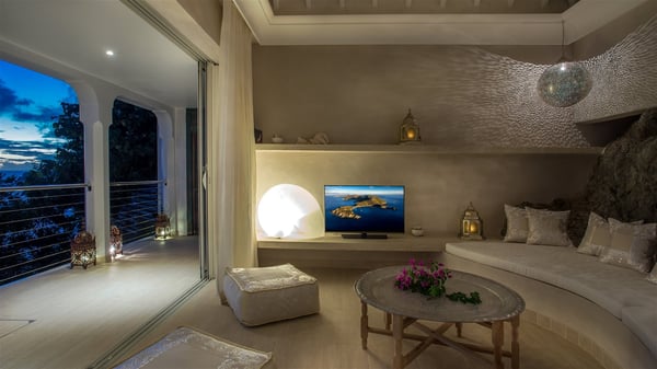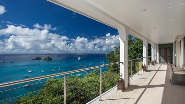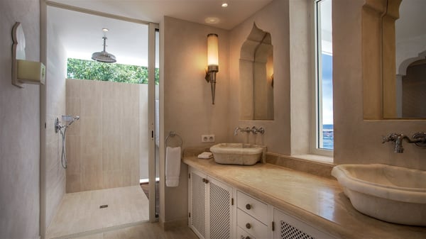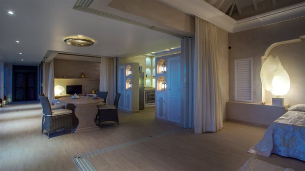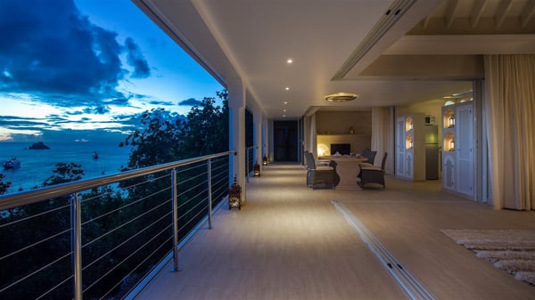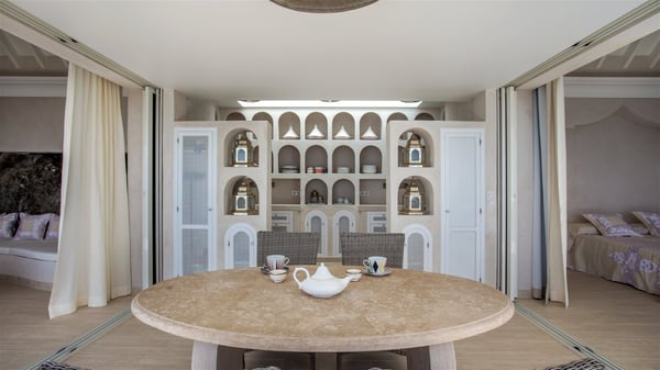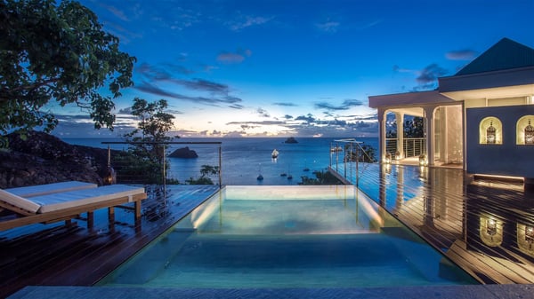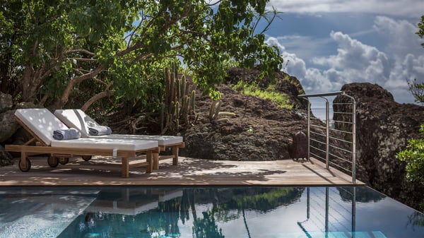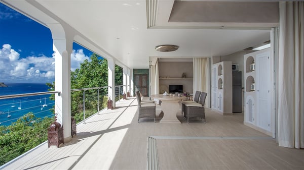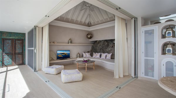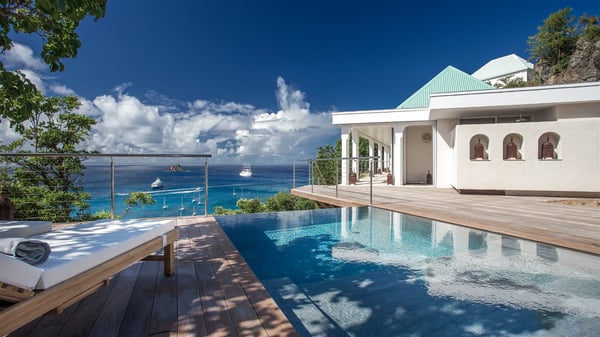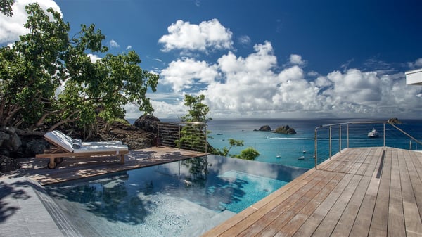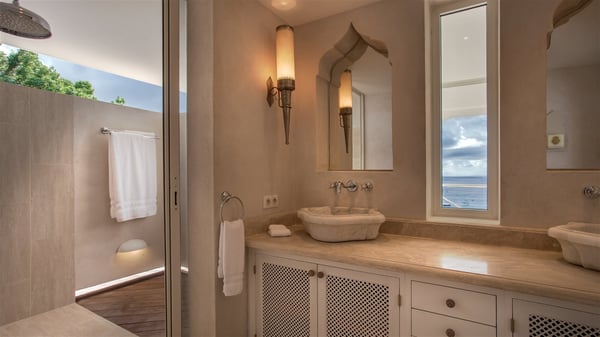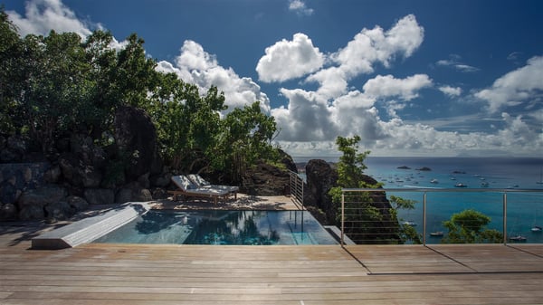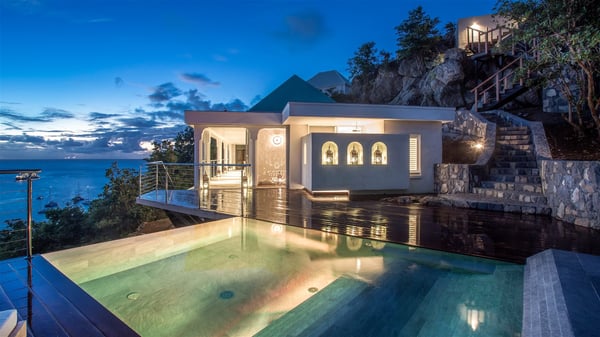 Nestled on the Corossol hillside, the vacation rental Sheherazade is a splendid property opening onto a spectacular view over Gustavia Harbour and Corossol Bay. This very private oriental-inspired house is the ideal destination for a honeymoon in St. Barts or a romantic stay for two. Accessible via a staircase, vacation home Sheherazade is a charming oriental property nestled in the heart of St. Barts’ tropical nature. The typical living room features a white sofa covered with satin cushions and benches built into the rock. The dining area adjoins the living room and welcomes you around a beautiful round table facing the outstanding panorama over the port and the ocean. The kitchen is well equipped in a refined oriental décor. The living room is completely open-plan and has lovely curtains to create more private areas in a very cozy atmosphere. The terrace opens onto a breathtakingly beautiful panorama. At the front, the covered terrace stretches across the width of the villa, like a promenade swept by the trade winds. On the side of the villa, there is an elegant layout around the infinity swimming pool that seems to merge with Saint Barths’ deep blue waters. In the shade of mature trees in a mineral setting, you’ll enjoy lounge chairs perfect for reading or relaxing sessions in this cozy space, soundtracked with speakers. The view over the glowing red sunsets and the passing yachts sailing on the ocean creates a peaceful, timeless atmosphere. Ideal for a couple or for a honeymoon, the luxurious villa Sheherazade has a beautiful air-conditioned room with a breathtaking ocean view. It opens onto the living area and can be privatized with beautiful sliding curtains that create a very private atmosphere. It features a king-size bed and an en-suite bathroom with an outdoor shower, a perfect setup to breathe the delicious island air. The cream-coloured hints and satin touch of the oriental-inspired fabrics bring a luxurious feeling in this very exclusive suite. There is a romantic ambiance reminiscent of the magic of Oriental nights, a fabulous scenery for your next stay for two in St. Barts.