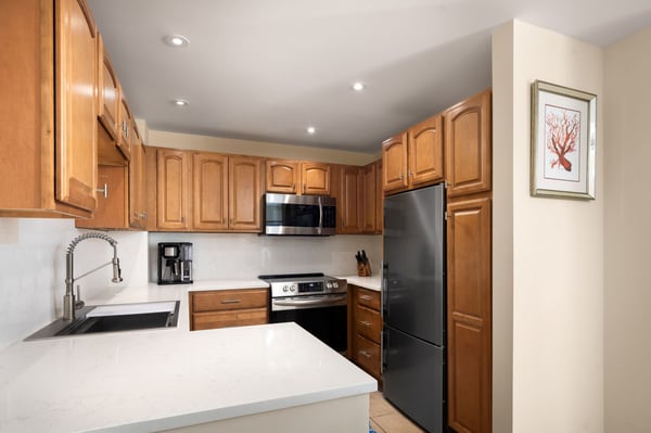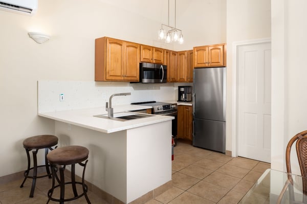 Nestled in a tropical setting with just 24 bungalows surrounding a lovely courtyard pool and hot tub, this bungalow offers privacy and value. Upon entering the bright and airy living room, guests are greeted by 14’ ceilings, an open floorplan, ceramic tile and casual furnishings, including a queen-size sleeper sofa. Meal preparation is easy in the well-equipped, full kitchen with quartz countertops and stainless appliances. A king-size pillow-top bed, Carrara marble double vanity and a glass shower highlight the master suite. Guests also enjoy the convenience of an in-suite washer/dryer. Situated on the second level, this walk-up bungalow has sliding glass doors which open to a petite balcony overlooking the resort grounds. The 1 Bedroom Bungalow is located in buildings 5, 6 & 7, just a 2-minute stroll to Windsong's beach and dining.