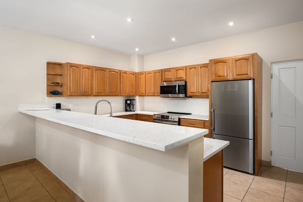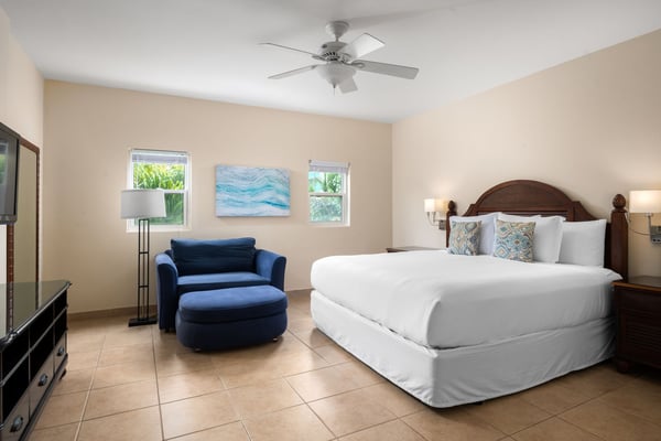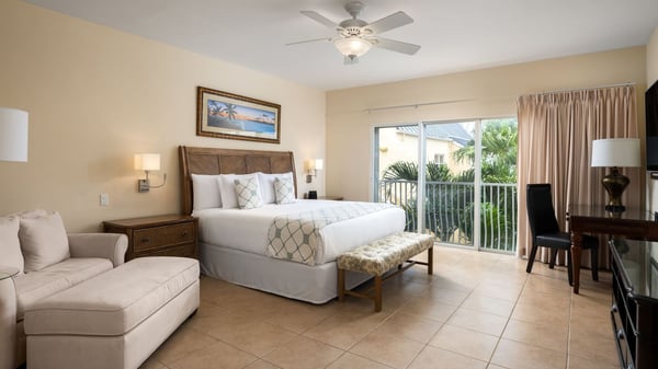 With a private entrance, 3 bedrooms, and an open living room design with a queen-size sleeper sofa, this expansive bungalow is perfect for families or for sharing with friends. Nestled in a tropical setting with just 24 bungalows surrounding a lovely courtyard pool and hot tub, this accommodation offers privacy and value. The well-equipped kitchen has quartz countertops and a stainless refrigerator, range, microwave, and dishwasher. A heavenly king-size pillow-top bed and a large walk-in shower highlight the primary bedroom suite. One guest bedroom offers a king bed, while the second guest room features twin beds in an attached studio with a convenient, additional exterior entrance/exit — perfect for friends or extended family to come and go as they wish. Guests also enjoy an in-suite washer/dryer. Located on the second level, this walk-up bungalow has sliding glass doors which open to a petite balcony overlooking the resort. The 3-bedroom Bungalow is located in building 5, and is a stroll to the beach and dining.