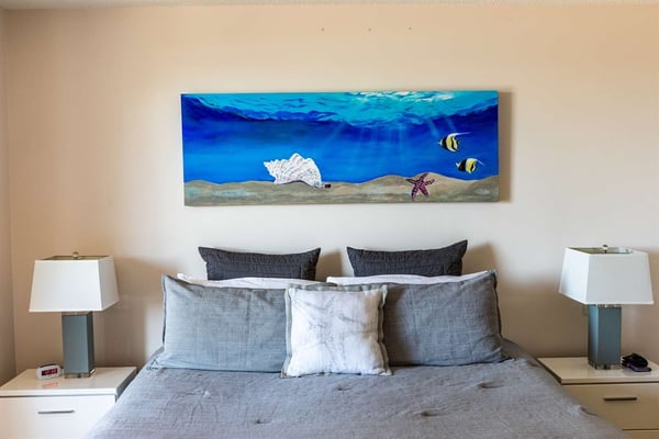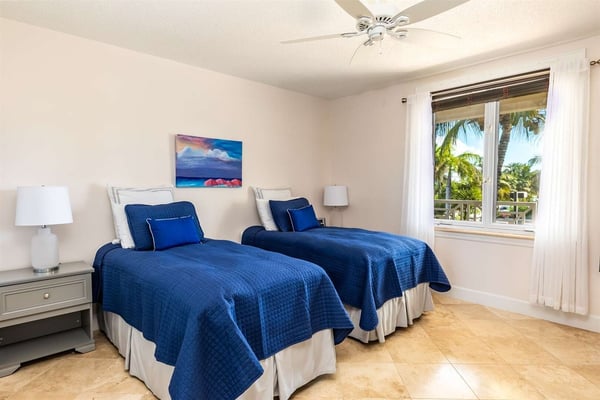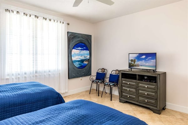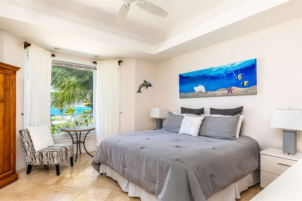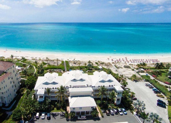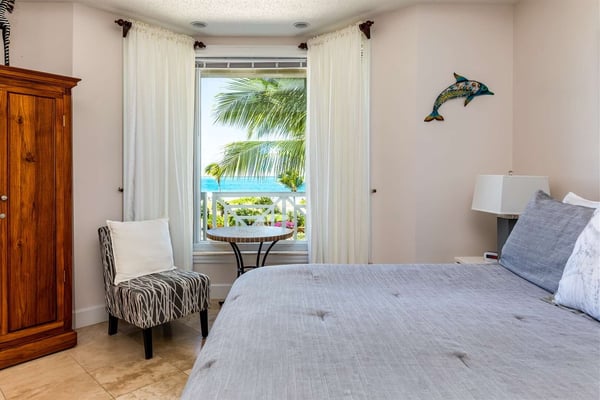 The Grandview is a boutique, private condominium building of 18 units located in an exclusive enclave overlooking beautiful Grace Bay, rated the best beach in the Caribbean. Guests enjoy the pristine and quiet environment, complete with beautiful gardens, an inground pool and a hot tub. Direct access is provided to the expansive beachfront, beach umbrellas and lounge chairs, and of course, the sparkling turquoise waters. Grandview is family-friendly and unique – many guests return time and time again. Our completely refurbished, two-bedroom, two-bathroom oceanfront condominium offers our guests the finest in Caribbean vacationing. It boasts a large, fully equipped kitchen with up-to-date appliances, including a wine fridge and washer/dryer. The expansive, contemporary living/dining area leads to a large, covered terrace, equipped with a dining table and chairs (seating for six), lounge chairs and a full-sized barbecue. Enjoy tropical breezes and mesmerizing views of Grace Bay’s turquoise waters. Sip your morning coffee in the relaxing, peaceful surroundings; take in the breathtaking evening sunsets. Whether indoors or on the terrace, dining or relaxing…. all offer the same wonderful direct ocean views and sounds. And these same views are available from the master bedroom as well! You have full access to the on-site gym, currently undergoing renovation. We also provide beach toys, kayaks, paddleboards and bicycles. Guest parking is on the property within enclosed secure gating. The building is within walking distance to a number of restaurants and shopping, including a gourmet grocery store. The listed prices are for occupancy of 5. The second bedroom includes twin beds, which can be converted to a king bed. The fifth person can be accommodated with a roll-away cot (suitable for teens and younger as it sits low to the ground). A pack-and-play is also available.