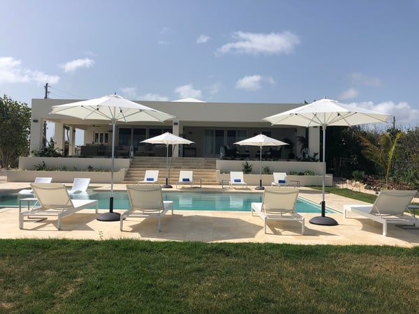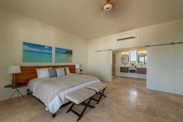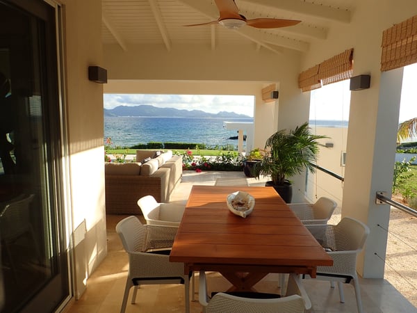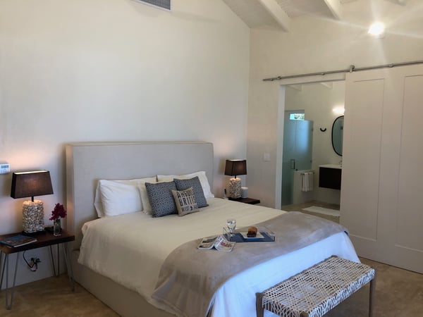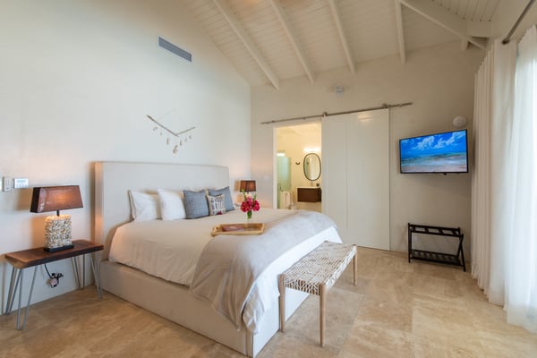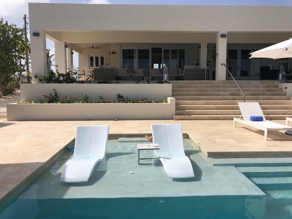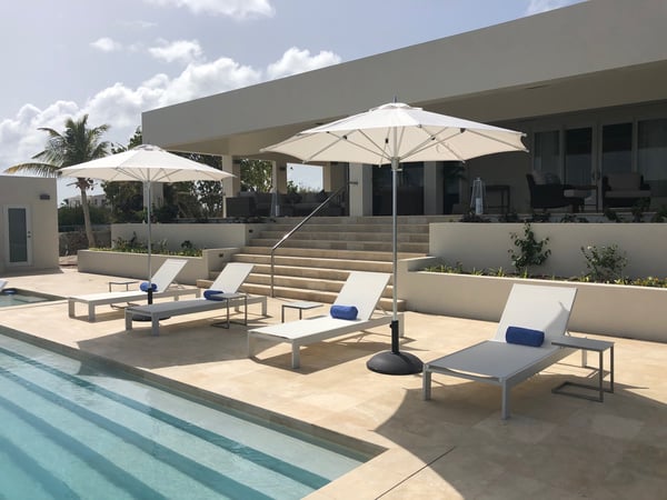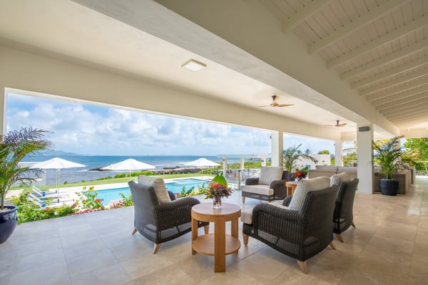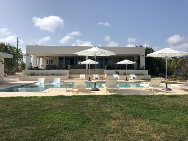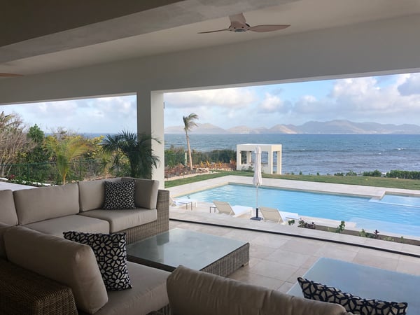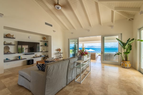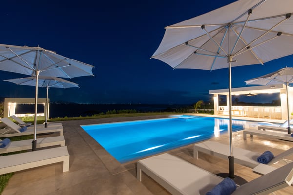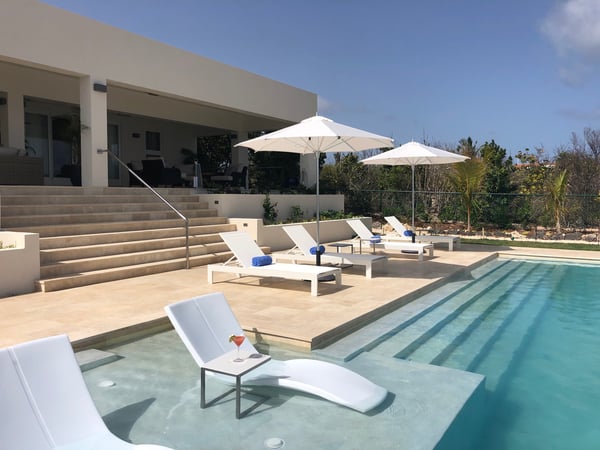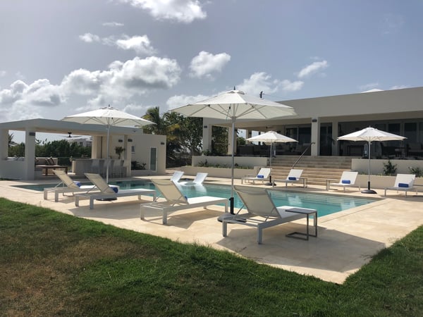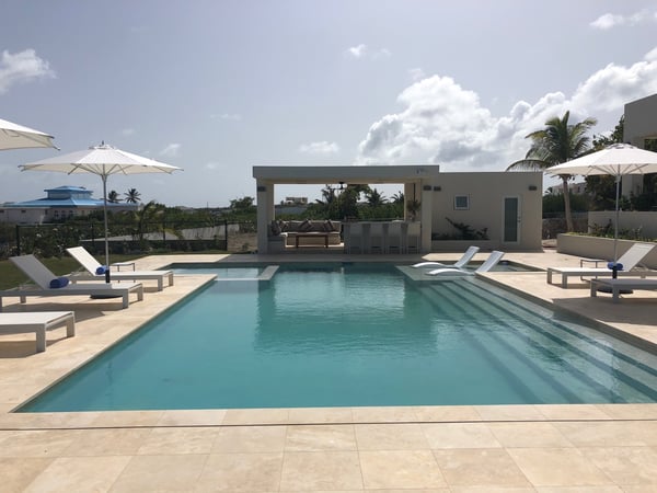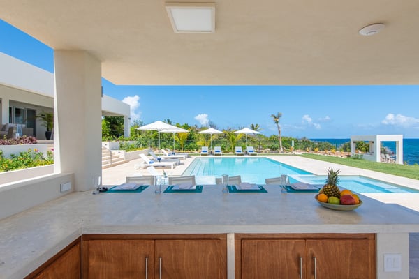 Round Rock Estate is a contemporary six-bedroom villa on the idyllic island of Anguilla. Completely renovated in 2019, no expense was spared to make the most of the breathtaking waterfront location. Located in a quiet part of the island, activities and dining are easily accessible. The villa is five minutes from Rendezvous and the Blowing Point Ferry Terminal is within a short drive. Sit by the private pool under pristine white umbrellas and gaze at the cool Caribbean Sea against the enchanting views of neighbouring St. Martin. Everything you might desire is poolside — covered seating and dining, a heated pool, a poolside bar with an ice maker and fridge, a BBQ grill, ample lounges, and a large terrace. The elevated veranda is outfitted with cushioned furnishings, ceiling fans, and mood lighting for any time of day. A changing room and restroom are available off the pool deck. The comfortably furnished, air-conditioned interiors include wireless internet throughout, a living room with cable TV, a fully equipped gym, and a gourmet kitchen. The kitchen’s Nespresso machine, dishwasher, blender, microwave, toaster, and wine cooler are tucked amongst chic slate cabinetry. Each of the six bedrooms has an ensuite bathroom, screens, a safe, and air-conditioning. The main house’s primary suite has interior and exterior access. Each of the remaining suites has two twin beds that can be made up as a king. Two twin suites are in the main house, one is in the guest cottage, and two are upstairs in the rear building. Work out at the new on-site gym and rock out to the state-of-the-art Sonos home sound system. The villa provides towels, tote bags, and coolers for blissful beach days. Daily housekeeping maintains the villa.