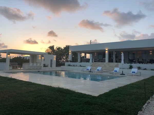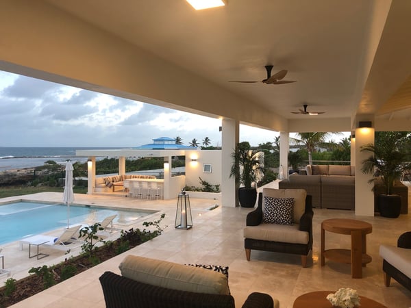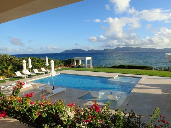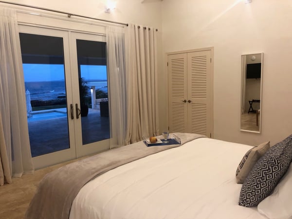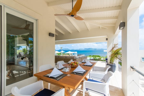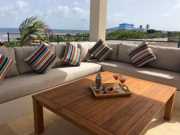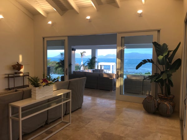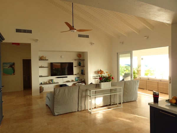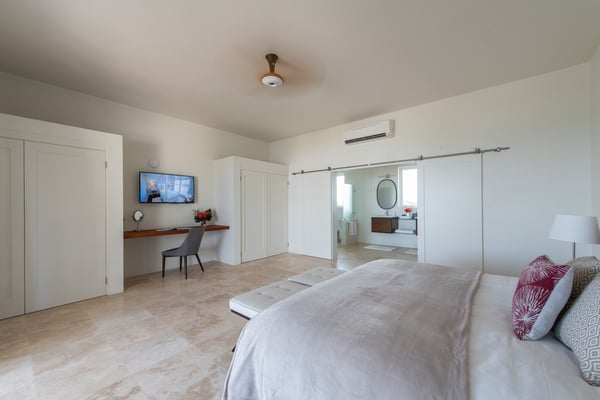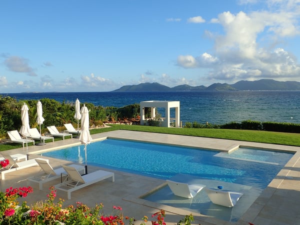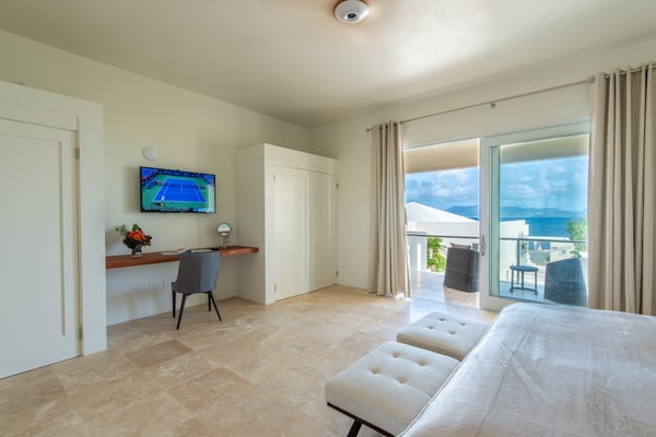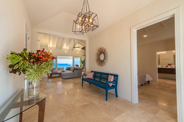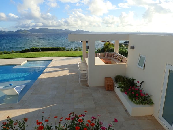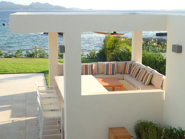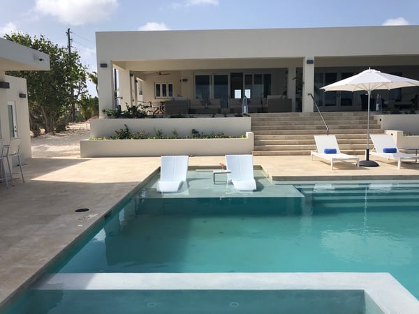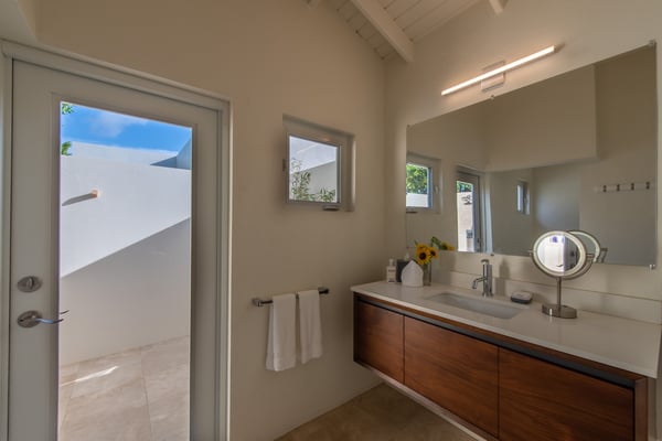 Round Rock Estate is a contemporary six-bedroom villa on the idyllic island of Anguilla. Completely renovated in 2019, no expense was spared to make the most of the breathtaking waterfront location. Located in a quiet part of the island, activities and dining are easily accessible. The villa is five minutes from Rendezvous and the Blowing Point Ferry Terminal is within a short drive. Sit by the private pool under pristine white umbrellas and gaze at the cool Caribbean Sea against the enchanting views of neighbouring St. Martin. Everything you might desire is poolside — covered seating and dining, a heated pool, a poolside bar with an ice maker and fridge, a BBQ grill, ample lounges, and a large terrace. The elevated veranda is outfitted with cushioned furnishings, ceiling fans, and mood lighting for any time of day. A changing room and restroom are available off the pool deck. The comfortably furnished, air-conditioned interiors include wireless internet throughout, a living room with cable TV, a fully equipped gym, and a gourmet kitchen. The kitchen’s Nespresso machine, dishwasher, blender, microwave, toaster, and wine cooler are tucked amongst chic slate cabinetry. Each of the six bedrooms has an ensuite bathroom, screens, a safe, and air-conditioning. The main house’s primary suite has interior and exterior access. Each of the remaining suites has two twin beds that can be made up as a king. Two twin suites are in the main house, one is in the guest cottage, and two are upstairs in the rear building. Work out at the new on-site gym and rock out to the state-of-the-art Sonos home sound system. The villa provides towels, tote bags, and coolers for blissful beach days. Daily housekeeping maintains the villa.