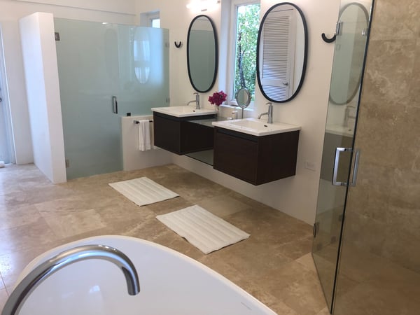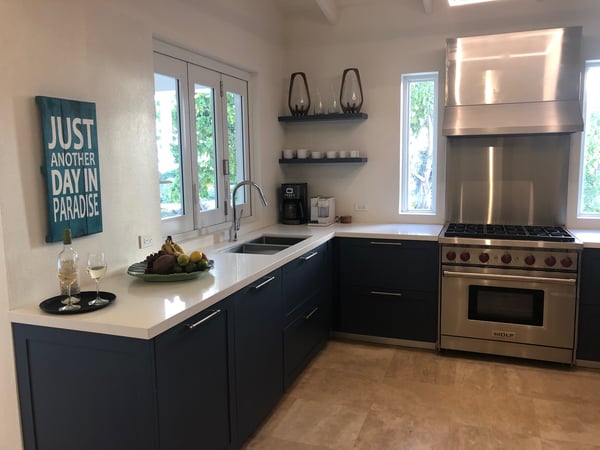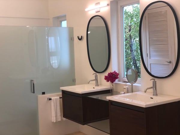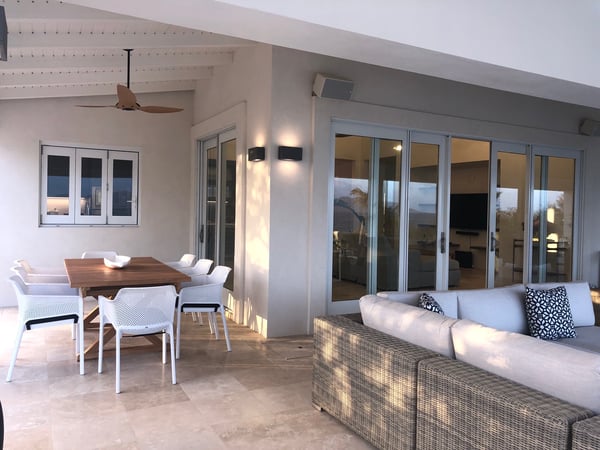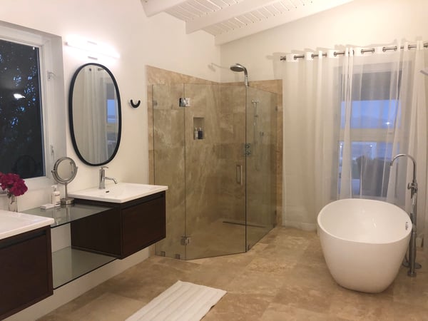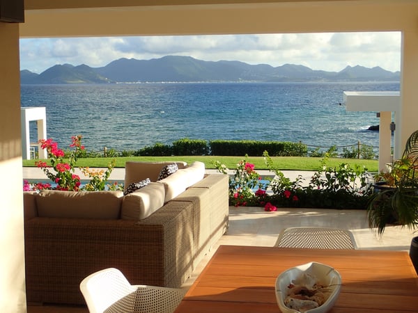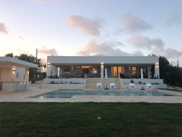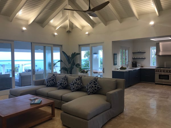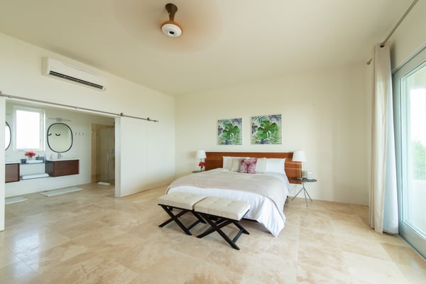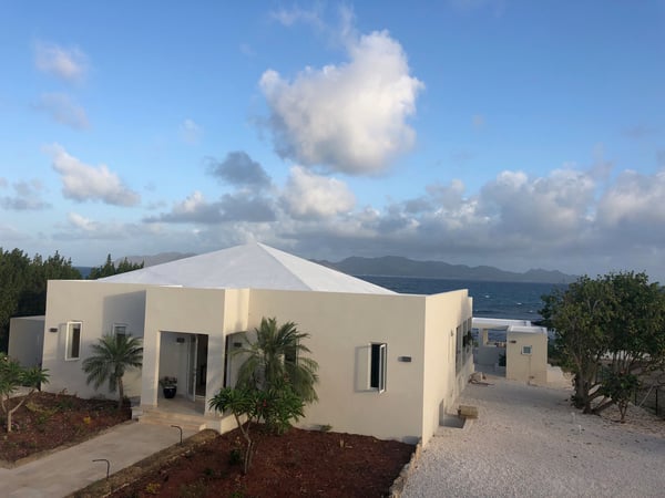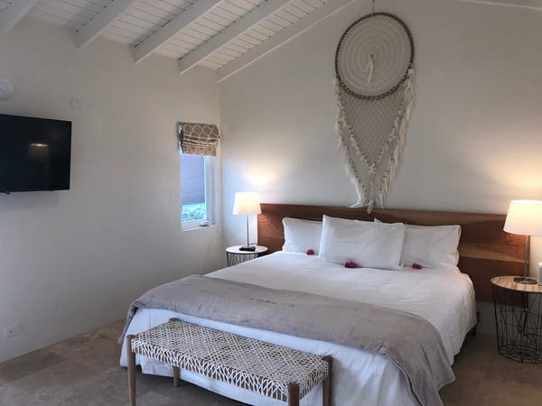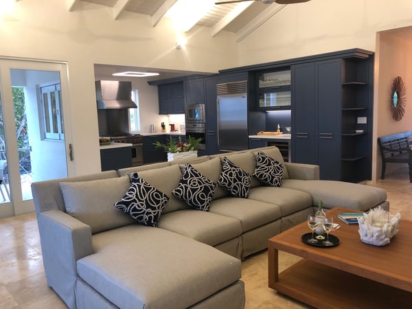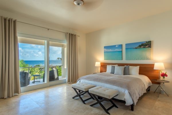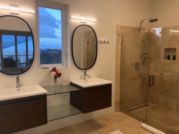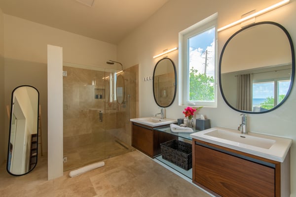 Round Rock Estate is a contemporary six-bedroom villa on the idyllic island of Anguilla. Completely renovated in 2019, no expense was spared to make the most of the breathtaking waterfront location. Located in a quiet part of the island, activities and dining are easily accessible. The villa is five minutes from Rendezvous and the Blowing Point Ferry Terminal is within a short drive. Sit by the private pool under pristine white umbrellas and gaze at the cool Caribbean Sea against the enchanting views of neighbouring St. Martin. Everything you might desire is poolside — covered seating and dining, a heated pool, a poolside bar with an ice maker and fridge, a BBQ grill, ample lounges, and a large terrace. The elevated veranda is outfitted with cushioned furnishings, ceiling fans, and mood lighting for any time of day. A changing room and restroom are available off the pool deck. The comfortably furnished, air-conditioned interiors include wireless internet throughout, a living room with cable TV, a fully equipped gym, and a gourmet kitchen. The kitchen’s Nespresso machine, dishwasher, blender, microwave, toaster, and wine cooler are tucked amongst chic slate cabinetry. Each of the six bedrooms has an ensuite bathroom, screens, a safe, and air-conditioning. The main house’s primary suite has interior and exterior access. Each of the remaining suites has two twin beds that can be made up as a king. Two twin suites are in the main house, one is in the guest cottage, and two are upstairs in the rear building. Work out at the new on-site gym and rock out to the state-of-the-art Sonos home sound system. The villa provides towels, tote bags, and coolers for blissful beach days. Daily housekeeping maintains the villa.