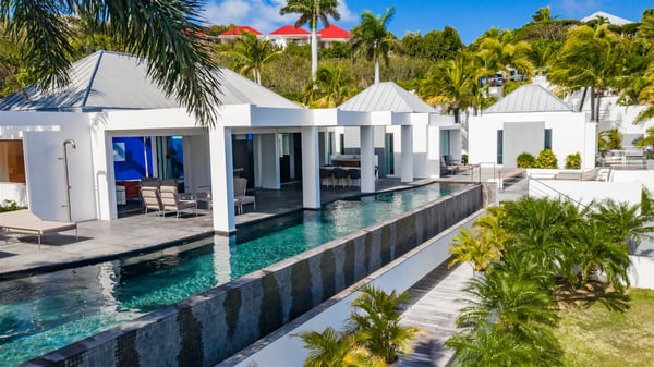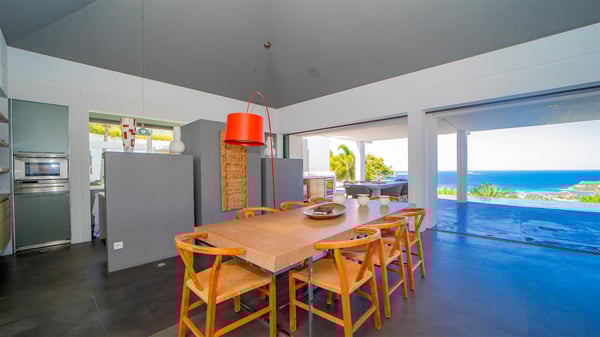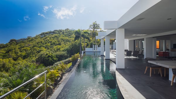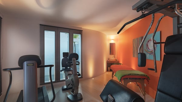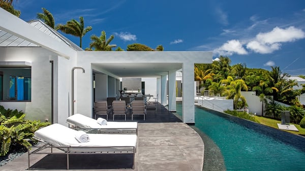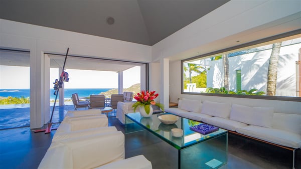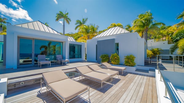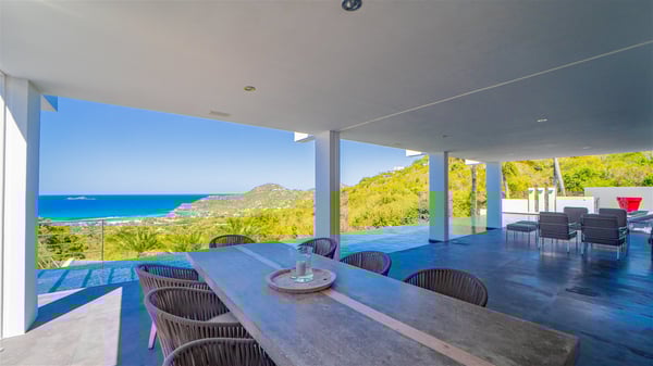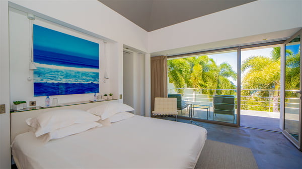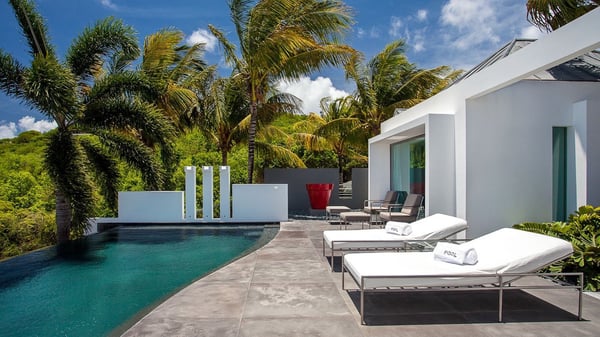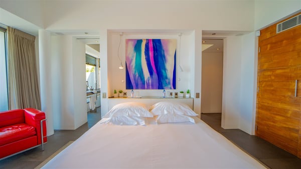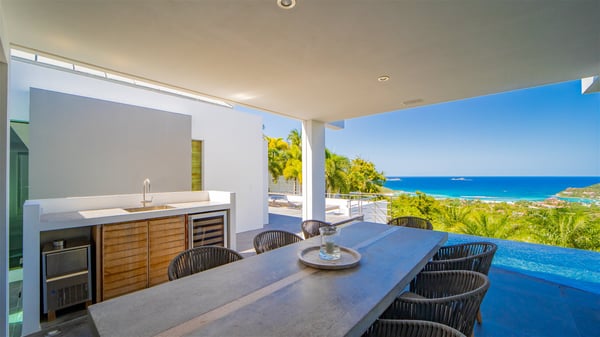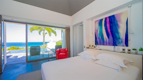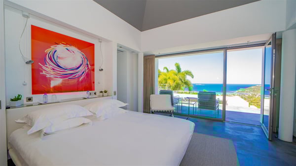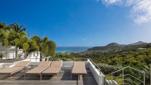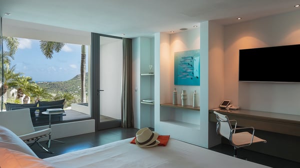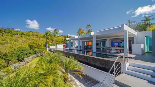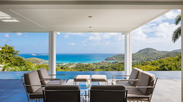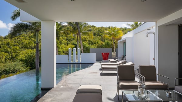 The sumptuous rental villa Nirvana is one of the most luxurious properties in St. Barths. Located in Lurin only a few minutes from the beach and the shopping areas, this splendid five-bedroom vacation home offers a breathtaking view over the bay of St. Jean. This outstanding XXIst century property was built on two levels in an unusual architecture, and designed in a most contemporary style which is now a Saint-Barth’s landmark. The modern entrance with concrete walls and small ponds leads to a large sleek living room opening onto breathtaking views over the bay. This large, open and airy living space includes a living room furnished with large white sofas and armchairs, and decorated with art. A large dining table welcomes guests in this spacious living room gently swept by the trade winds. The well-equipped kitchen is located at the back of the house, as well as the second professional kitchen whenever you wish to call upon a private chef for your events. On the terrace, you’ll be stunned by the idyllic scenery drawn by the most refined facilities. There is a splendid 22-meter heated infinity swimming pool on the deck, perfect for swimming and relaxing. Sun loungers are harmoniously set up in front of the ocean view in a dreamy setting of palm trees, cacti and manicured lawns. An elegant outdoor dining room is also set up for alfresco dining facing the breathtaking view. The rental villa in St. Barths Nirvana welcomes you in five splendid bedrooms equipped with the best comfort. All have private entrances, king-size beds, en-suite bathrooms and access to terraces furnished with lounge chairs. The view over the hills and the ocean is dreamy, while the sparkling lights of St. Jean start to glow in the evening. In a minimalist decor with hints of bright colours, the suites are true living spaces where you will enjoy relaxing and talking at any time in a very private atmosphere. For sports lovers, an air-conditioned fitness room with a massage area is at your disposal.