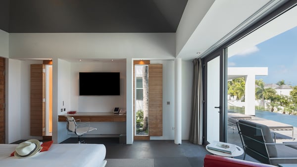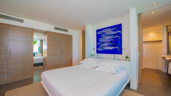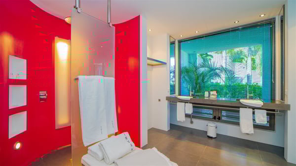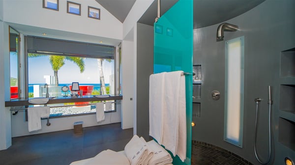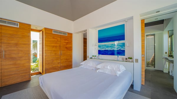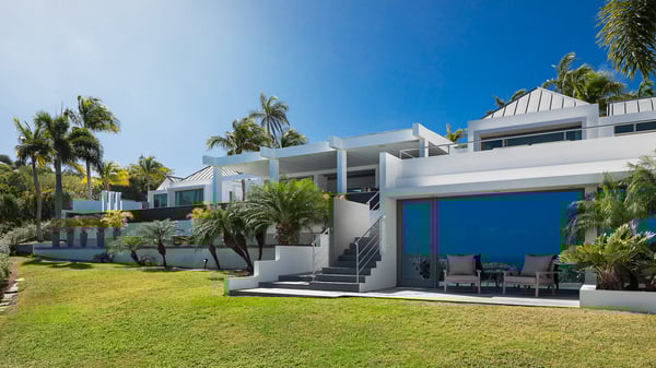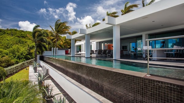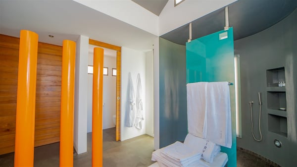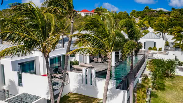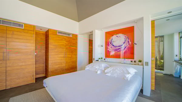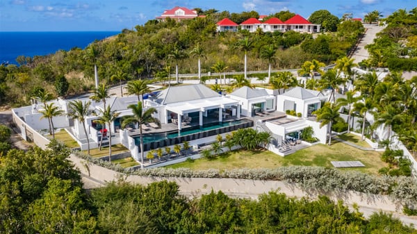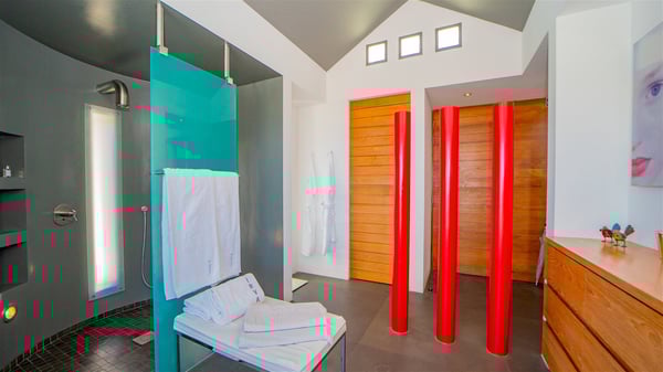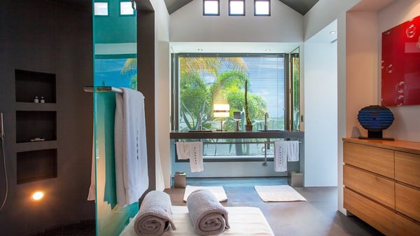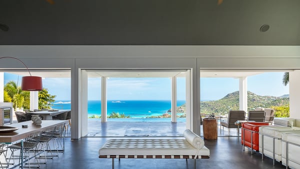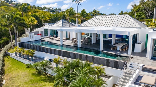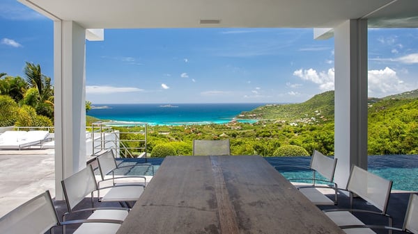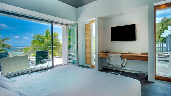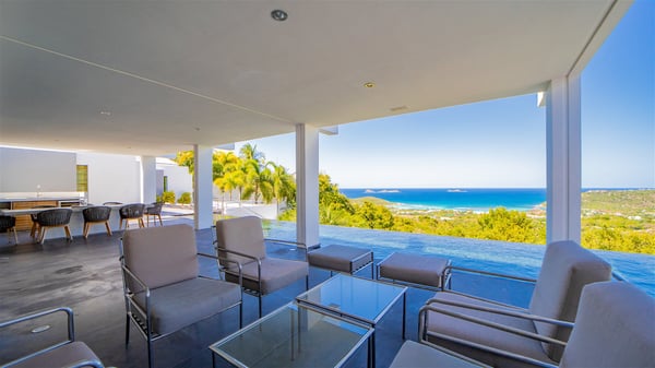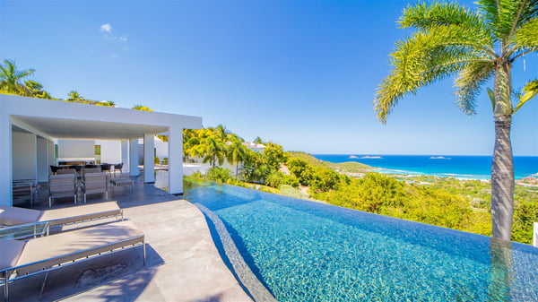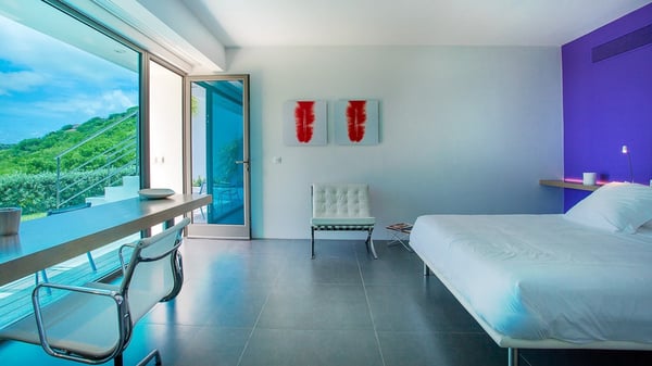 The sumptuous rental villa Nirvana is one of the most luxurious properties in St. Barths. Located in Lurin only a few minutes from the beach and the shopping areas, this splendid five-bedroom vacation home offers a breathtaking view over the bay of St. Jean. This outstanding XXIst century property was built on two levels in an unusual architecture, and designed in a most contemporary style which is now a Saint-Barth’s landmark. The modern entrance with concrete walls and small ponds leads to a large sleek living room opening onto breathtaking views over the bay. This large, open and airy living space includes a living room furnished with large white sofas and armchairs, and decorated with art. A large dining table welcomes guests in this spacious living room gently swept by the trade winds. The well-equipped kitchen is located at the back of the house, as well as the second professional kitchen whenever you wish to call upon a private chef for your events. On the terrace, you’ll be stunned by the idyllic scenery drawn by the most refined facilities. There is a splendid 22-meter heated infinity swimming pool on the deck, perfect for swimming and relaxing. Sun loungers are harmoniously set up in front of the ocean view in a dreamy setting of palm trees, cacti and manicured lawns. An elegant outdoor dining room is also set up for alfresco dining facing the breathtaking view. The rental villa in St. Barths Nirvana welcomes you in five splendid bedrooms equipped with the best comfort. All have private entrances, king-size beds, en-suite bathrooms and access to terraces furnished with lounge chairs. The view over the hills and the ocean is dreamy, while the sparkling lights of St. Jean start to glow in the evening. In a minimalist decor with hints of bright colours, the suites are true living spaces where you will enjoy relaxing and talking at any time in a very private atmosphere. For sports lovers, an air-conditioned fitness room with a massage area is at your disposal.
