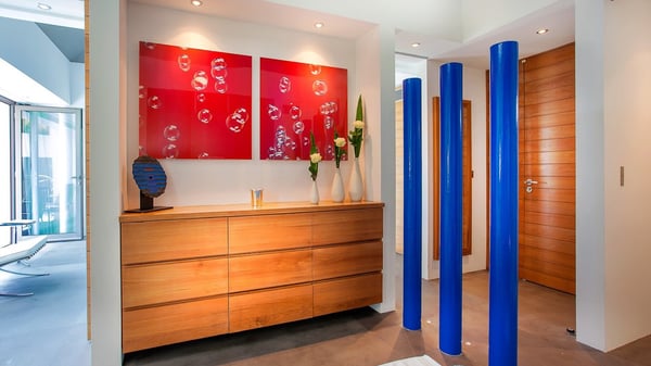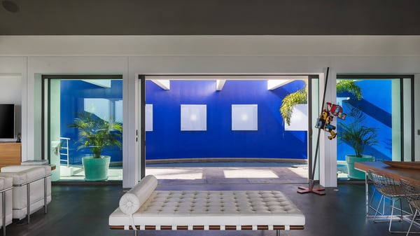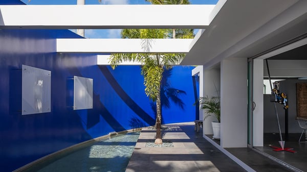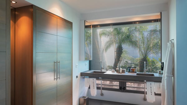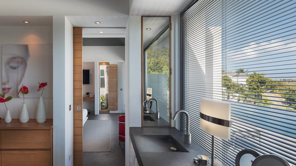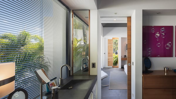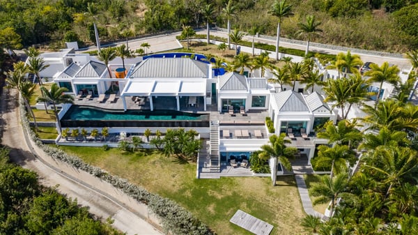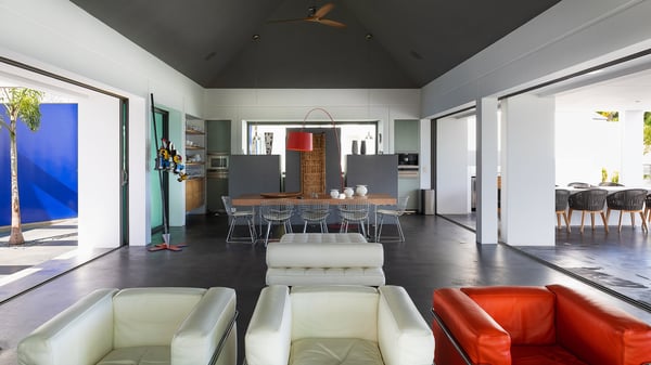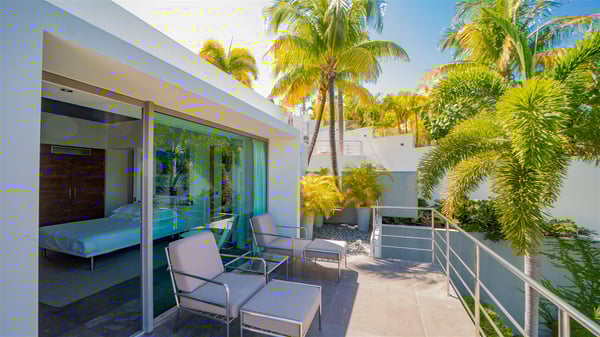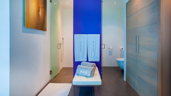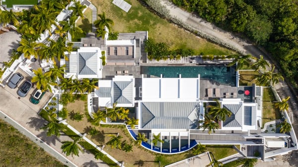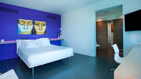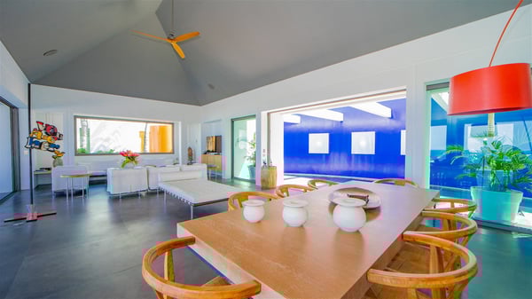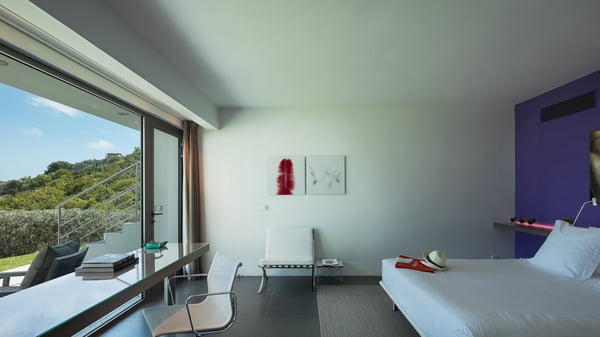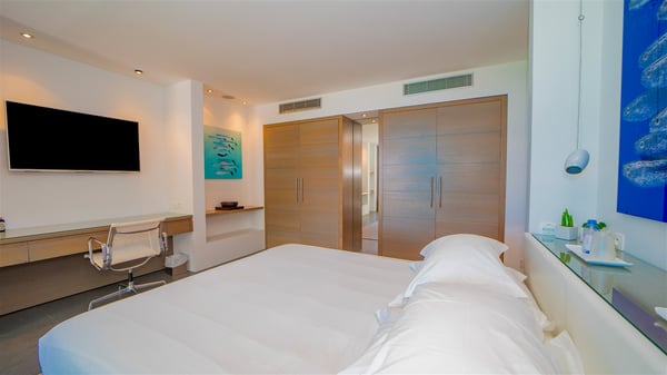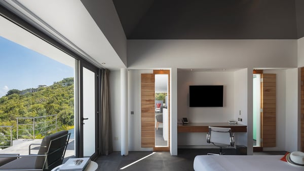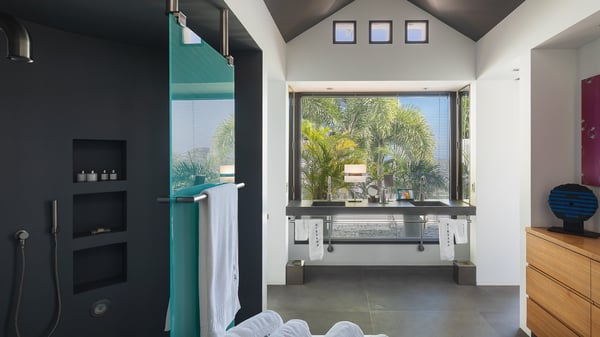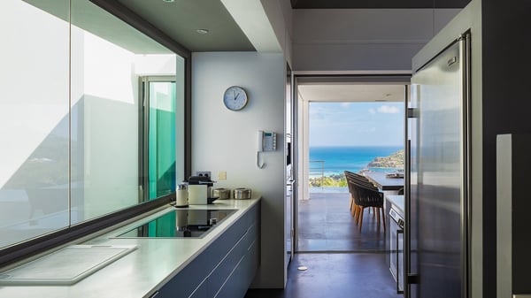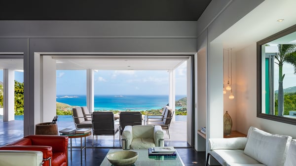 The sumptuous rental villa Nirvana is one of the most luxurious properties in St. Barths. Located in Lurin only a few minutes from the beach and the shopping areas, this splendid five-bedroom vacation home offers a breathtaking view over the bay of St. Jean. This outstanding XXIst century property was built on two levels in an unusual architecture, and designed in a most contemporary style which is now a Saint-Barth’s landmark. The modern entrance with concrete walls and small ponds leads to a large sleek living room opening onto breathtaking views over the bay. This large, open and airy living space includes a living room furnished with large white sofas and armchairs, and decorated with art. A large dining table welcomes guests in this spacious living room gently swept by the trade winds. The well-equipped kitchen is located at the back of the house, as well as the second professional kitchen whenever you wish to call upon a private chef for your events. On the terrace, you’ll be stunned by the idyllic scenery drawn by the most refined facilities. There is a splendid 22-meter heated infinity swimming pool on the deck, perfect for swimming and relaxing. Sun loungers are harmoniously set up in front of the ocean view in a dreamy setting of palm trees, cacti and manicured lawns. An elegant outdoor dining room is also set up for alfresco dining facing the breathtaking view. The rental villa in St. Barths Nirvana welcomes you in five splendid bedrooms equipped with the best comfort. All have private entrances, king-size beds, en-suite bathrooms and access to terraces furnished with lounge chairs. The view over the hills and the ocean is dreamy, while the sparkling lights of St. Jean start to glow in the evening. In a minimalist decor with hints of bright colours, the suites are true living spaces where you will enjoy relaxing and talking at any time in a very private atmosphere. For sports lovers, an air-conditioned fitness room with a massage area is at your disposal.