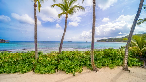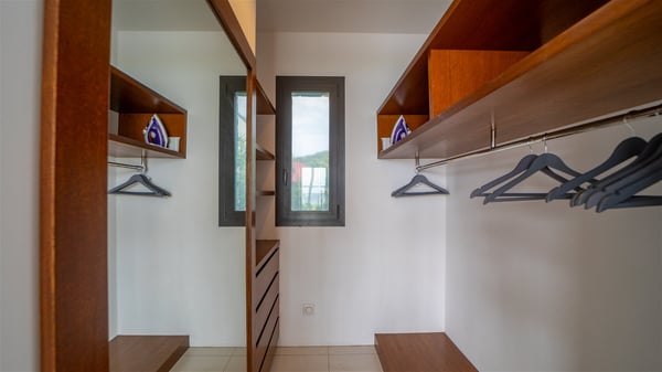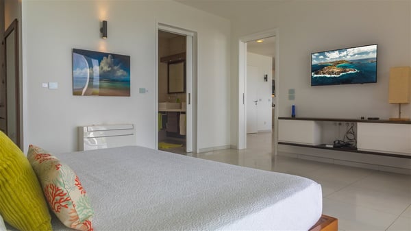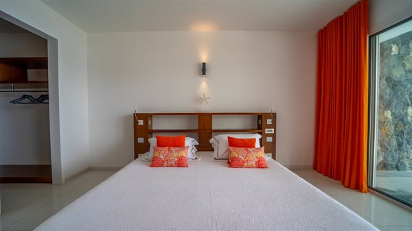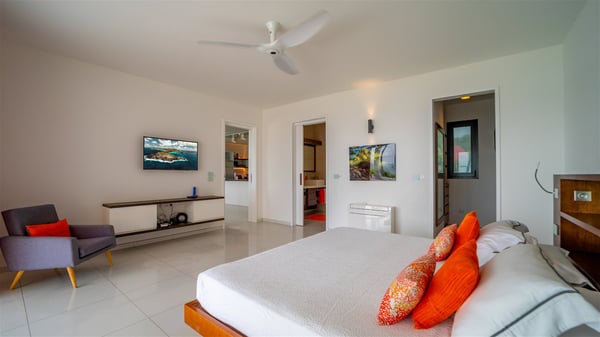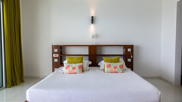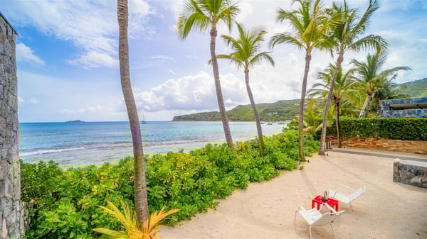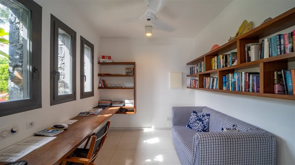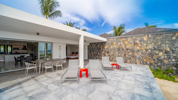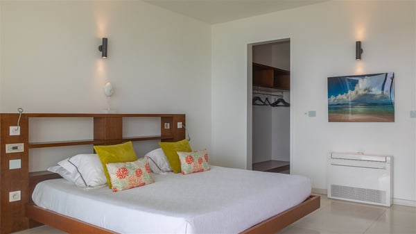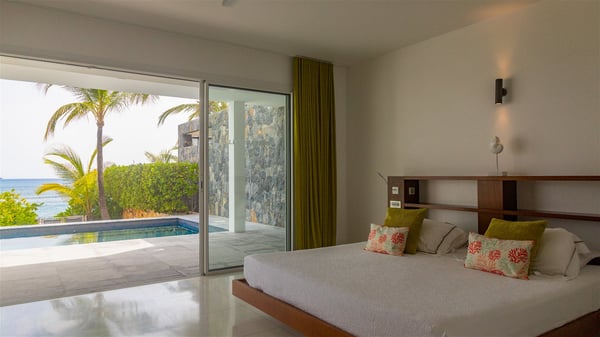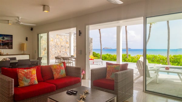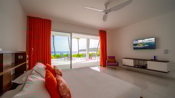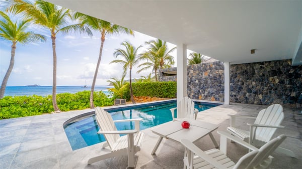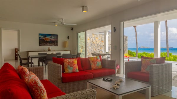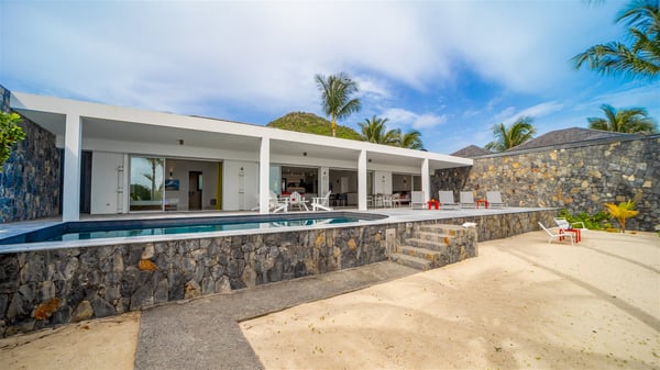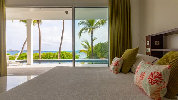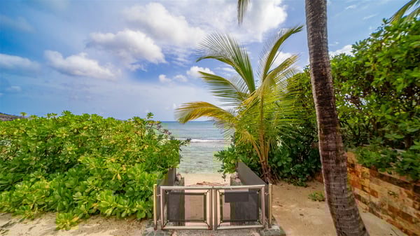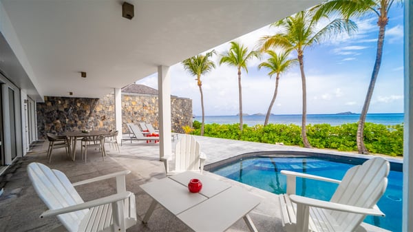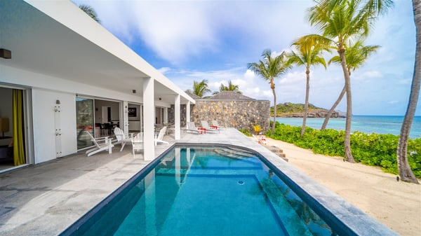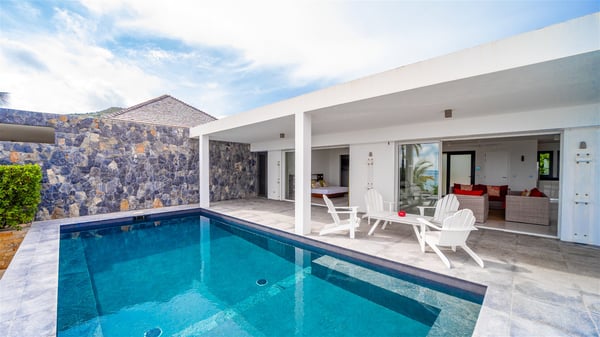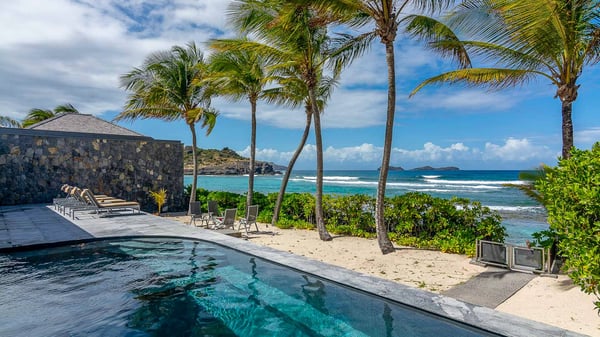 The villa rental Les Basses is a lovely property located on Lorient beach. Facing a breathtaking ocean view, this two-bedroom vacation home with a swimming pool welcomes its guests to a paradisiacal setting. Featuring private beach access and beautiful, bright spaces, the holiday rental in St-Barths Les Basses is the dream destination for an unforgettable stay for four in the island of St-Barths. Designed on a single level, the vacation rental Les Basses offers an amazing show of Lorient beach and its crystal-clear waters. In a privileged environment, this Caribbean vacation rental welcomes you into its very comfy lounge with woven fiber sofas and soft, red cushions facing an HD TV. Close to the bay windows overlooking the terrace with a pool and the perfect ocean horizon, you’ll find the indoor dining room which can accommodate six guests close to the fully-equipped kitchen with a central island. At the back of this living area is a well-appointed office area with a library and a window overlooking the vegetation, like a quiet oasis. At the front, the terrace of villa Les Basses sparkles under the Caribbean sun. Around the pool, there are loungers for pleasant sunbathing and relaxation sessions in the gentle trade winds. Under the covered part of the terrace, the al fresco dining room invites you to enjoy delicious dinners, close to the outdoor lounge ideal for sipping a cocktail while marvelling at the view. A bit lower, two armchairs are set in the sand under the shade of palm trees, near the path that leads you directly to Lorient beach through a private access. The villa rental Les Basses consists of two sea-view bedrooms, with en-suite bathrooms, HD TVs, and walk-in wardrobes. Furnished with king-size beds, bright and comfortable, the bedrooms are located on either side of the living area in a very private atmosphere. Both open onto the terrace with a swimming pool, in a fantastic setting. Located on Lorient beach facing the ocean, villa Les Basses is the ideal place for an unforgettable stay for four in St-Barths.
