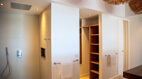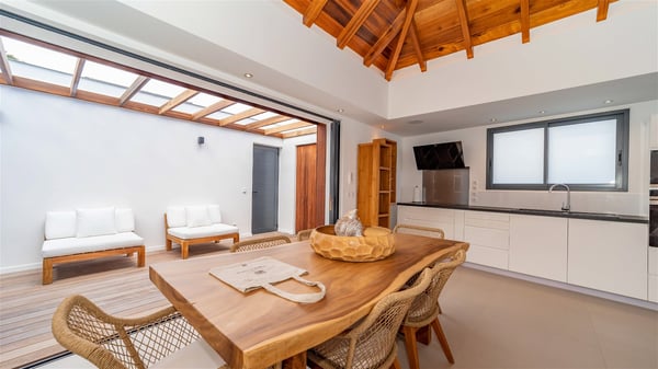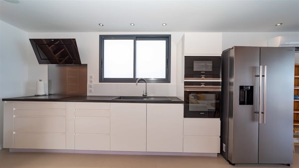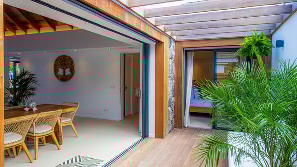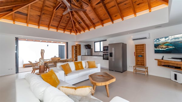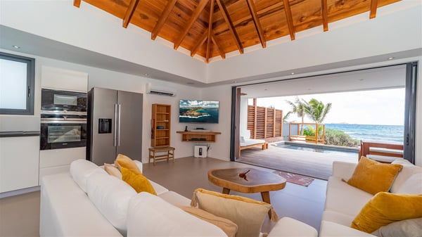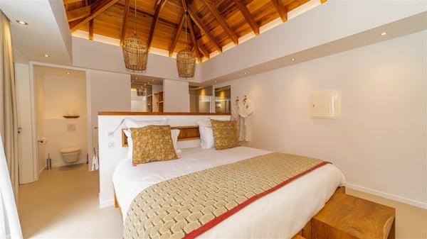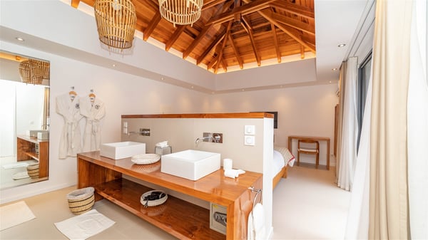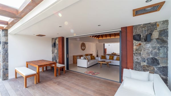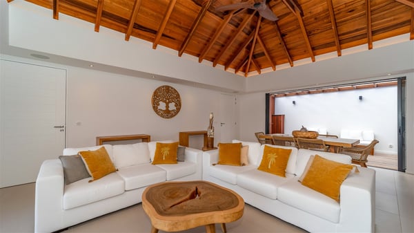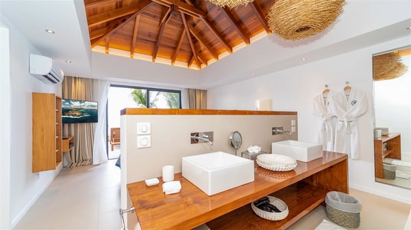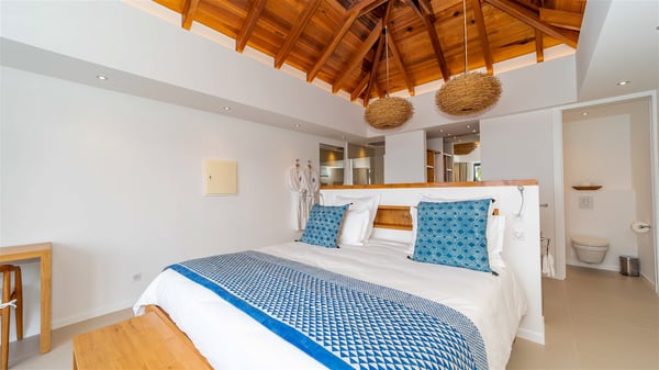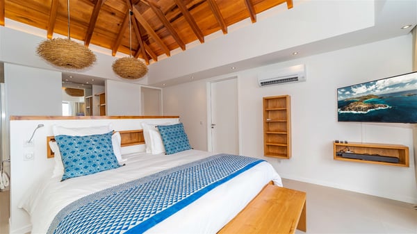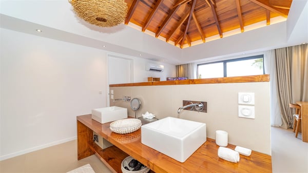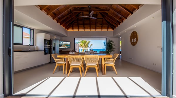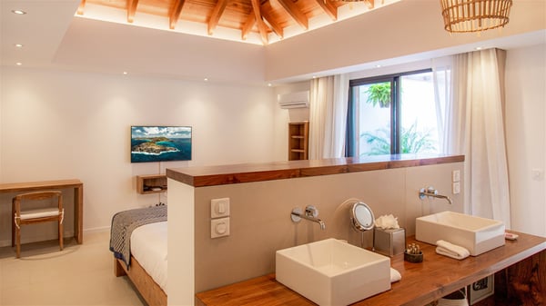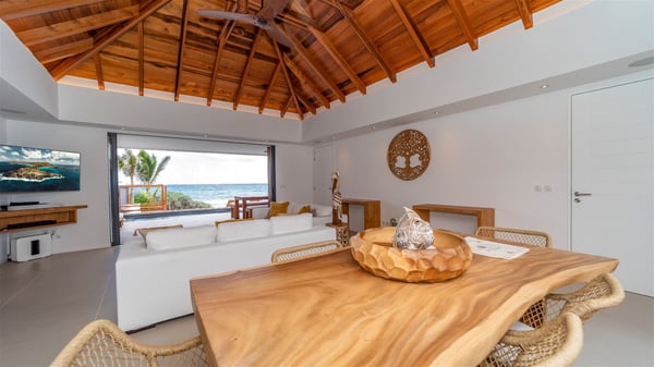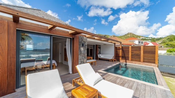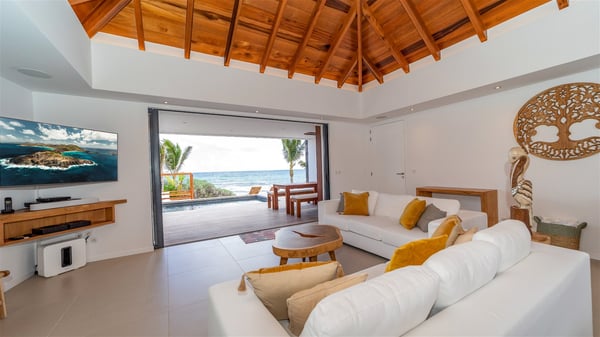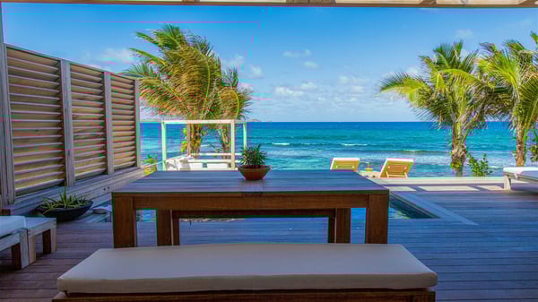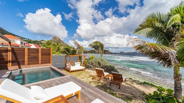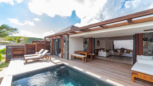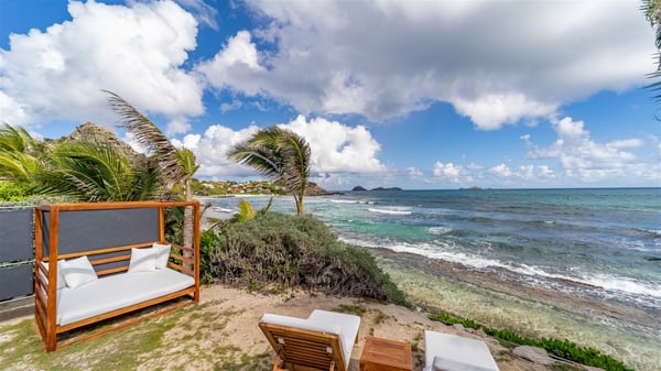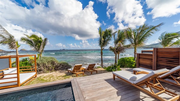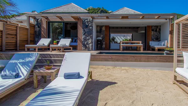 Located on the beach of Anse des Cayes, the luxury villa Prana welcomes guests for an idyllic stay in front of the sparkling ocean. Perfect for a vacation with family or friends, this beautiful three-bedroom beachfront property can also be rented with the villa next-door Green Heart, for a total of six bedrooms. As the Sanskrit word Prana means vital energy, it gives its name to this beautiful vacation home in front of the deep blue horizon. It is furnished with the utmost comfort expected for a relaxing vacation. As soon as one comes into Villa PRANA’s living room, he’s welcomed around sofas and armchairs around a wooden coffee table, in front of the breathtaking view. Under the mansard ceiling, the dining room is gently swept by the trade winds that blow through the openings onto the terrace on one side and the patio on the other one. In the same open space, the well-equipped kitchen allows to cook delicious meals in a sea atmosphere; a gas barbecue is also available outside for pleasant dinners under the sky. The vacation rental villa Prana is a real place of relaxation in a paradise environment. On the terrace, the view over the nearby ocean, only a few steps away, is striking. Around the beautiful heated swimming pool, there are deckchairs perfect to enjoy the Caribbean sun, read and sunbathe in the utmost cal of a private atmosphere. A few steps away, deckchairs are set up on the beach in the gentle Caribbean breeze. From there, the view over the ocean and the neighbouring islands is outstanding. The holiday rental villa Prana consists of three bedrooms with en-suite bathrooms. Two of them are furnished with king-size beds, one with an ocean view and the other overlooking the patio. The third one is on the lower level and has twin beds that can be converted into king-size. The bedrooms are finely decorated with fabrics and soft cushions. A fitness room is also available, equipped with treadmills and yoga mats, weights and a bicycle. Between sky and sea, villa Prana is the perfect place for a vacation close to the ocean in St-Barths.