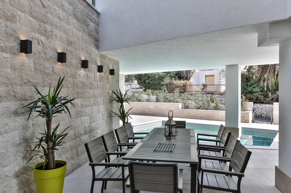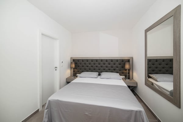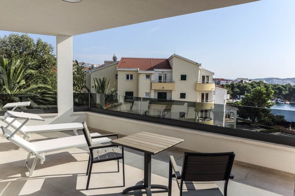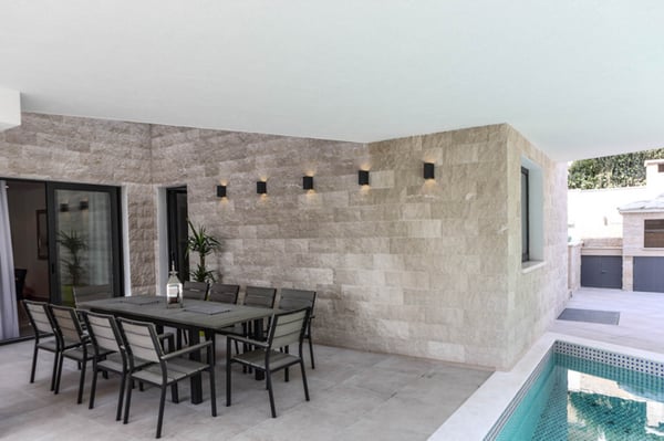 Modern villa by the sea in Croatia, Novela is situated near the ancient city of Split and the town of Trogir, both with its UNESCO world heritage sites. Since the island Ciovo is a kind of extension of the city Trogir, it offers a lot of possibilities for vacation, recreation and swimming, as well as numerous historical monuments. The Mediterranean vegetation, archipelago with small, picturesque little islands, mild climate and the most beautiful beaches in hidden bays, will certainly make your stay unforgettable. Luxury Villa Novela is situated in Okrug Gornji, only 90m from the beautiful sea and next to the promenade where there are beaches, restaurants, cafes and a water park for children. This elegant and modern villa was built in 2016, and it is combination of elegance and luxury amenities you would expect from a 5-star villa. Within the elegant exterior of this villa, you will find a very beautiful and functional interior that is just perfect for enjoying a vacation with family or friends. The 363m² of the villa provides comfort, spaciousness and style in every room: 7 en-suite double bedrooms, 1 extra bathroom, a fully equipped kitchen, dining room and living room. The property spreads over 650 m², and it isa great accommodation for 14 persons. Villa Novela is divided into 4 levels - basement, ground floor, first and second floor. The basement of Villa Novela is designed as a recreation area with a gym, sauna and an indoor Jacuzzi. The ground floor consists of an elegant and spacious living room with a large dining table for dining and a fully equipped kitchen. The first and second floors are designed as a sleeping area with 7 double bedrooms with en suite bathrooms. Spacious terraces and balconies with outdoor tables and chairs, sun loungers and a breathtaking sea view complete the feeling of being in a small paradise. The complete outdoor area of this villa is just as impressive as its stylish interior. There is a 35m² large outdoor swimming pool, loungers, garden furniture and an outdoor fireplace, which gives a distinctive and Mediterranean charm to the entire estate.