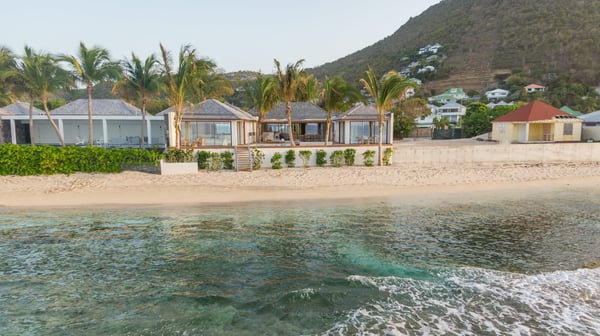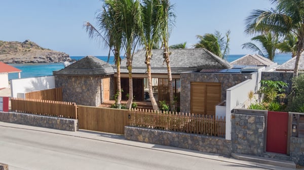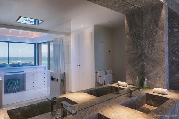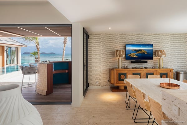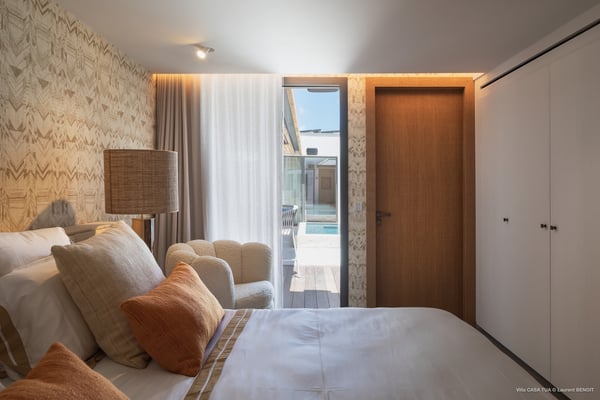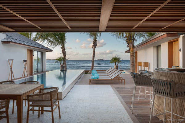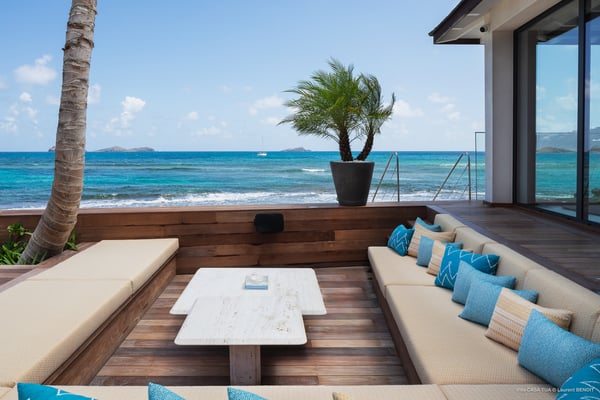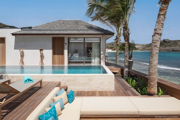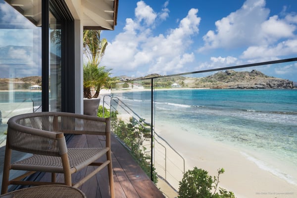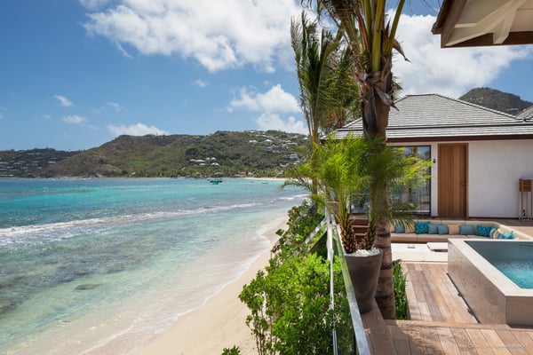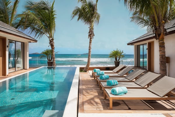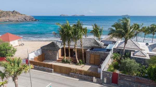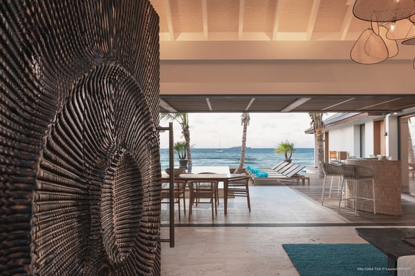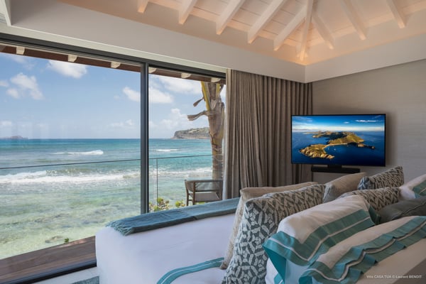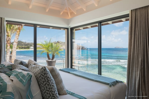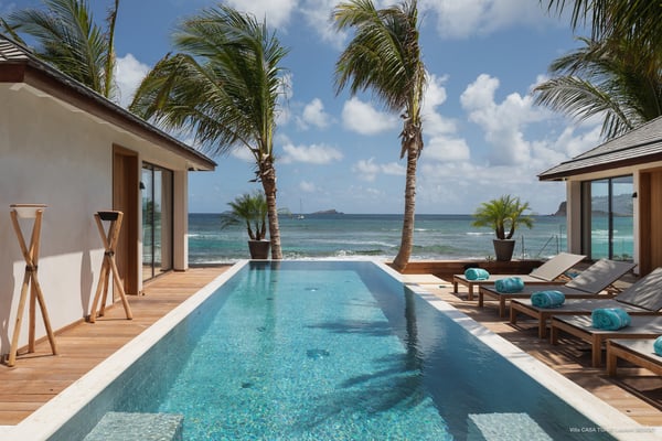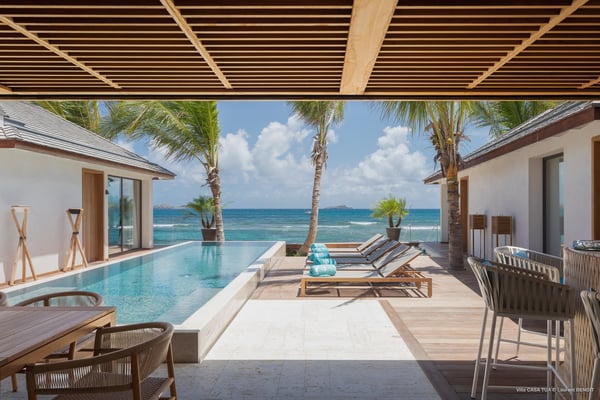 Casa Tua is built in the heart of an idyllic setting on Lorient Beach. You’ll enjoy the song of the waves as well as the sparkling waters during your stay in St Barths. Recently built and designed by a famous local architectural firm, this beautiful vacation home is very well located on Lorient Beach. You can access the sandy beach directly from the large terrace via a private staircase. The large terrace is a truly magical and fairy place. There is a bar equipped with armchairs as well as a covered dining room to enjoy your meals cooked in the spacious and well-equipped kitchen. You may prefer the adjoining indoor dining room for utmost privacy. Linen and caramel-toned hints bring a cozy touch to this warm and most refined indoor space. Two air-conditioned lounges with large contemporary hanging lights welcome you and your guests for delightful resting or talking sessions. One of them connects the covered terrace, while the second seems to be a cozy movie theatre. Wherever you are in the house, the mild air flows in, providing a delightful feeling of well-being. On the terrace, you will marvel at the breathtaking view over the bay over Lorient located only a few steps away. There, the sand of St Barths is bright and soft, in the salty air swept by the lapping of the waves. The terrace seems to be an extension of the beach, with a large sofa, an amazing heated infinity swimming pool shaded by tall palm trees and comfortable deck chairs. The luxurious rental Casa Tua is composed of four beautiful air-conditioned bedrooms with king-size beds and en-suite bathrooms. Two of them open onto breathtaking views over the beach and the ocean through large windows, while the other two are located at the back, and open onto the terrace and the pool. Each bedroom has an en-suite bathroom and is decorated in a most refined décor. This exclusive villa located on the beach of Lorient is the true perfect place for a dream stay in St Barths