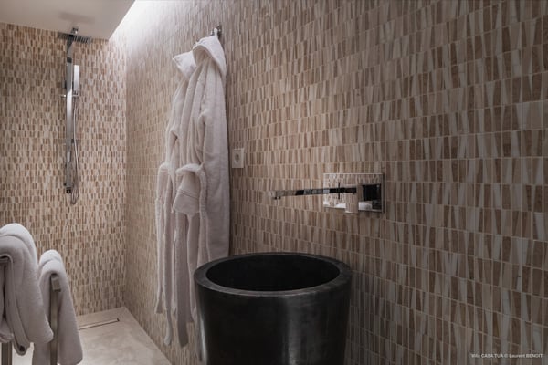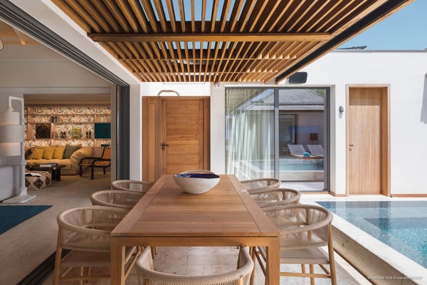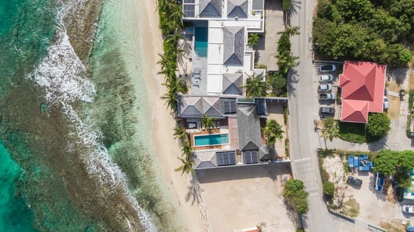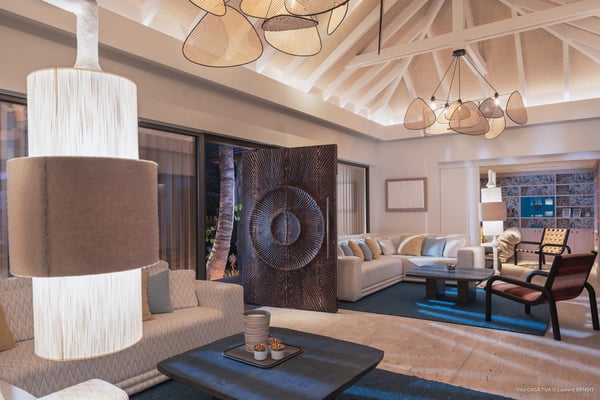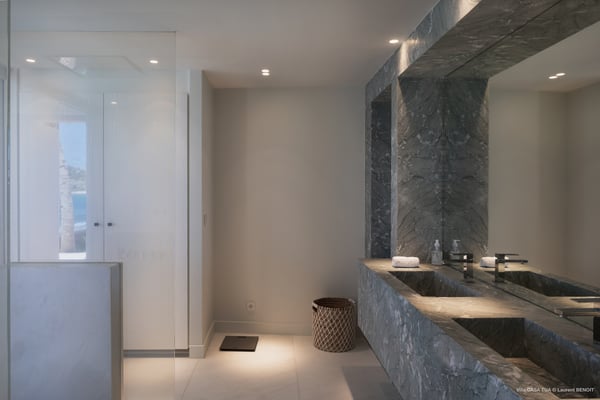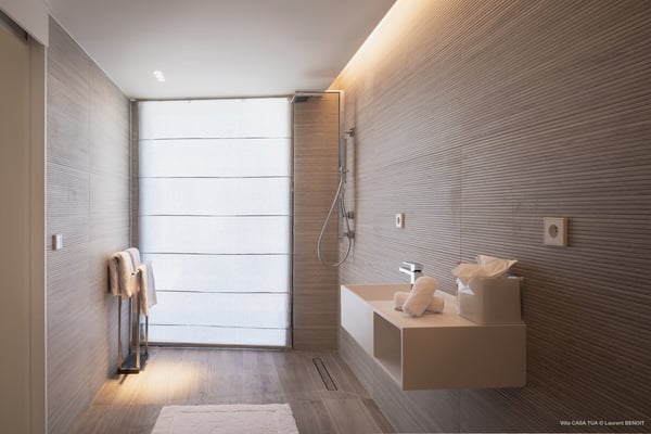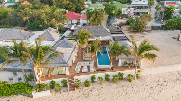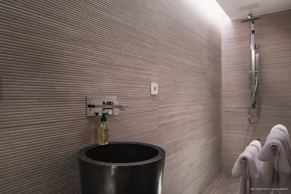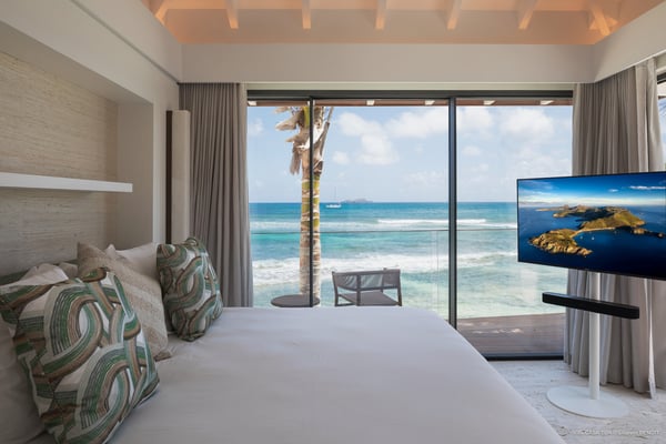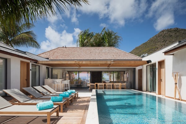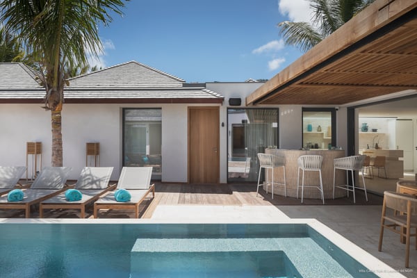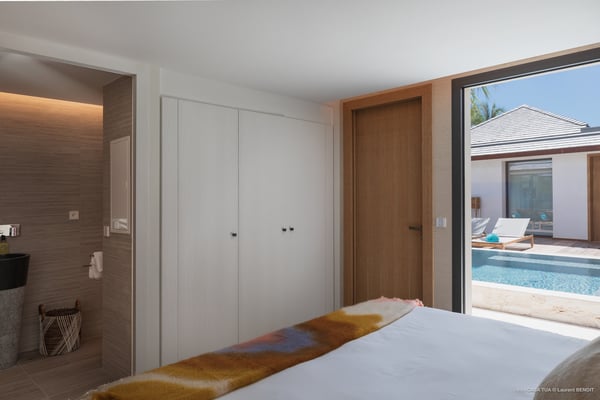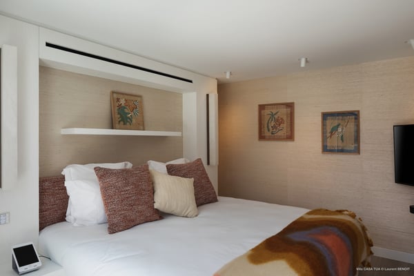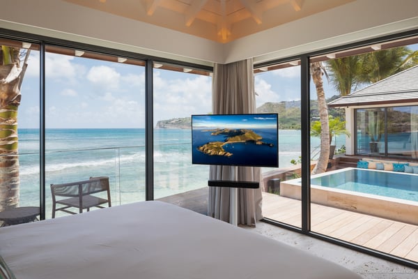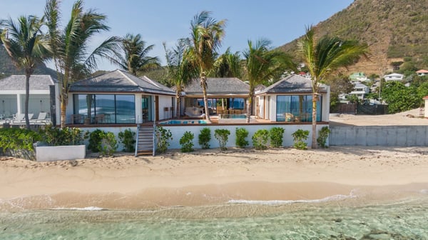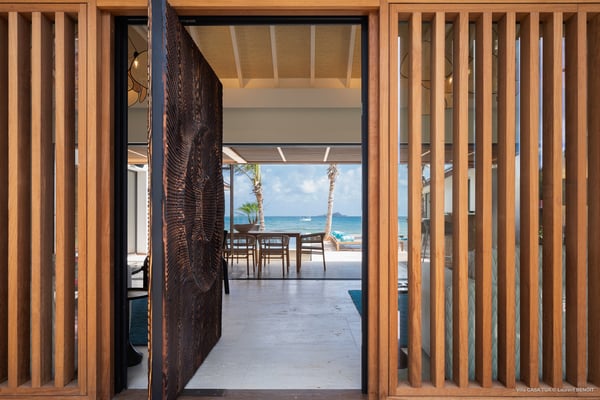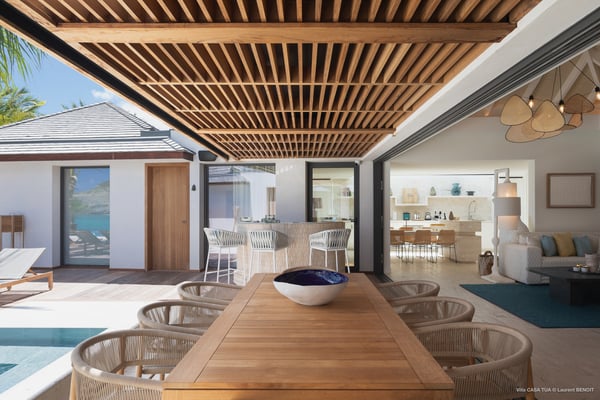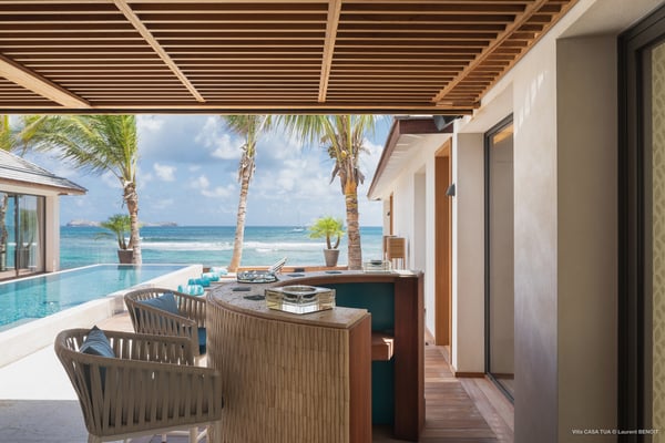 Casa Tua is built in the heart of an idyllic setting on Lorient Beach. You’ll enjoy the song of the waves as well as the sparkling waters during your stay in St Barths. Recently built and designed by a famous local architectural firm, this beautiful vacation home is very well located on Lorient Beach. You can access the sandy beach directly from the large terrace via a private staircase. The large terrace is a truly magical and fairy place. There is a bar equipped with armchairs as well as a covered dining room to enjoy your meals cooked in the spacious and well-equipped kitchen. You may prefer the adjoining indoor dining room for utmost privacy. Linen and caramel-toned hints bring a cozy touch to this warm and most refined indoor space. Two air-conditioned lounges with large contemporary hanging lights welcome you and your guests for delightful resting or talking sessions. One of them connects the covered terrace, while the second seems to be a cozy movie theatre. Wherever you are in the house, the mild air flows in, providing a delightful feeling of well-being. On the terrace, you will marvel at the breathtaking view over the bay over Lorient located only a few steps away. There, the sand of St Barths is bright and soft, in the salty air swept by the lapping of the waves. The terrace seems to be an extension of the beach, with a large sofa, an amazing heated infinity swimming pool shaded by tall palm trees and comfortable deck chairs. The luxurious rental Casa Tua is composed of four beautiful air-conditioned bedrooms with king-size beds and en-suite bathrooms. Two of them open onto breathtaking views over the beach and the ocean through large windows, while the other two are located at the back, and open onto the terrace and the pool. Each bedroom has an en-suite bathroom and is decorated in a most refined décor. This exclusive villa located on the beach of Lorient is the true perfect place for a dream stay in St Barths