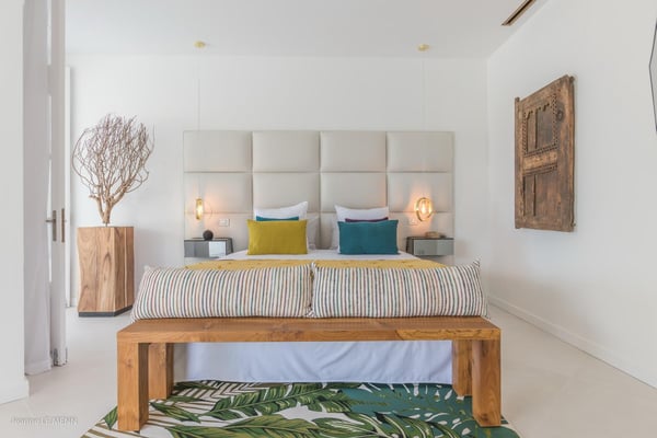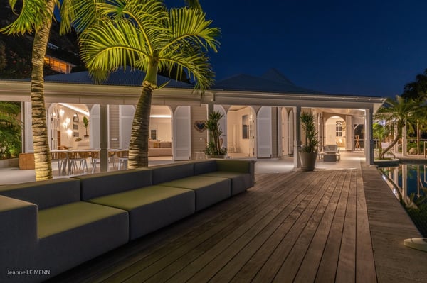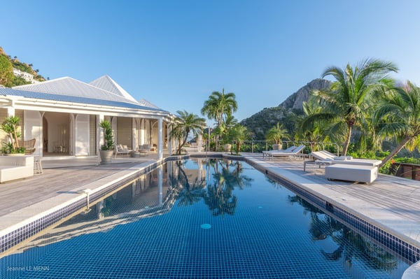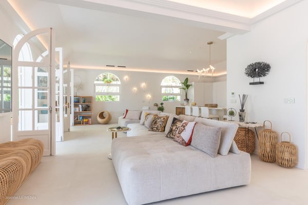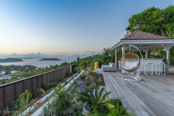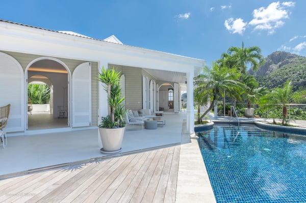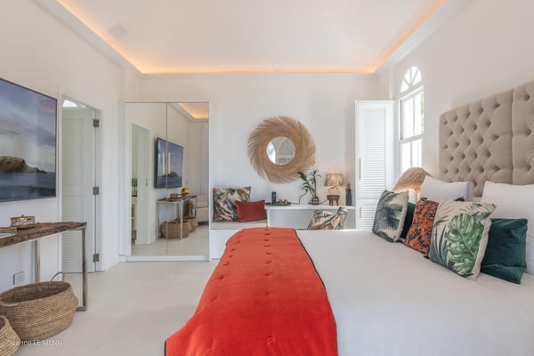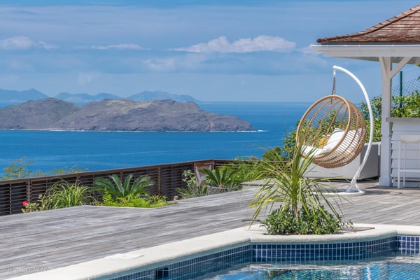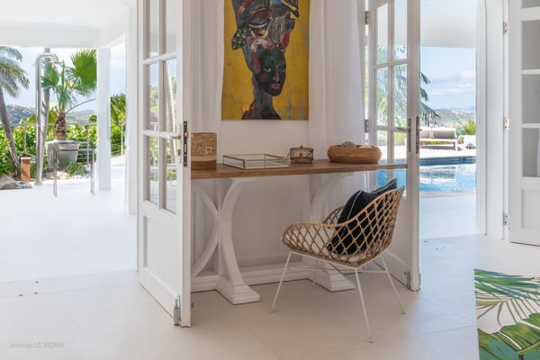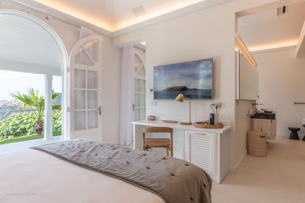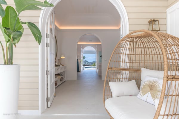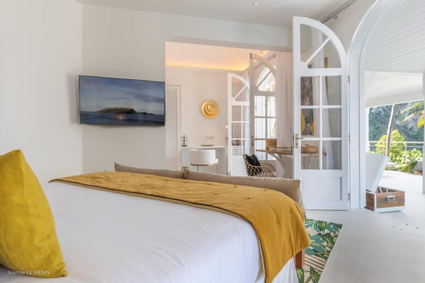 The luxurious villa White Sun is the perfect combination of luxury, calm and beauty. Located on a hillside in Petite Saline, this outstanding rental home in St. Barth is fully air-conditioned and offers a range of high-quality services in a new, refined and bright decoration. You’ll love the amazing show of the golden sunrises and sunsets. This colonial-style recently renovated property offers the utmost comfort. The large air-conditioned living room is charming as it features a contemporary and ethnic decoration while the bright light enters through the arched windows. In a warm and welcoming atmosphere, neutral white walls, soft sofas and benches bring a delightful feeling of well-being. In the background, you'll enjoy the view over the turquoise waters and the foliage of the tropical Caribbean vegetation. The dining room opens onto the living space and features a large designer table that can accommodate up to eight guests. You'll enjoy tasting the delicious food prepared in the modern, well-equipped kitchen with a breakfast bar. Decorated with white and beige tones, linen and wicker materials, and coming with perfectly arranged spaces: the villa White Sun is a truly luxurious home in Saint-Barths. Through twelve arched doors, you'll enjoy the covered terrace with plenty of shaded areas set up with hammocks, wicker chairs and another outdoor lounge for relaxing in the mild air. Facing the panoramic view, there is a sumptuous heated pool for swimming sessions or just for fun. Sofas, armchairs and sunbeds complete the layout of this teak terrace with a stunning panorama, shaded by palm trees filtering the trade winds. At the end, there is an ajoupa with a bar area and benches facing the spectacular view: the perfect place for enjoying the glowing sunset of St.Barths sipping a cocktail with friends. The holiday house White Sun has three superb and contemporary luxury rooms perfectly furnished and air-conditioned. Each has a king-size bed, one of which can be made into a twin, an access to the terrace and an en-suite bathroom. Whether you are travelling with family or a group of friends, the villa White Sun in St-Barts is the perfect getaway for your next vacation in the Caribbean.