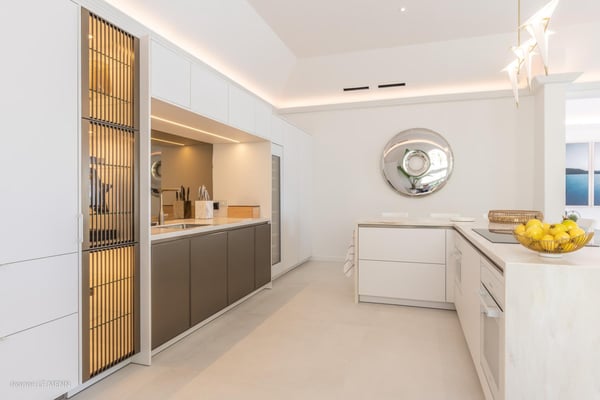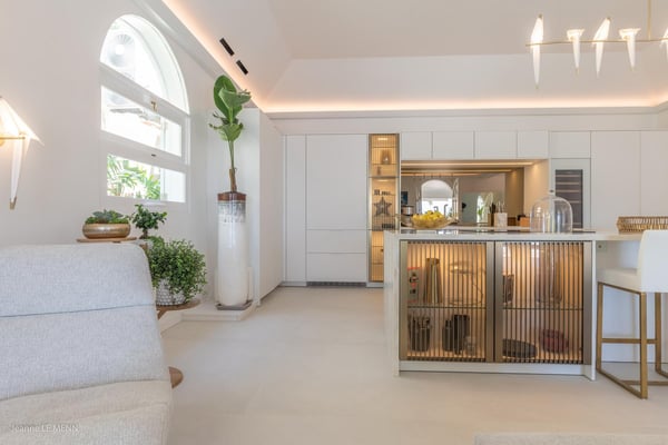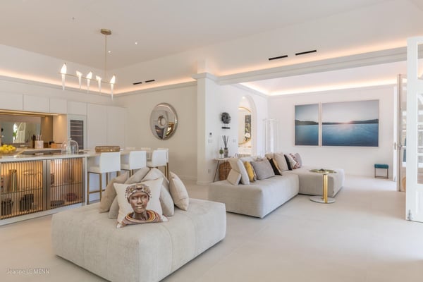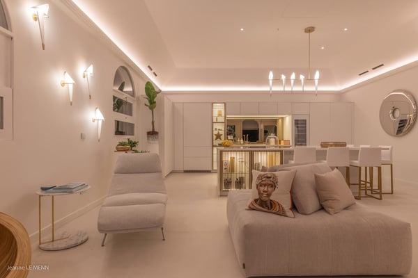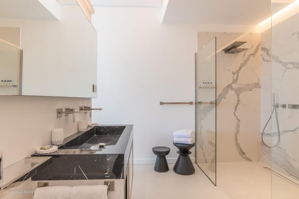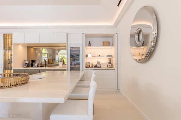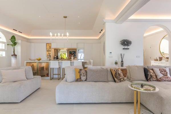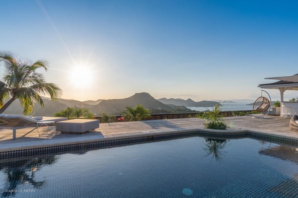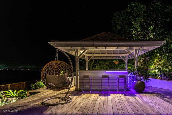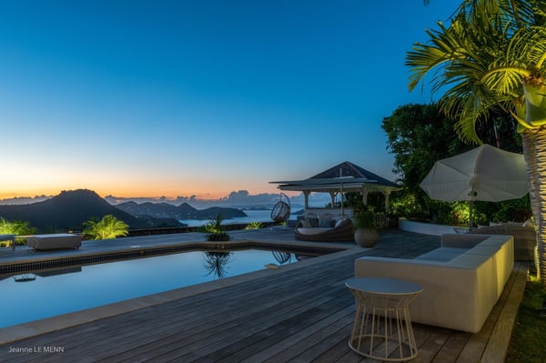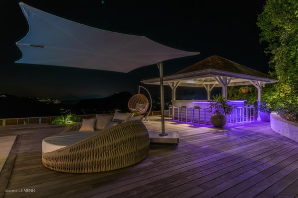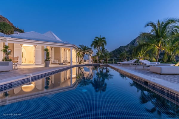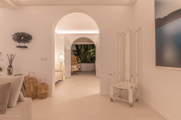 The luxurious villa White Sun is the perfect combination of luxury, calm and beauty. Located on a hillside in Petite Saline, this outstanding rental home in St. Barth is fully air-conditioned and offers a range of high-quality services in a new, refined and bright decoration. You’ll love the amazing show of the golden sunrises and sunsets. This colonial-style recently renovated property offers the utmost comfort. The large air-conditioned living room is charming as it features a contemporary and ethnic decoration while the bright light enters through the arched windows. In a warm and welcoming atmosphere, neutral white walls, soft sofas and benches bring a delightful feeling of well-being. In the background, you'll enjoy the view over the turquoise waters and the foliage of the tropical Caribbean vegetation. The dining room opens onto the living space and features a large designer table that can accommodate up to eight guests. You'll enjoy tasting the delicious food prepared in the modern, well-equipped kitchen with a breakfast bar. Decorated with white and beige tones, linen and wicker materials, and coming with perfectly arranged spaces: the villa White Sun is a truly luxurious home in Saint-Barths. Through twelve arched doors, you'll enjoy the covered terrace with plenty of shaded areas set up with hammocks, wicker chairs and another outdoor lounge for relaxing in the mild air. Facing the panoramic view, there is a sumptuous heated pool for swimming sessions or just for fun. Sofas, armchairs and sunbeds complete the layout of this teak terrace with a stunning panorama, shaded by palm trees filtering the trade winds. At the end, there is an ajoupa with a bar area and benches facing the spectacular view: the perfect place for enjoying the glowing sunset of St.Barths sipping a cocktail with friends. The holiday house White Sun has three superb and contemporary luxury rooms perfectly furnished and air-conditioned. Each has a king-size bed, one of which can be made into a twin, an access to the terrace and an en-suite bathroom. Whether you are travelling with family or a group of friends, the villa White Sun in St-Barts is the perfect getaway for your next vacation in the Caribbean.