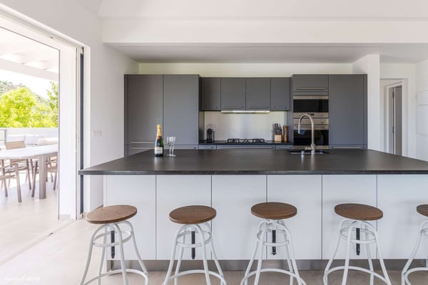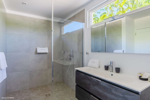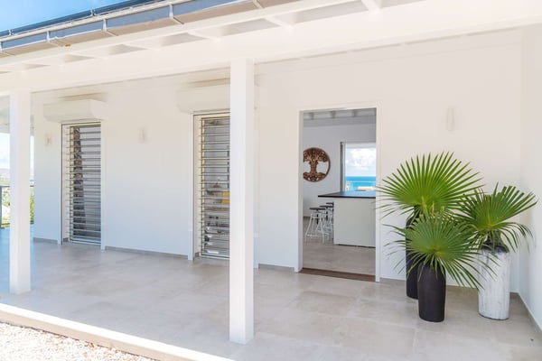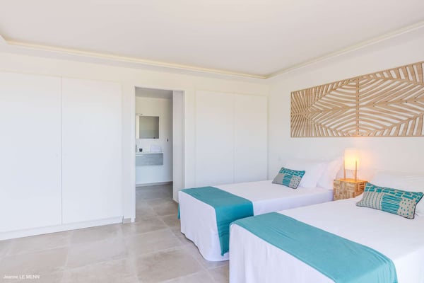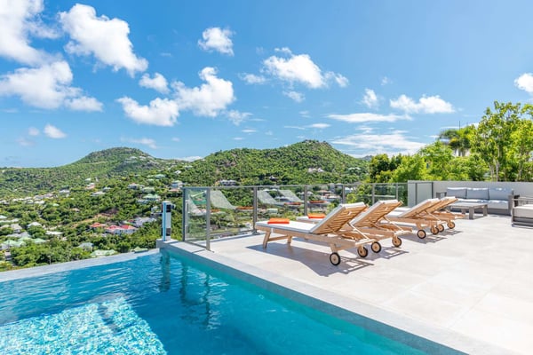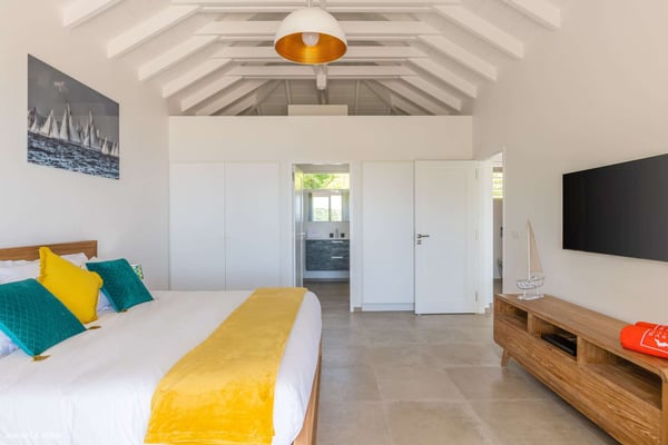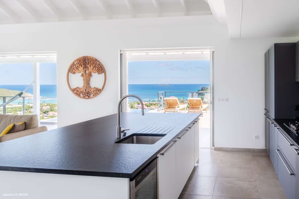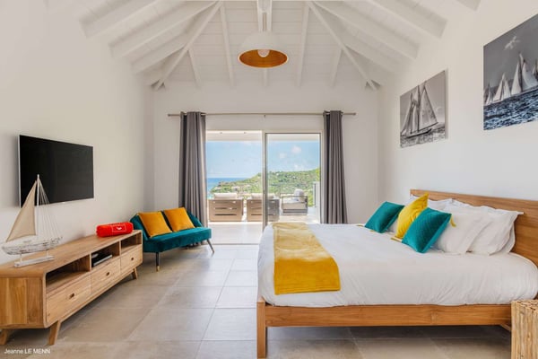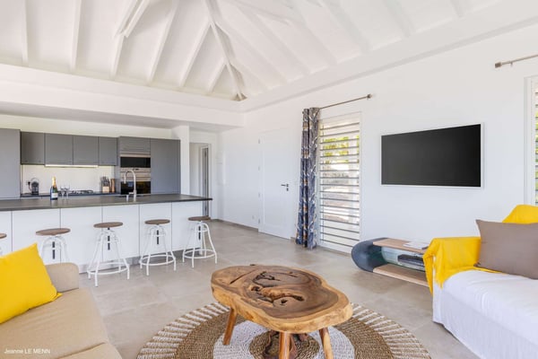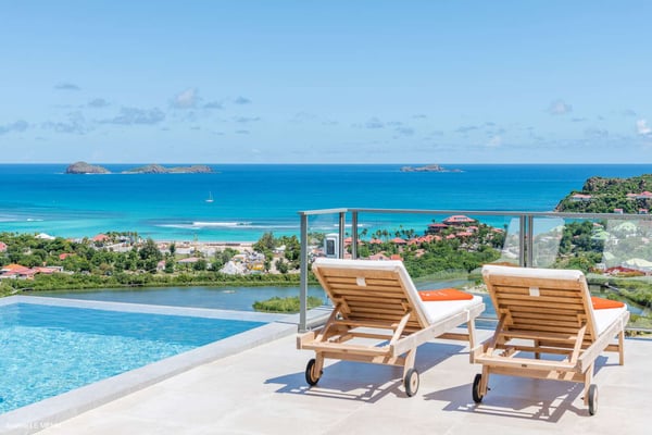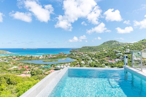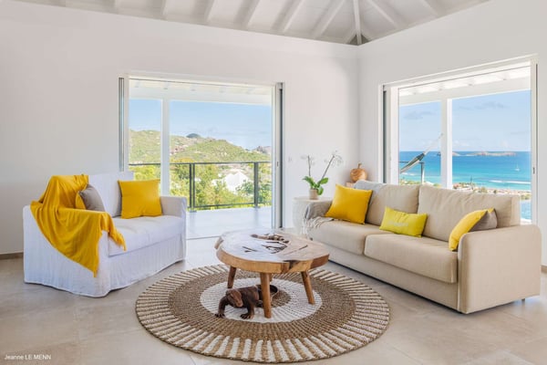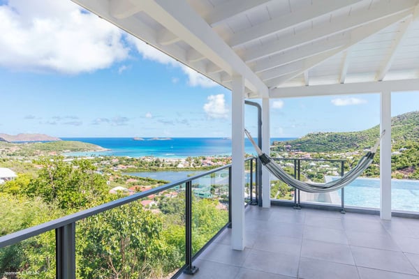 Located on the heights of St. Jean, the luxury villa Oiseau Bleu is a newly built property with a breathtaking ocean view. Very contemporary and equipped with the best amenities and noble materials, this three-bedroom air-conditioned vacation home is the perfect setting for an unforgettable stay with family or friends in Saint Barths. Comfortable and very bright, the vacation home Oiseau Bleu combines the charm of a warm decoration with a modern and refined design with woody touches. The living room is airy and blown by the mild wind through large openings; it is furnished with sofas covered with yellow cushions. On the wall, the flat screen is perfect for delightful movie nights. The well-equipped kitchen has a breakfast bar for snacks or talk over a coffee. Under the high vaulted ceiling, the sense of volume brings a delightful feeling of well-being, facing the strikingly beautiful view over the ocean behind the many windows onto the outside. In the heart of the rolling hills of Saint Barths, the environment is relaxing and quiet. The front terrace is a true haven of peace designed around a splendid infinity pool where you will enjoy swimming in front of the stunning panoramic view. Sun loungers, a hammock located under the covered part of the terrace, and a comfortable outdoor lounge complete the outdoor set up. The surrounding tropical vegetation brings a touch of freshness and exoticism to this truly enchanting setting lulled by the trade winds under the Caribbean sun. The vacation rental Oiseau Bleu in St. Barths is composed of three beautiful air-conditioned bedrooms with en-suite bathrooms. The master bedroom is located on the main level and opens onto the living room and the terrace, with a lovely view over the bay. The other two suites are on the lower level, which can be accessed through an interior staircase, and both also have a terrace area and a beautiful ocean view. They are equipped with king, queen and twin beds that can be converted into king-size, as well as televisions, and all the necessary comforts for upscale services. Comfortable and very private, the vacation villa Oiseau Bleu is among the best places for an unforgettable stay in St. Barths.