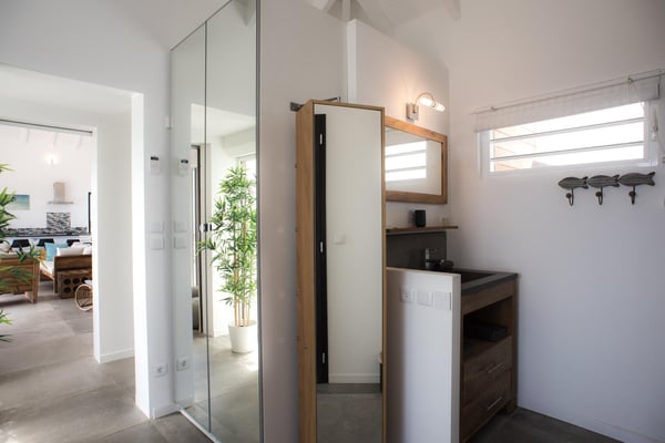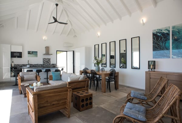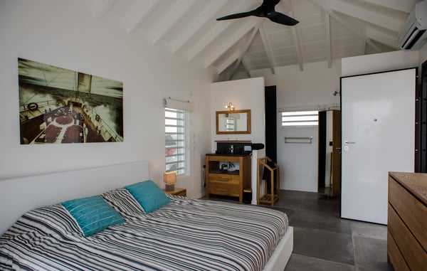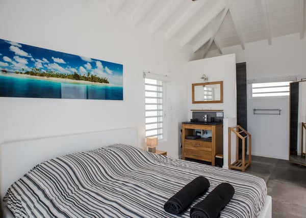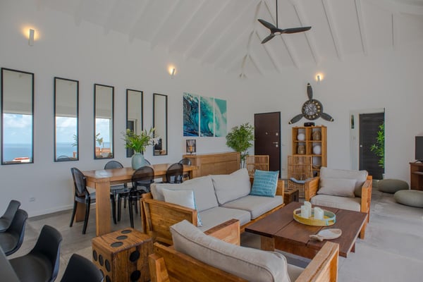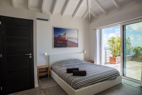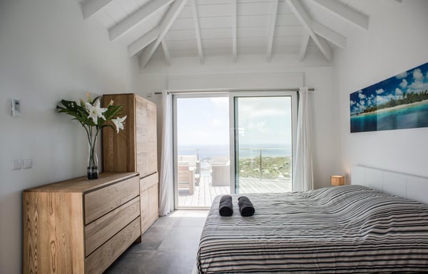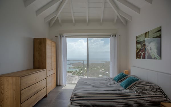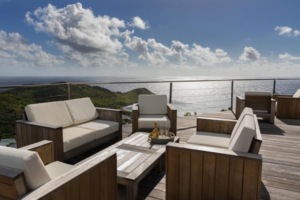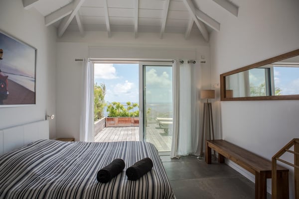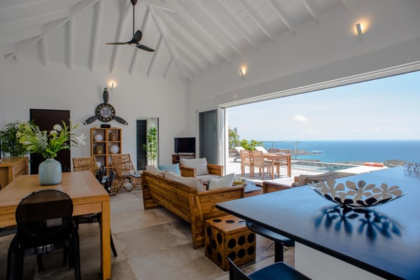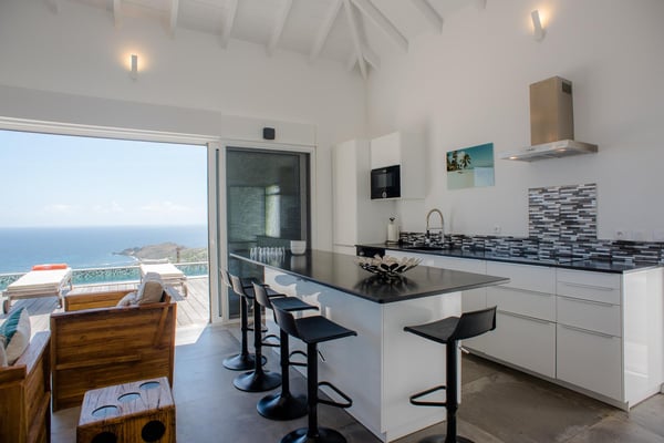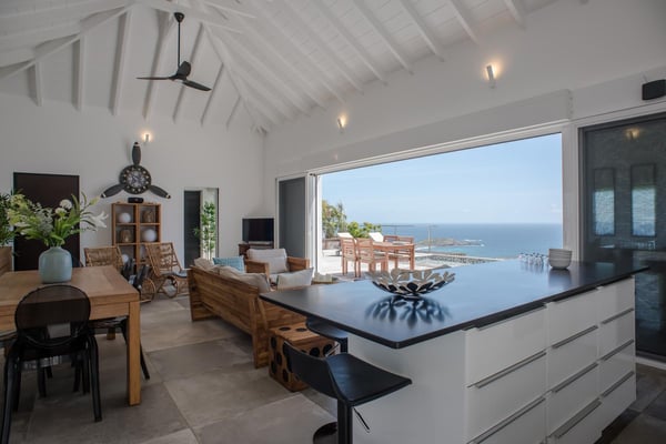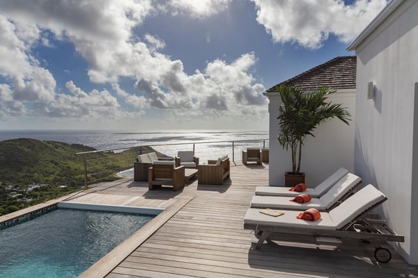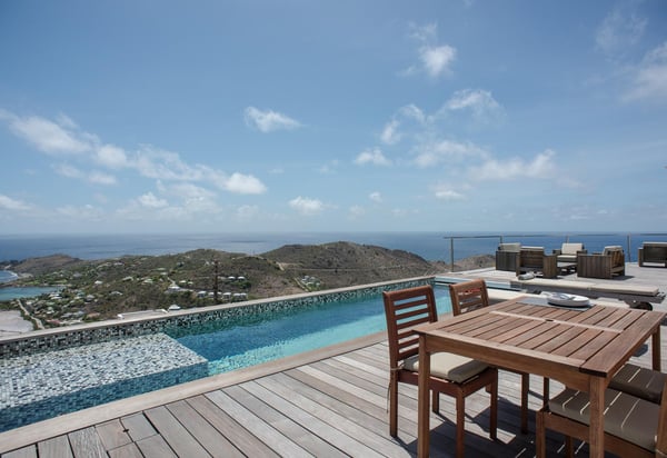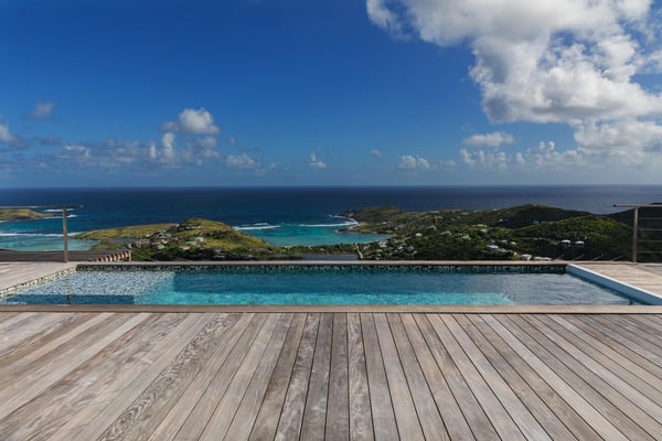 Located in Vitet in the quiet area of Dévé, the vacation rental villa La Vue offers a spectacular view over the Caribbean Sea and its turquoise waters. Comfortable and very functional, this luxurious three-bedroom property offers a high level of quality services for an unforgettable vacation in St. Barths with family or friends. The name of villa La Vue shows how beautiful the view is from the terrace and the house: La Vue is a small paradise on the island of St. Barths. The air-conditioned living room features a comfy sitting area with a sofa and armchairs in front of a large opening onto the terrace and the horizon. The indoor dining room which can accommodate six guests is located in the same open space under a high vaulted ceiling, in a charming maritime-inspired wooden decor. The black-and-white kitchen is set around a breakfast bar with six stools, and elegantly contrasts with the peaceful living room, providing a kind of originality to the whole. Comfortable and quiet, La Vue’s indoor living space is set around the sublime panorama. At the front of the villa, you’ll find a true idyllic scenery. The terrace is built on a large wooden deck around a lovely sparkling swimming pool. A cozy outdoor dining area with a parasol welcomes guests for dining alfresco in the gentle trade winds. Sundecks and an outdoor lounge are also on the terrace, a unique place to admire the glowing sunrises over the Caribbean Sea. The holiday rental Villa La Vue is composed of three very comfortable air-conditioned bedrooms. They are all furnished with king-size beds and have private bathrooms. Each bedroom opens onto the terrace with a stunning sea view. In this very private atmosphere, you’ll love breathing the mild air of St. Barths, whatever the time of day or night. Perfect for a family or a group of friends, the vacation home La Vue is a wonderful place for a dream getaway in St. Barths in front of a breathtaking panorama.
